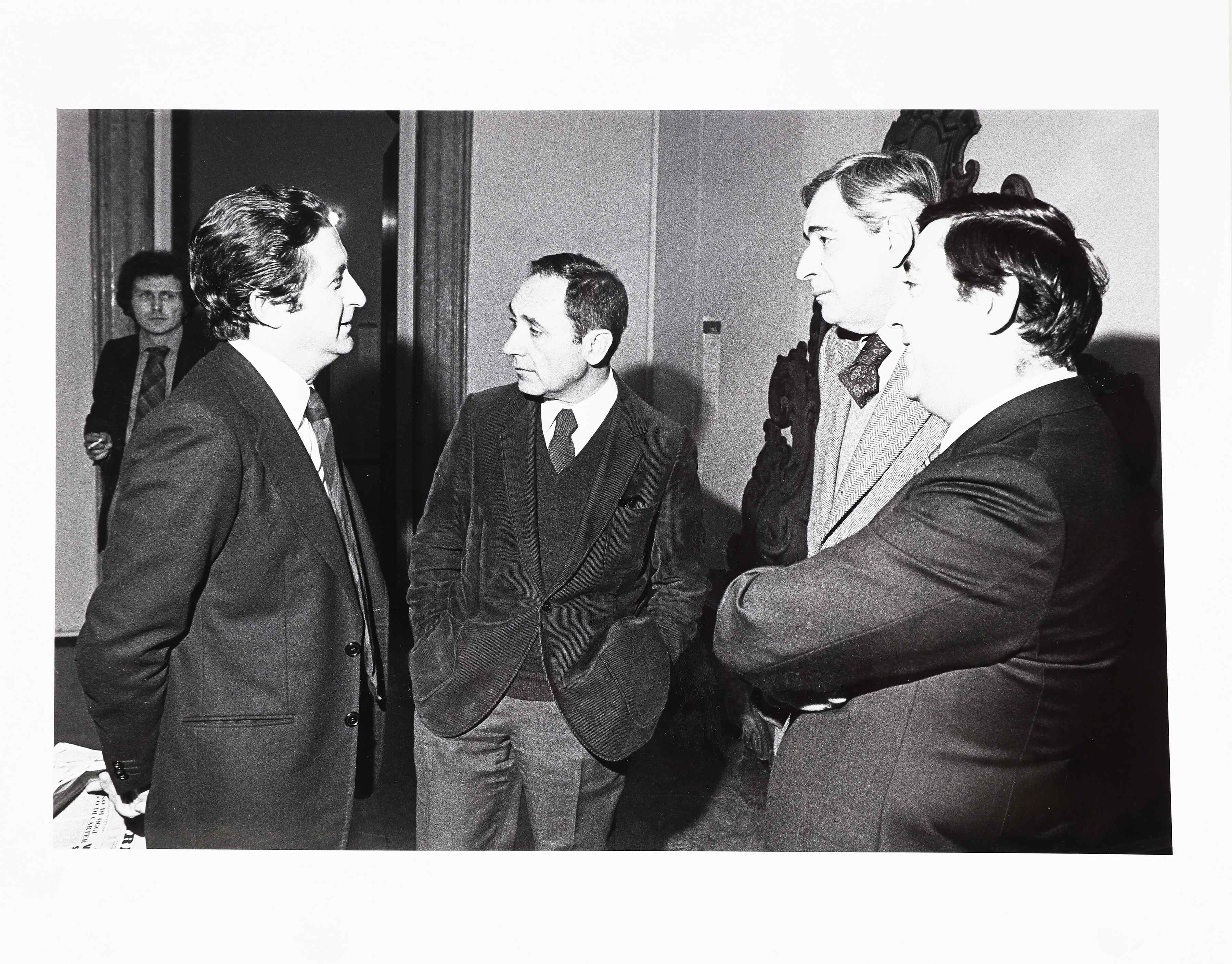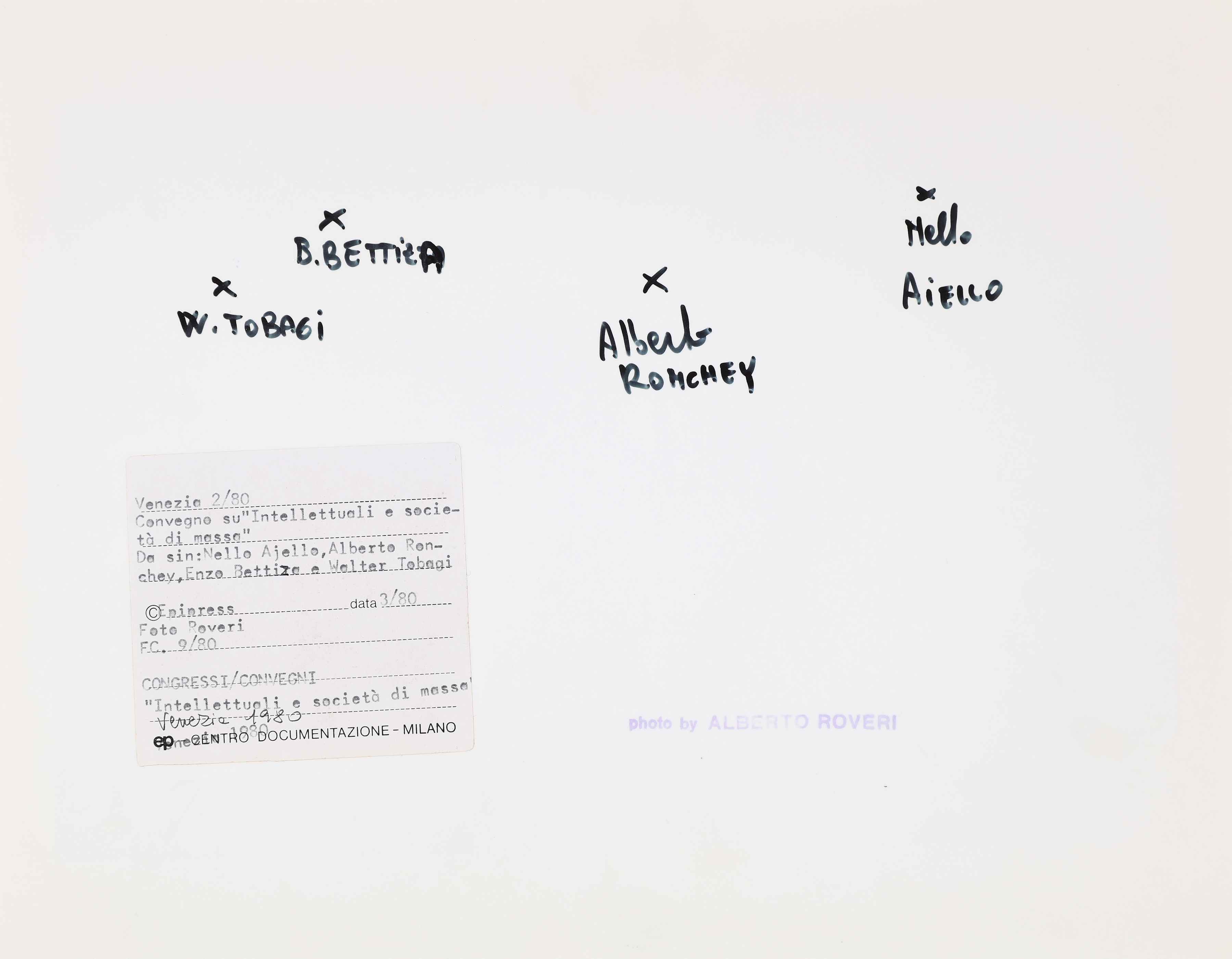 ROVERI ALBERTO (n. 1947) Walter Tobagi, Nello Ajello, Alberto Ronchey e Enzo Bettiza ad un convegno. 1980. Stampa alla gelatina d'argento. Cm 30,50 x 23,80. Al verso timbro con credito dell'artista e etichetta d'archivio con titolo e data.