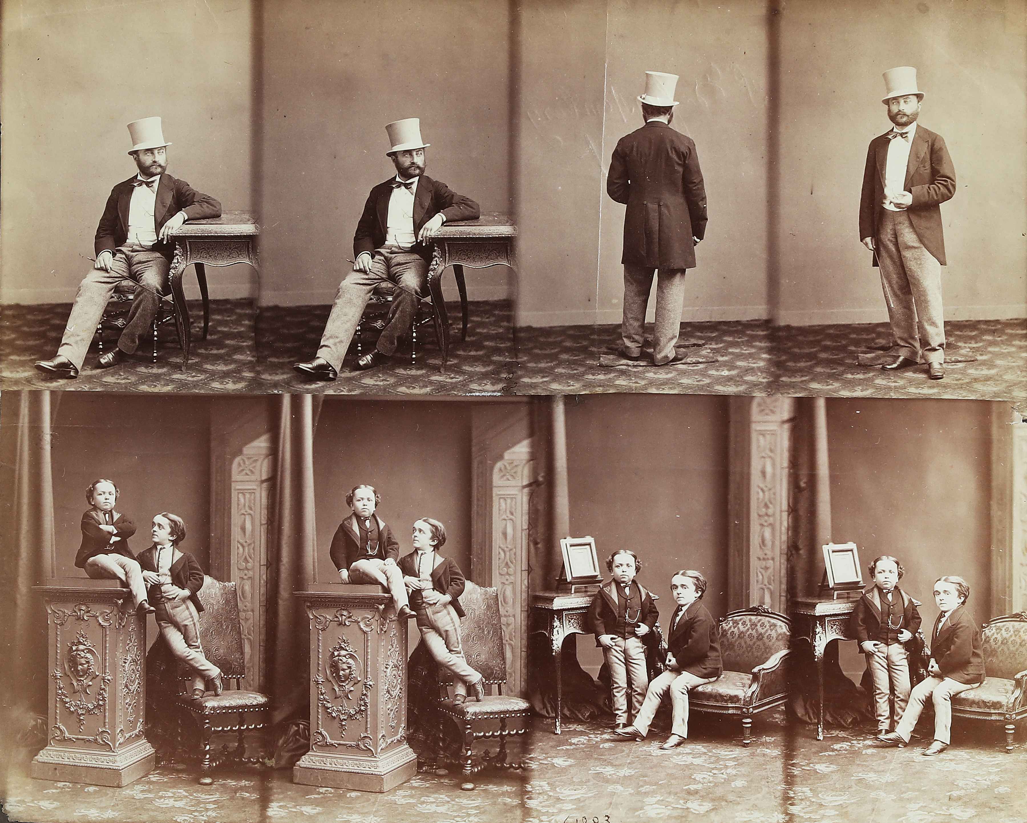 DISDERI ANDRE' EUGENE ADOLPHE (1819 - 1889) Ritratto maschile e coppia di nani. Stampa all'albumina. Cm 23,00 x 19,60. 2 diverse tavole non tagliate, di 4 carte de visite ciascuna, numerate in negativo. 1860-1865 circa.