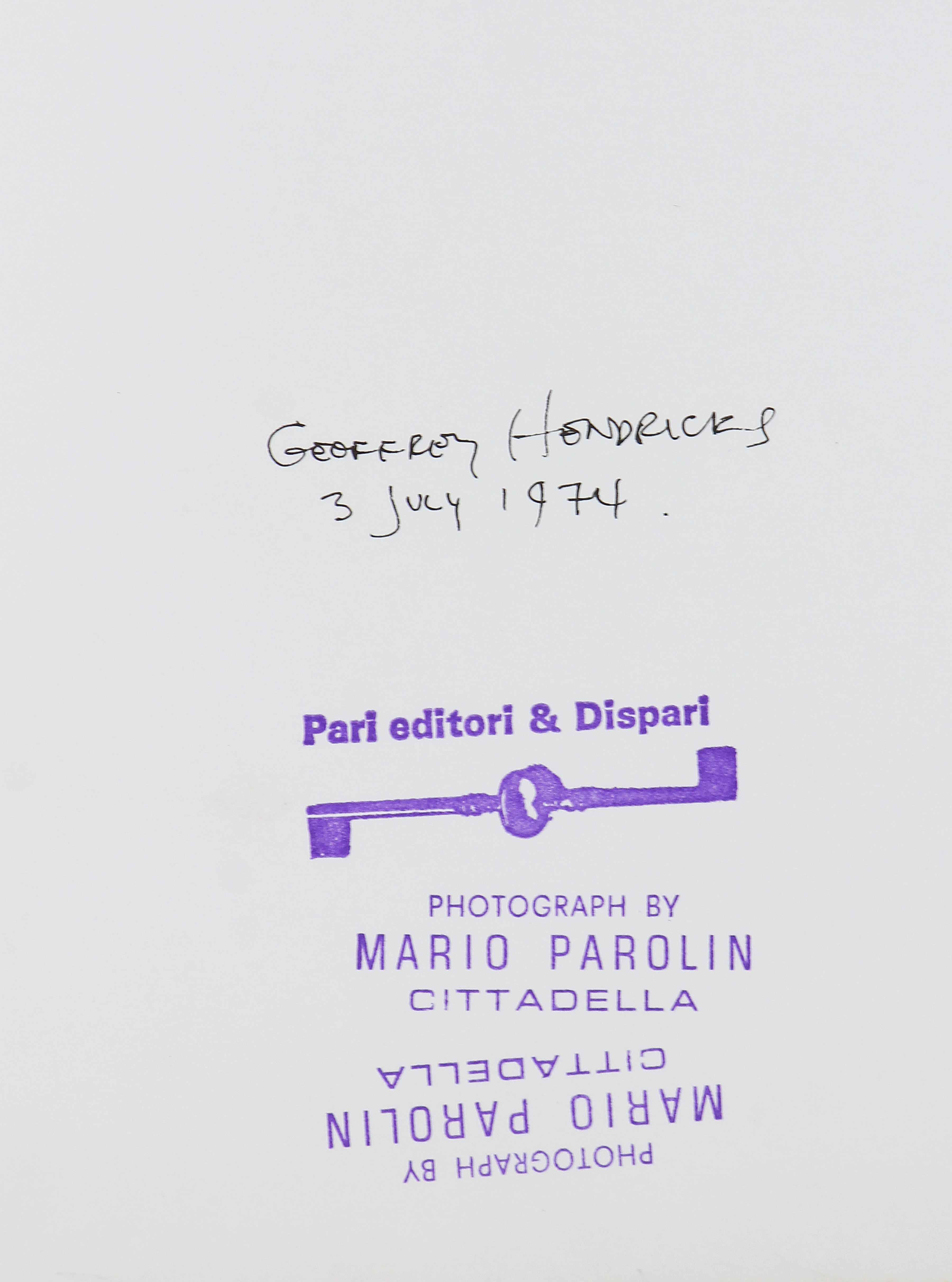 HANDRICKS GEOFFREY (n. 1931) Performance. (4 fotografie). Stampa alla gelatina d'argento. Cm 40,00 x 30,00. Bibliografia "Geoffrey Hendricks: Between two points" Francesco Conz Archive & editions Verona Pari & Dispari editori. Firma e data dell'artista. Al retro credito del fotografo Mario Parolin