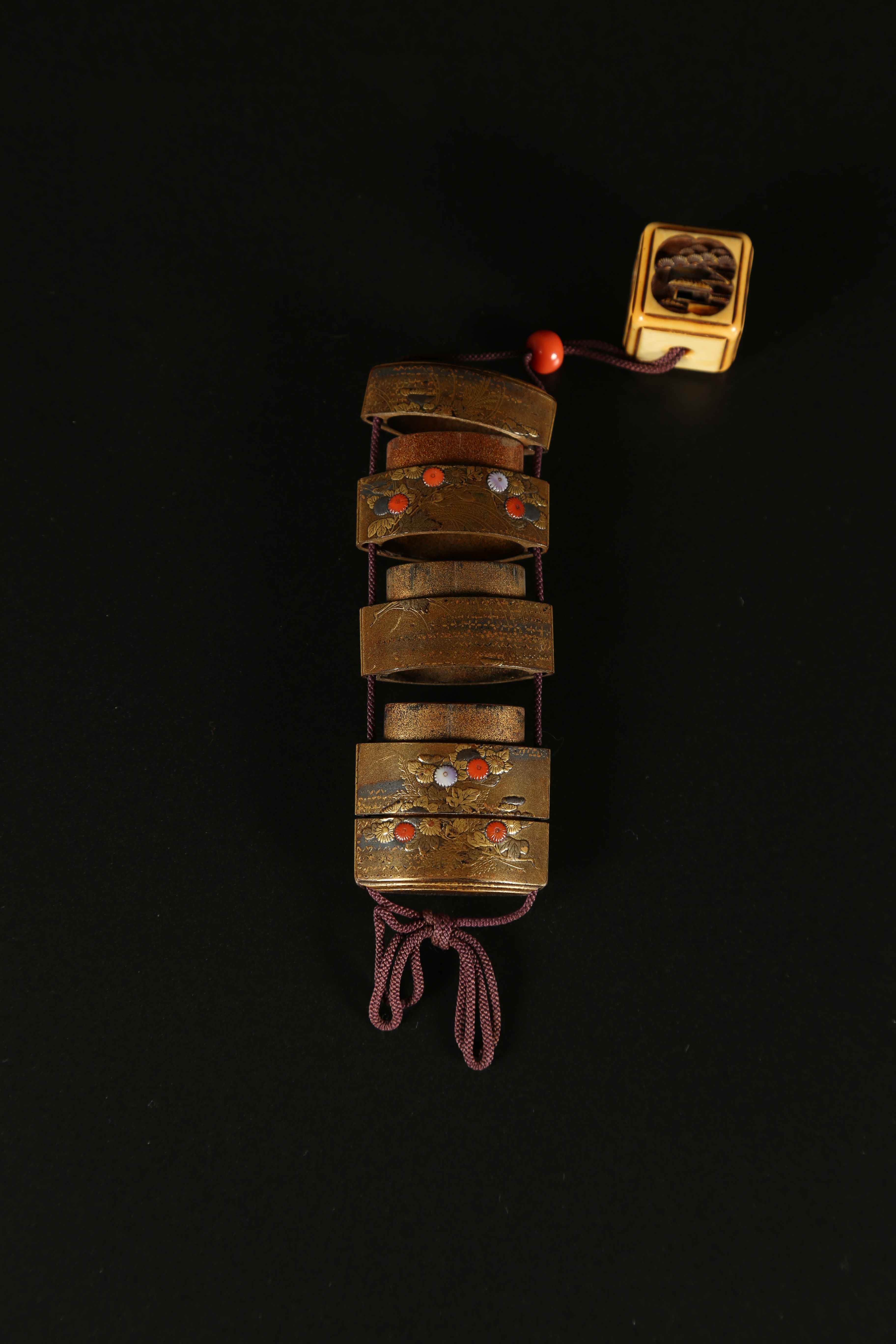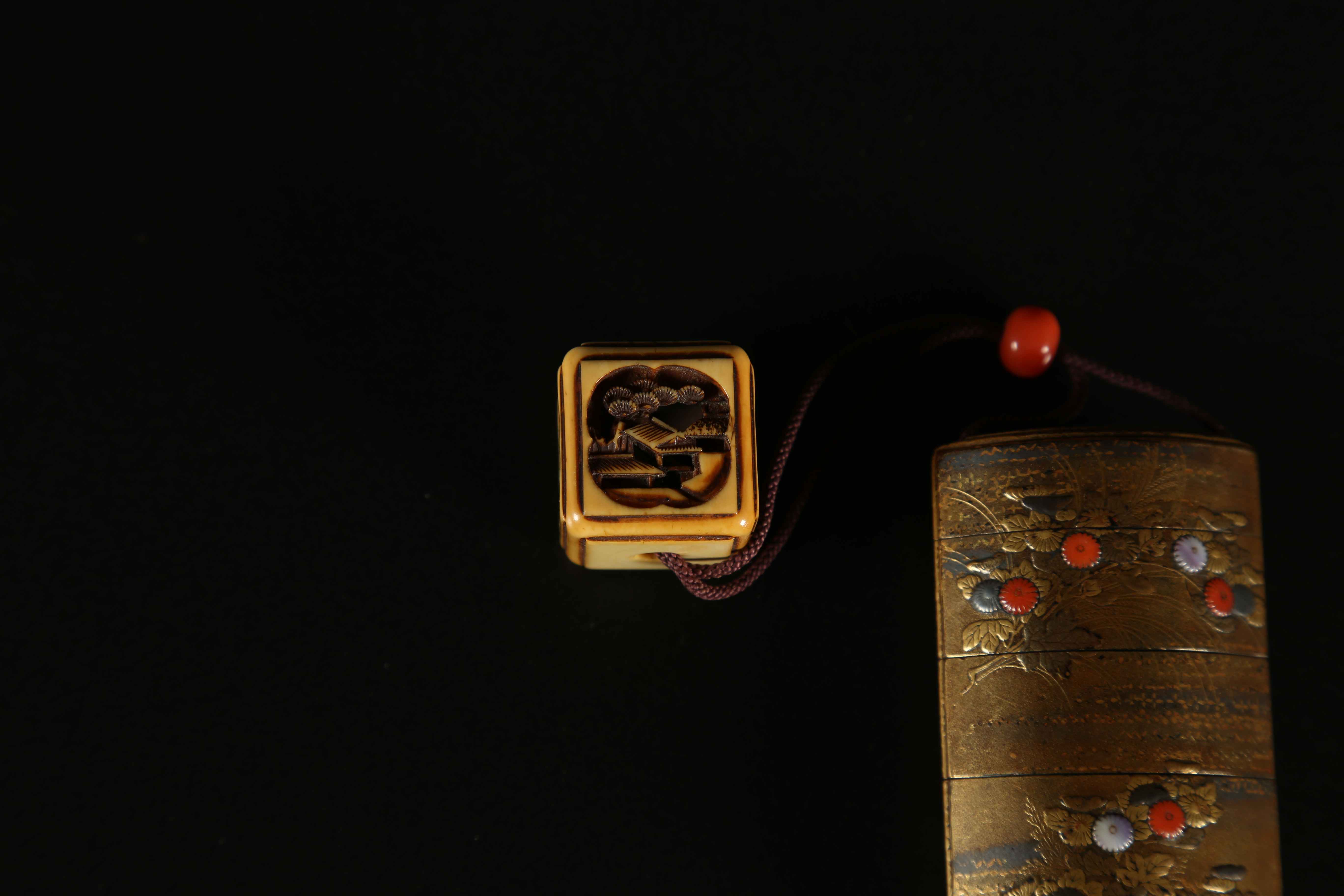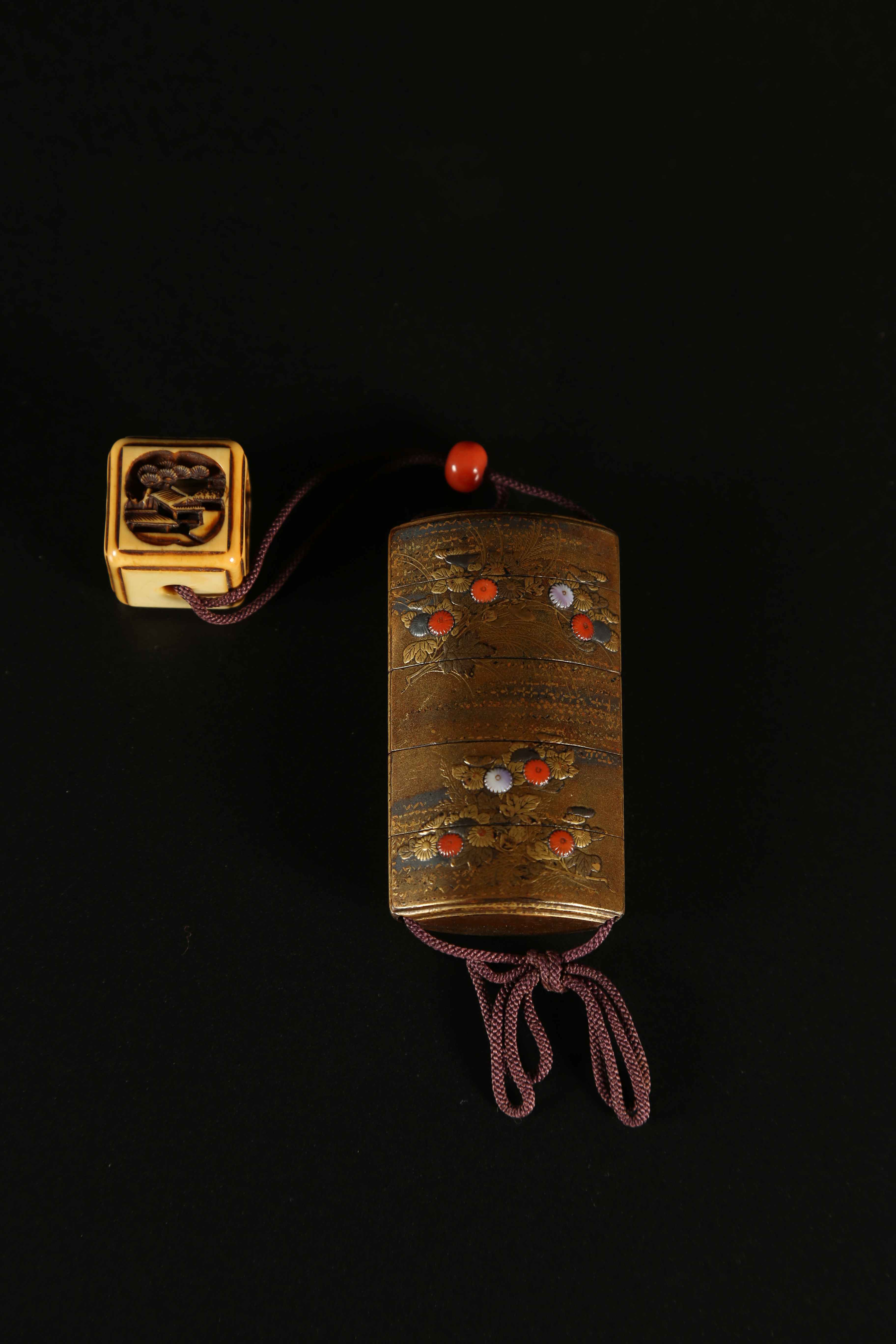 Arte Giapponese Inro Giappone, periodo Edo 1603 - 1867, XIX secolo Legno laccato, dorato e decorato con la tecnica della pittura cosparsa piatta . -. Cm 4,00 x 7,00. Scatola porta sigillo composta da quattro scomparti decorati in lacca dorata con intarsi in madreperla e rosso corallo a motivo vegetale e di crisantemi. Il finale è costituito da un netsuke quadrato intagliato in avorio, decorato con intarsi di padiglioni tra i pini.