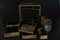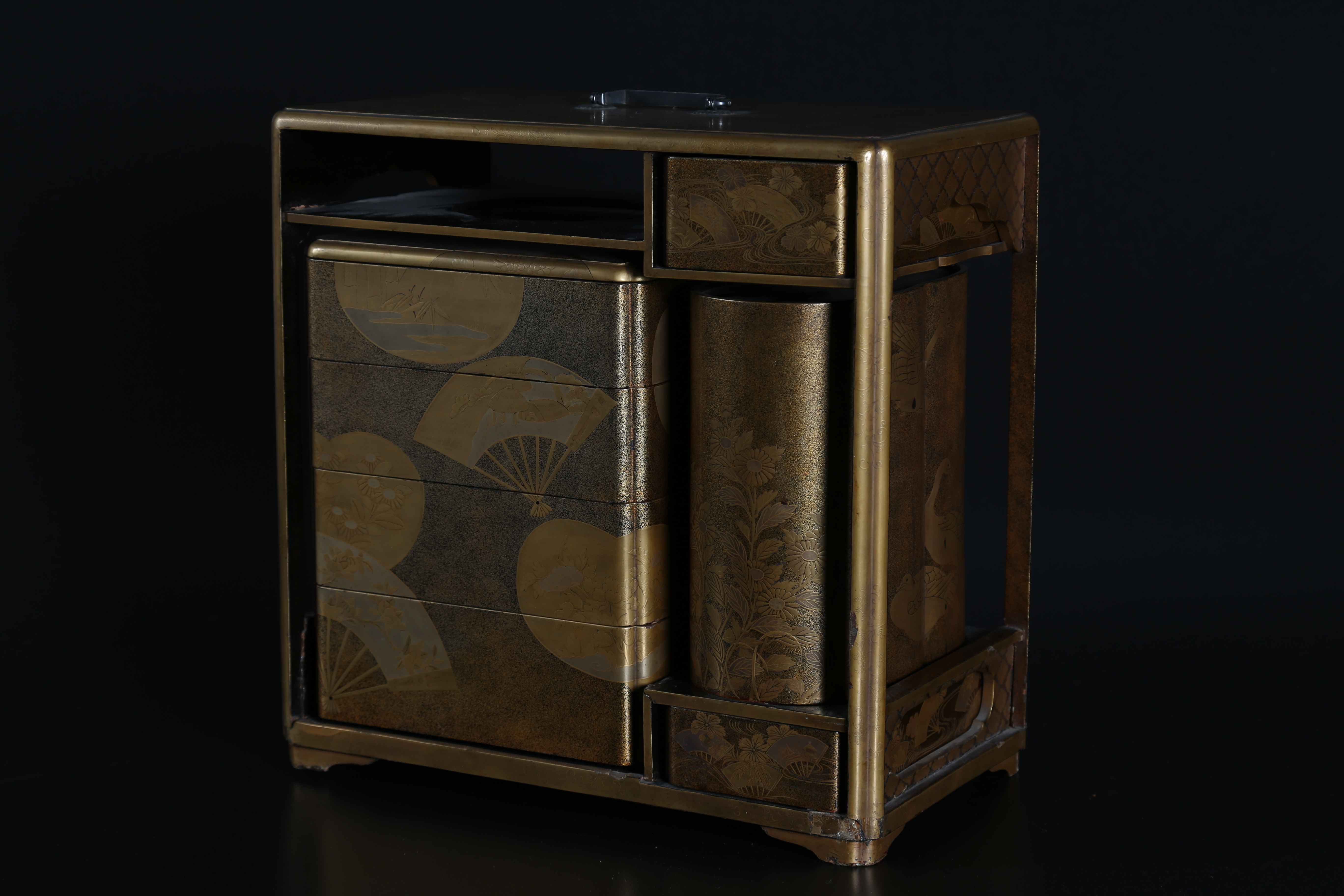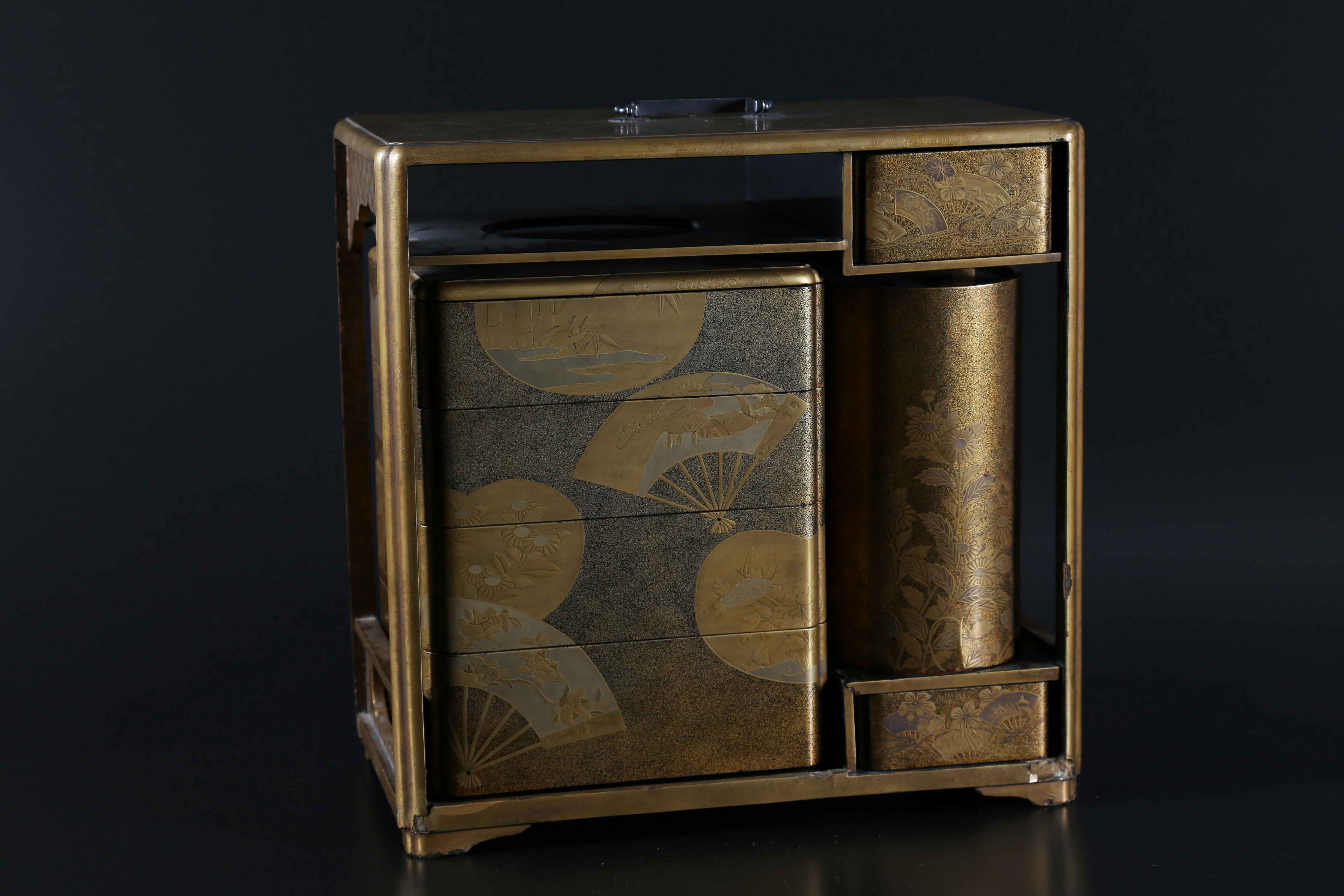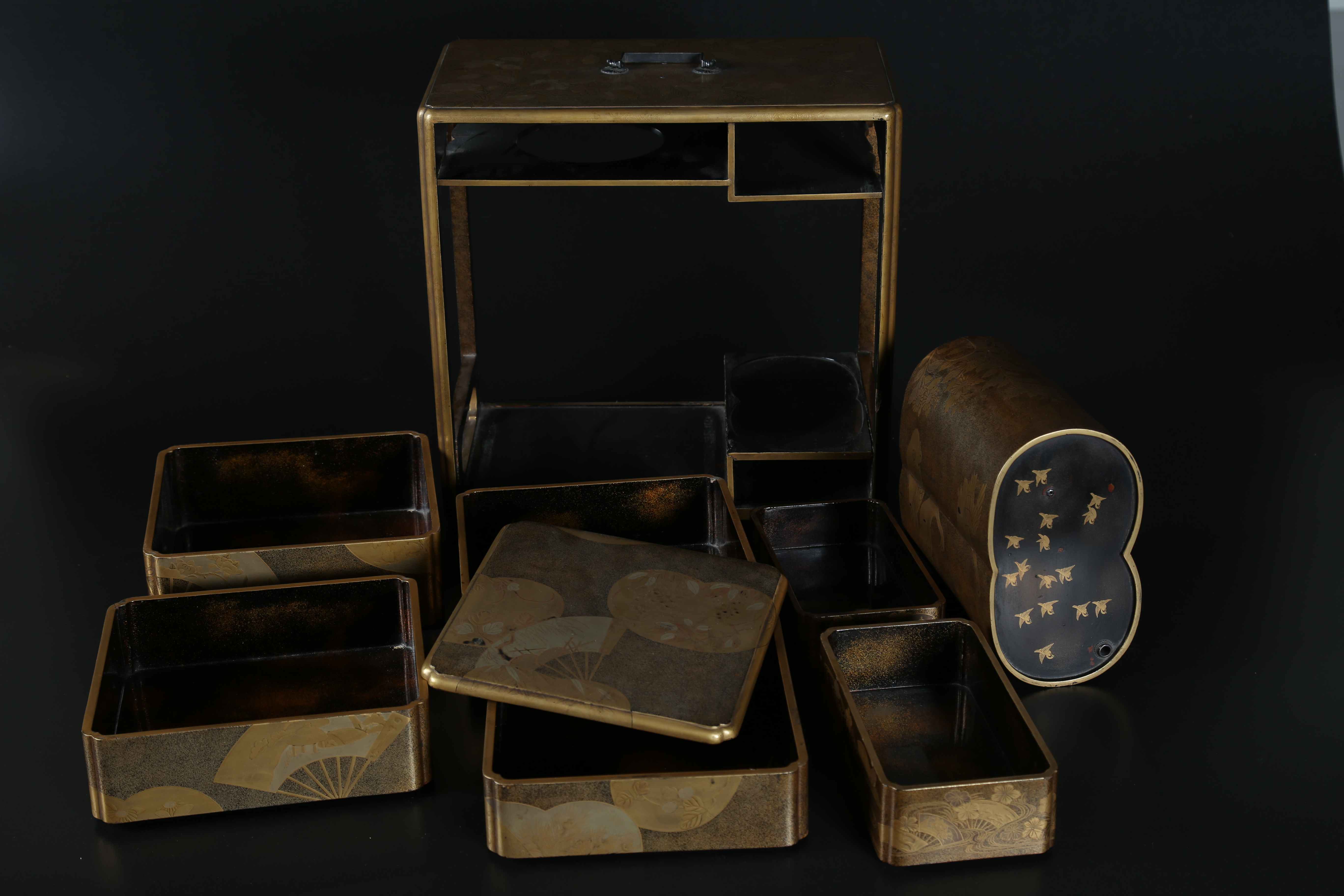 Arte Giapponese Set da picnic (Sagejubako) con decorazione a motivo di ventagli pieghevoli Giappone, periodo Edo 1603 - 1867, prima metà XIX secolo Legno laccato dorato . -. Cm 34,00 x 33,30 x 19,00. Servizio da picnic composto da un doppio flacone da saké con decoro di anatre e crisantemi, due vassoi, una scatola porta cibo composta da scomparti impilabili, tutto decorato con motivo di ventagli pieghevoli ed inserito all'interno di un telaio abbellito da simili motivi. Manca il vassoio nell'area superiore destra.
