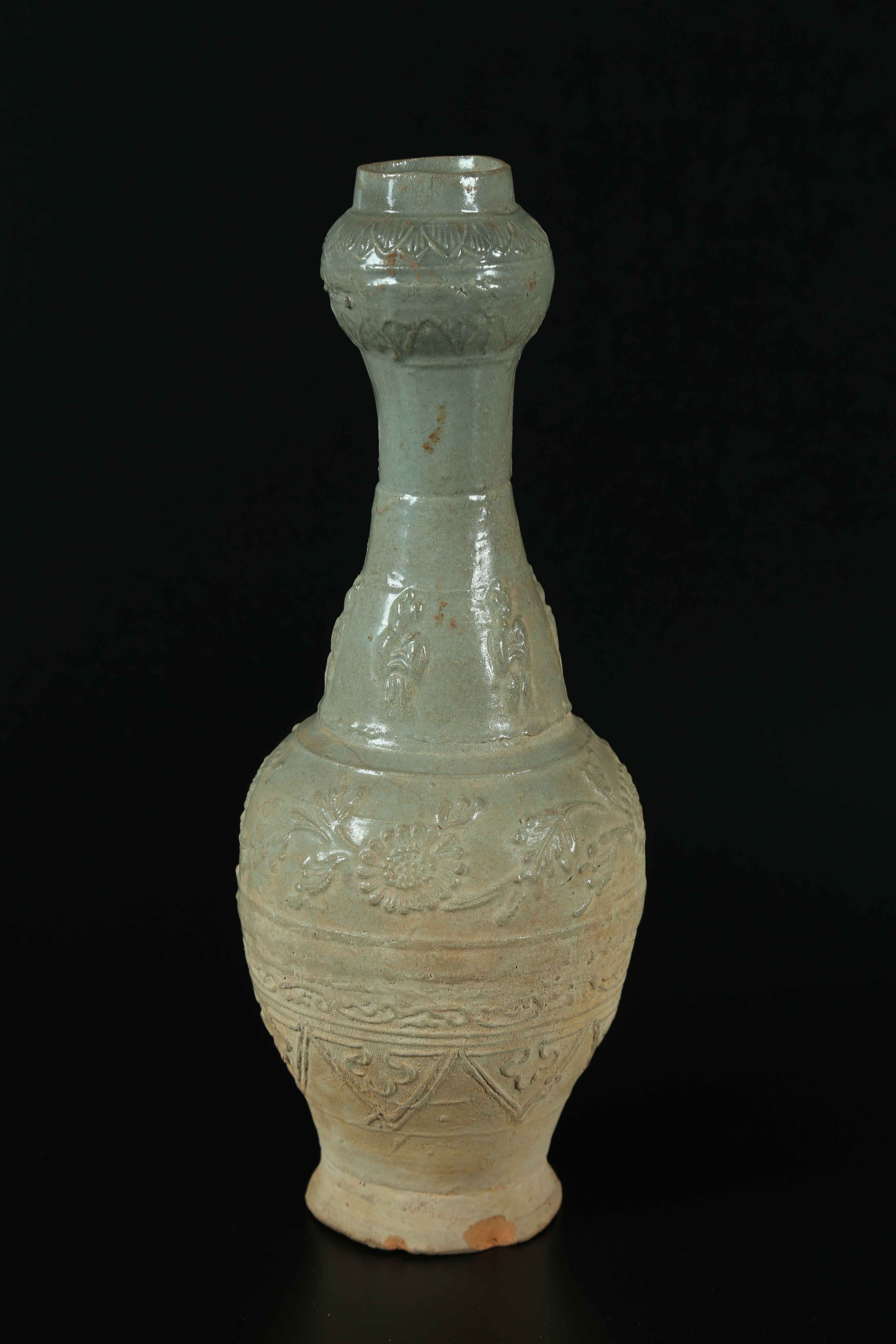 Arte Cinese Vaso funerario Song in terracotta invetriata Cina, dinastia Song. -. Cm 7,00 x 28,30. Vaso poggiante su disco, decorato con motivo floreale sulla spalla e con piccoli personaggi stilizzati alla base del collo, terminante con testa d'aglio decorata a motivo fitoforme e con stretta bocca cilindrica. Una vetrina verde grigio ricopre la parte superiore dell'oggetto. Anfore di questo tipo venivano aggiunte al corredo funerario per contenere sementi che dovevano accompagnare il defunto nel suo viaggio. Tappo mancante.