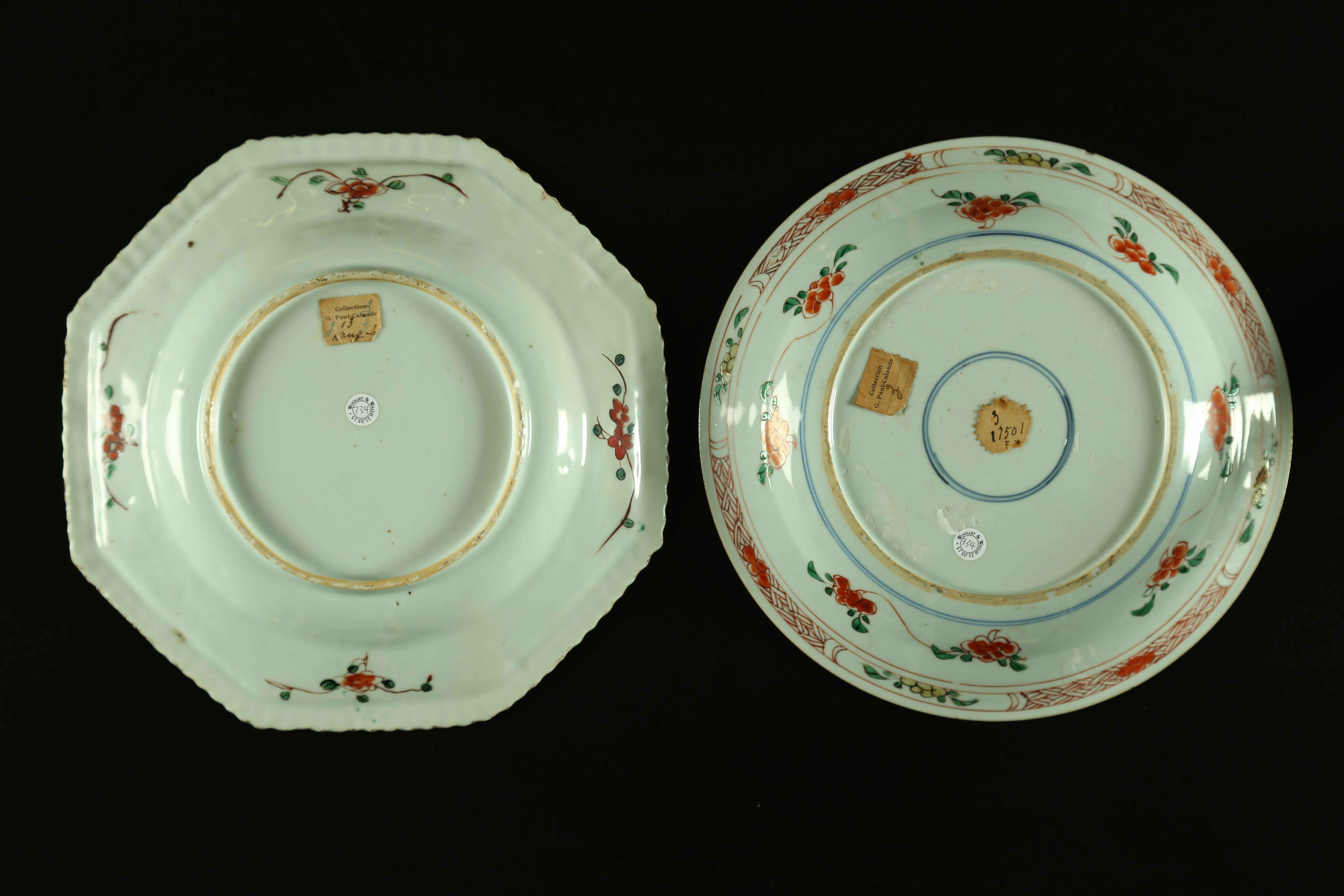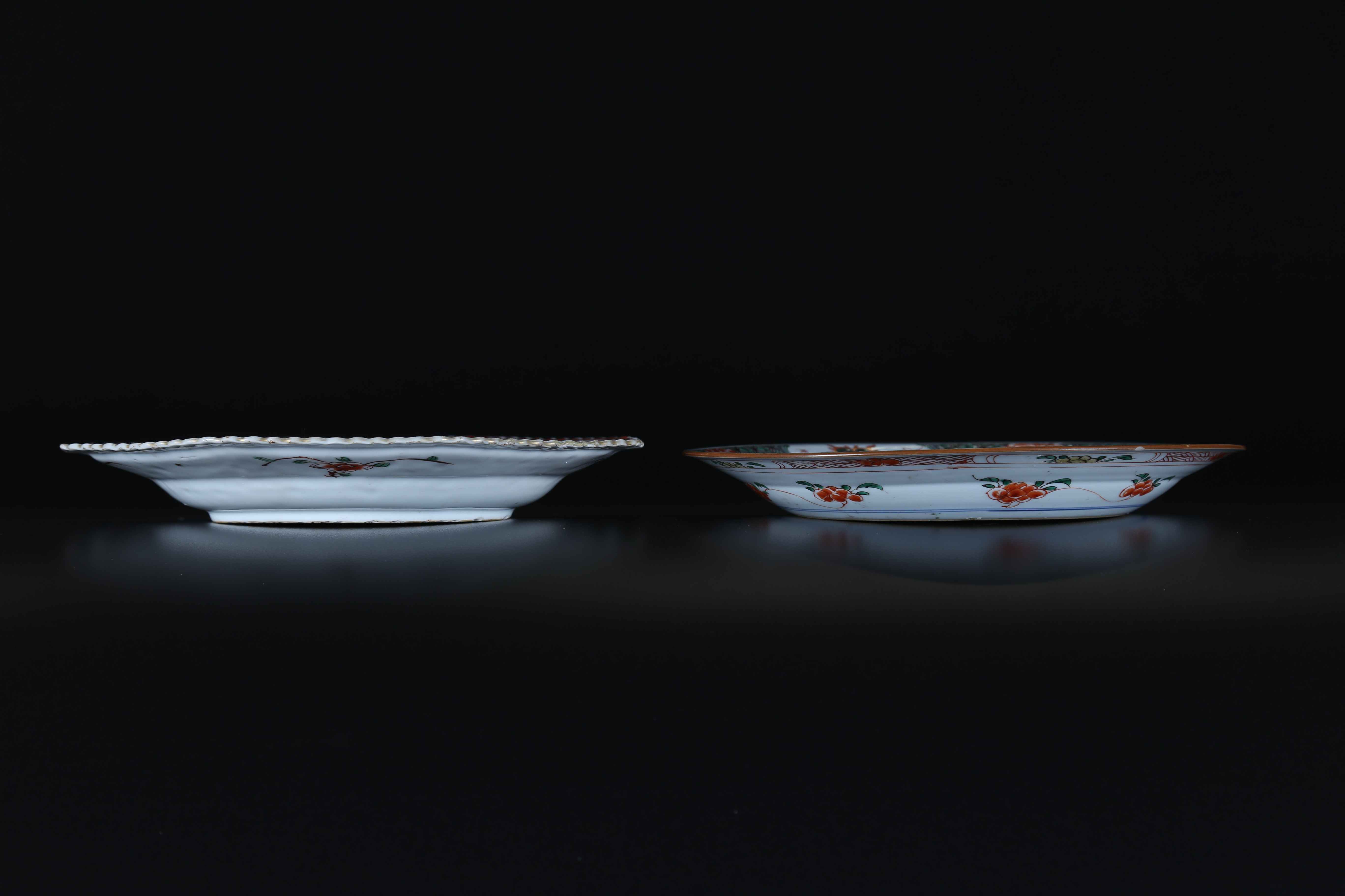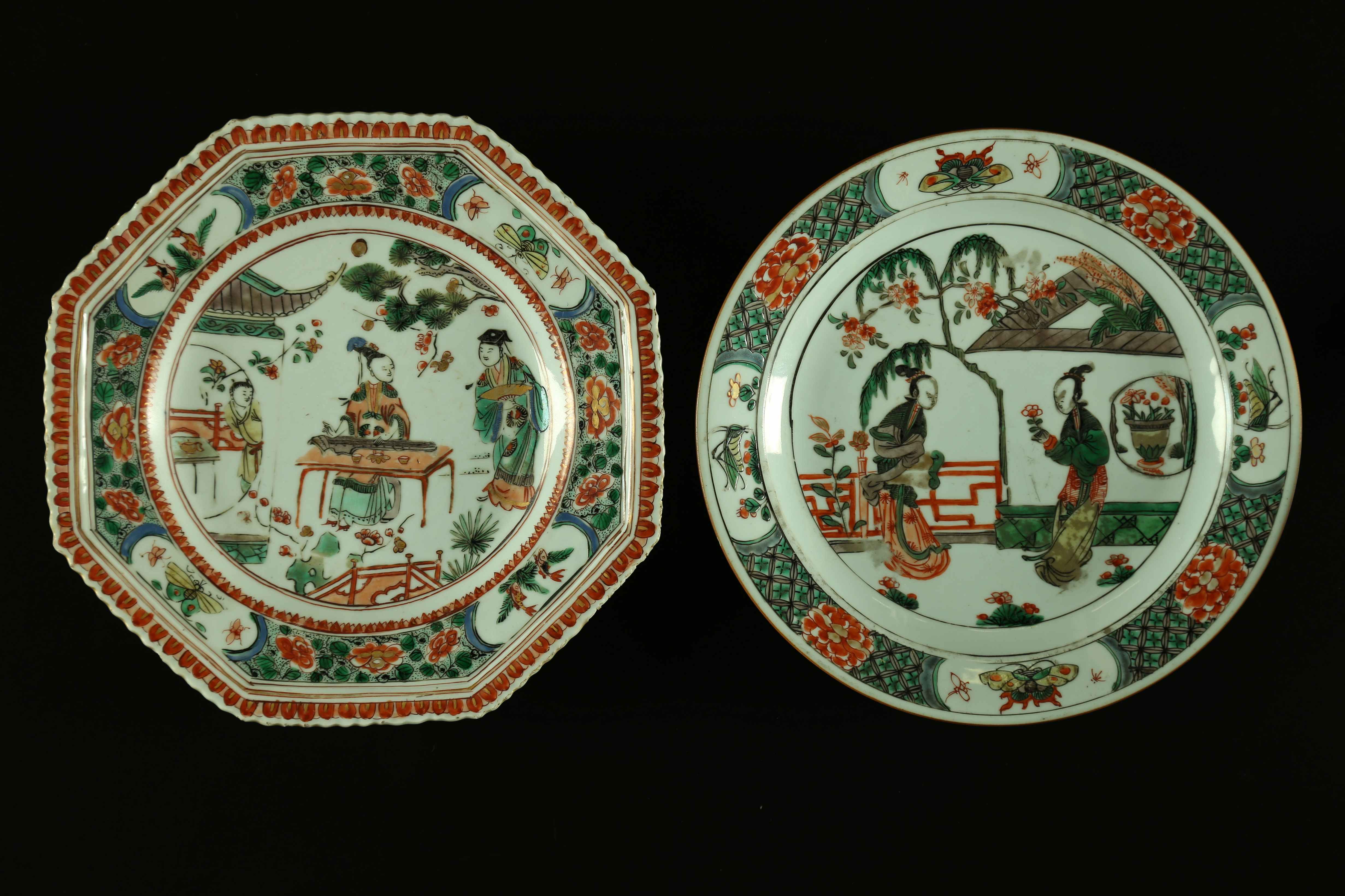 Arte Cinese Coppia di piatti in porcellana famiglia verde con personaggi Cina, dinastia Qing, periodo Kangxi, 1661 - 1722. . Cm 25,00. L'uno poligonale dipinto, smaltato e dorato con decoro centrale di personaggi in esterno, floreale sulla tesa con riserve di animali dal significato benaugurale. L'altro circolare (diam. 23,5 cm) con la stessa tipologia di decoro, reca marchio a doppio cerchio dell'imperatore Kangxi.