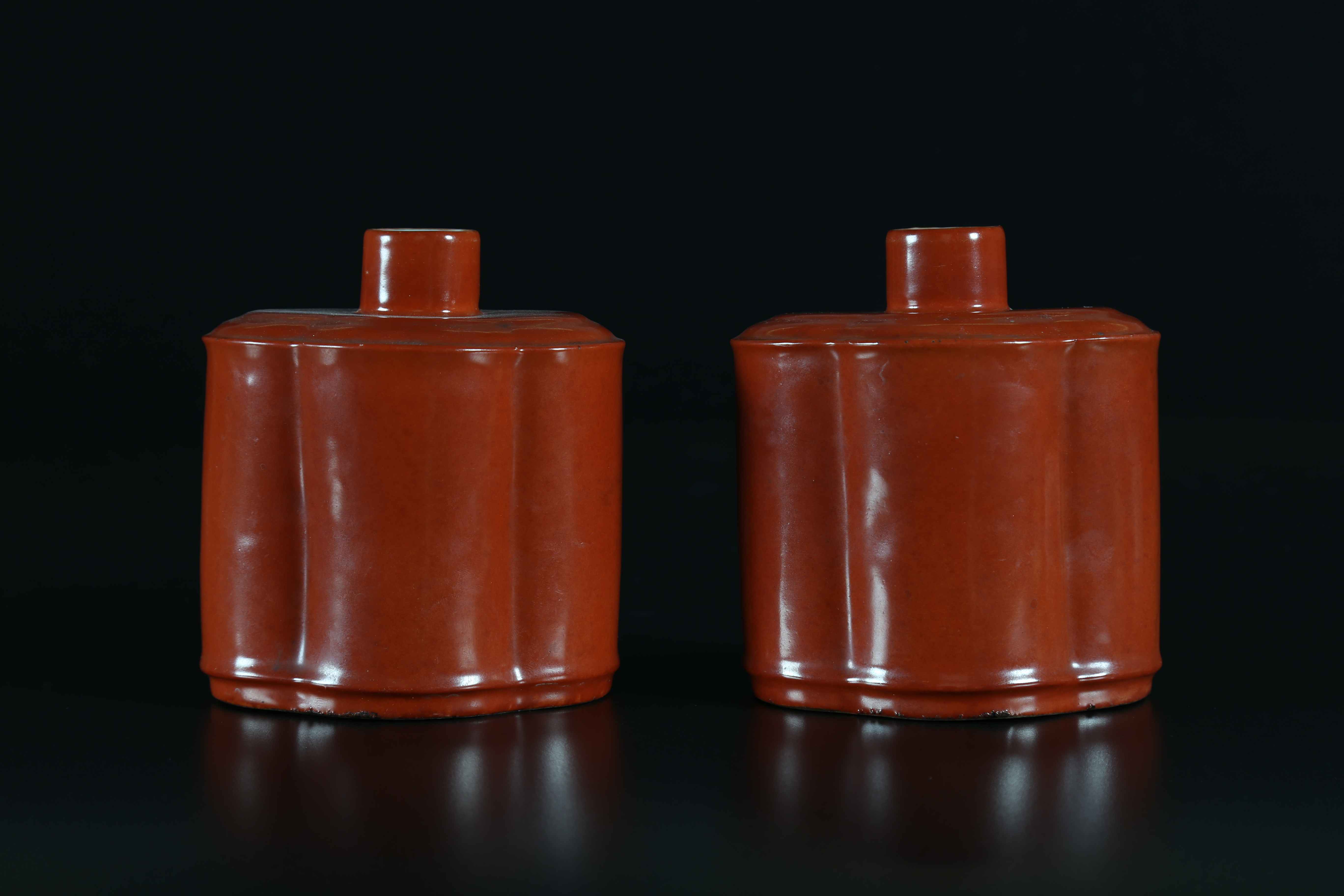 Arte Cinese Coppia di bottiglie lobate in porcellana smaltata color corallo...