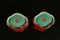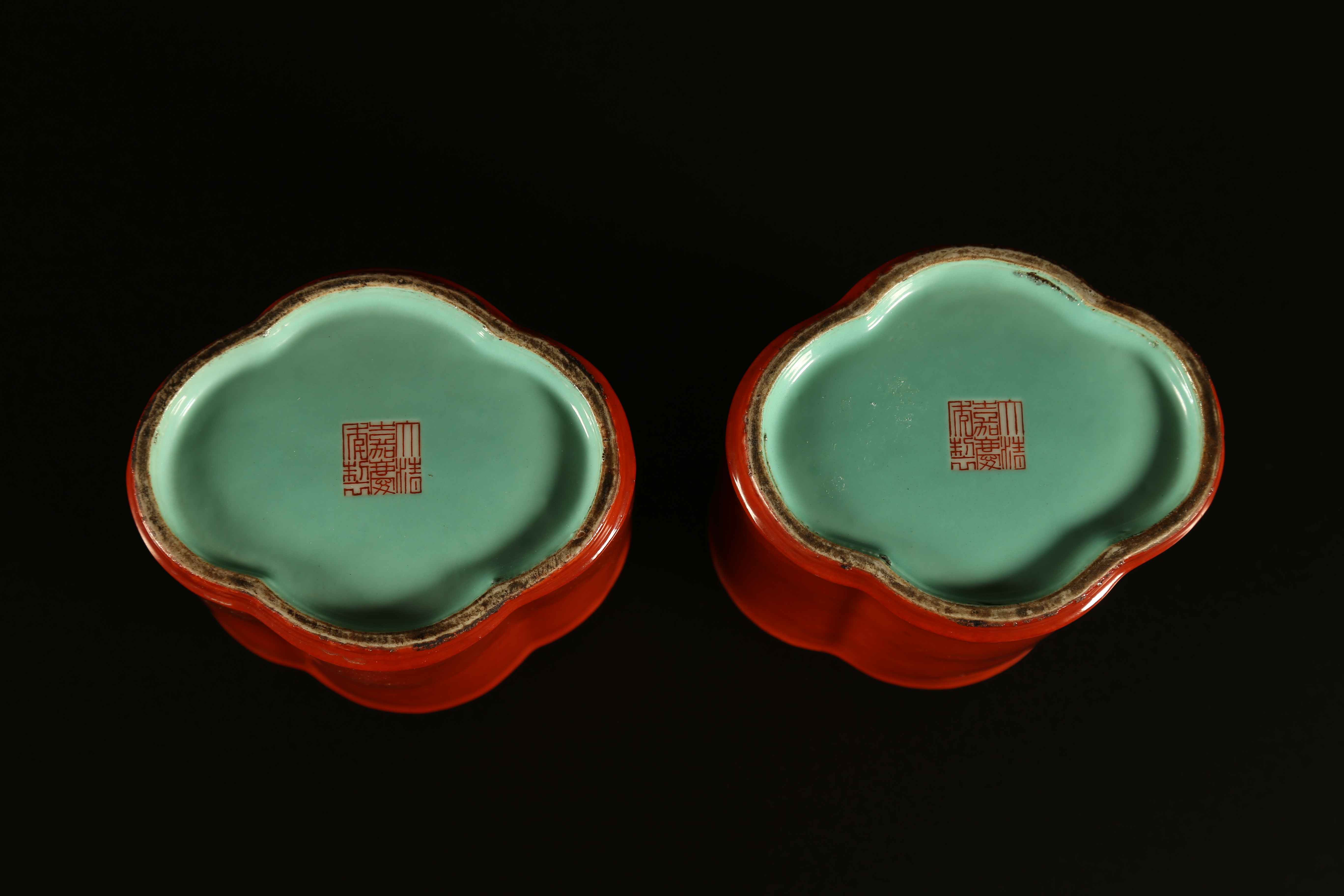 Arte Cinese Coppia di bottiglie lobate in porcellana smaltata color corallo marcate Jiaqing Cina, dinastia Qing, periodo Jiaqing, 1796 - 1820. . Cm 14,00 x 16,50. Coppia di bottiglie senza tappo con interno e base color turchese, la base reca altresì il marchio a sei caratteri Jiaqing