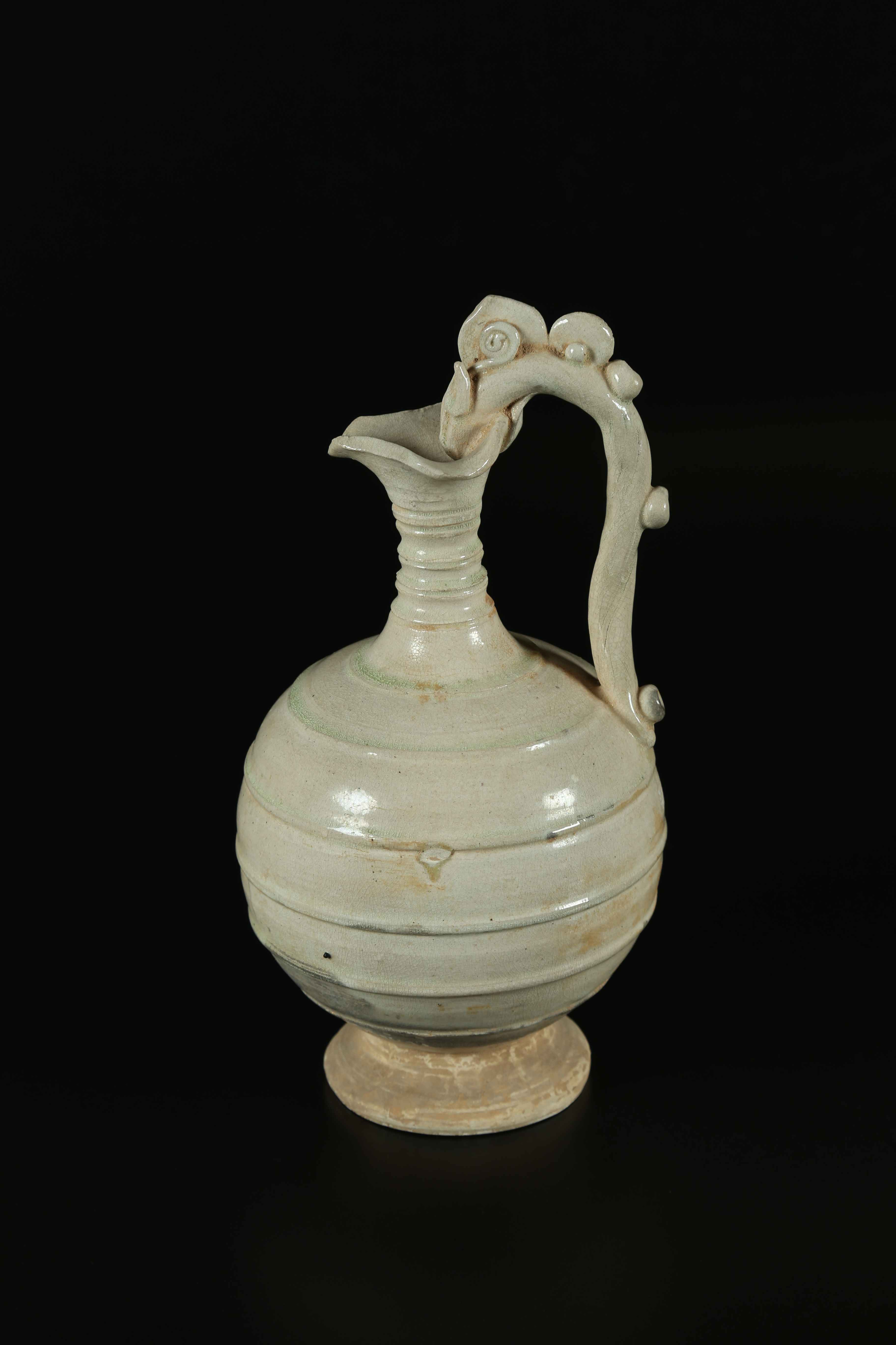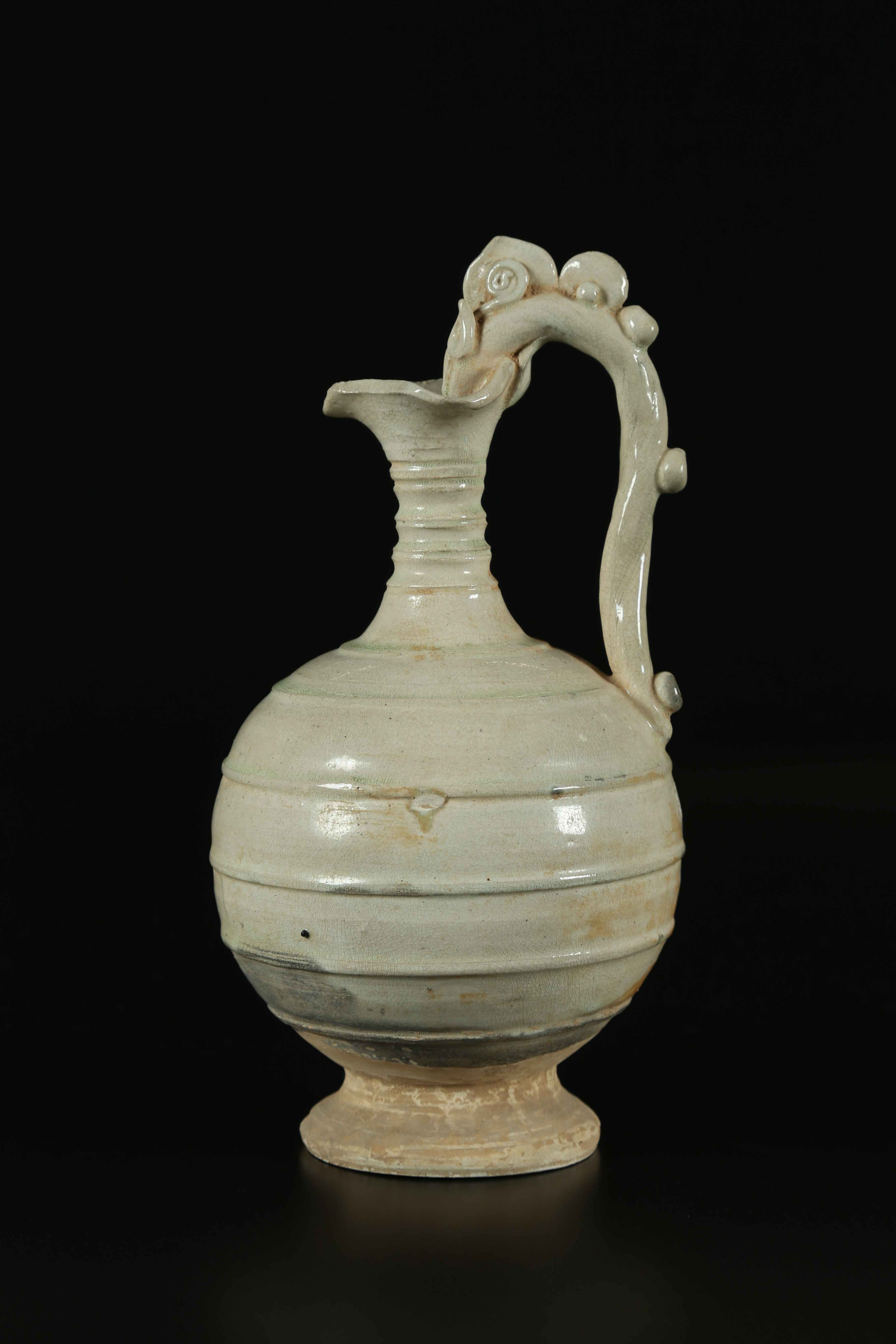 Arte Cinese Brocca invetriata bianca Song Cina, dinastia Song. -. Cm 26,80. Poggiante su disco, ampio corpo globulare e stretto collo modellato terminante con svasatura. L'oggetto mostra un'ansa sagomata a forma di drago.