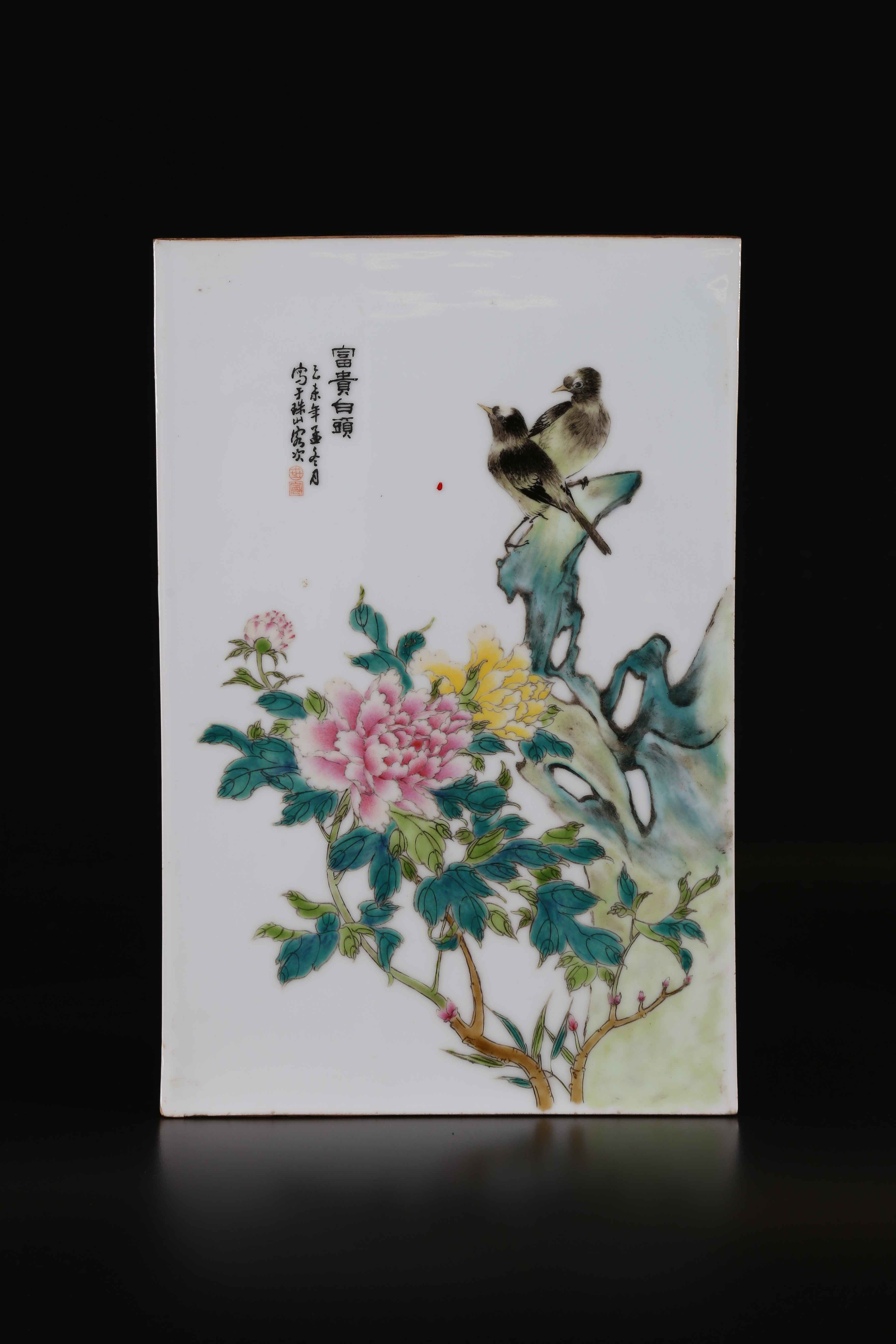 Arte Cinese Mattonella in porcellana raffigurante una peonia Cina, inizio XX secolo. . Cm 25,50 x 38,50. Delicata mattonella raffigurante delle peonie ed una coppia di uccellini su rilievo roccioso. L'iscrizione sulla sinistra riporta un augurio di longevità e benessere.