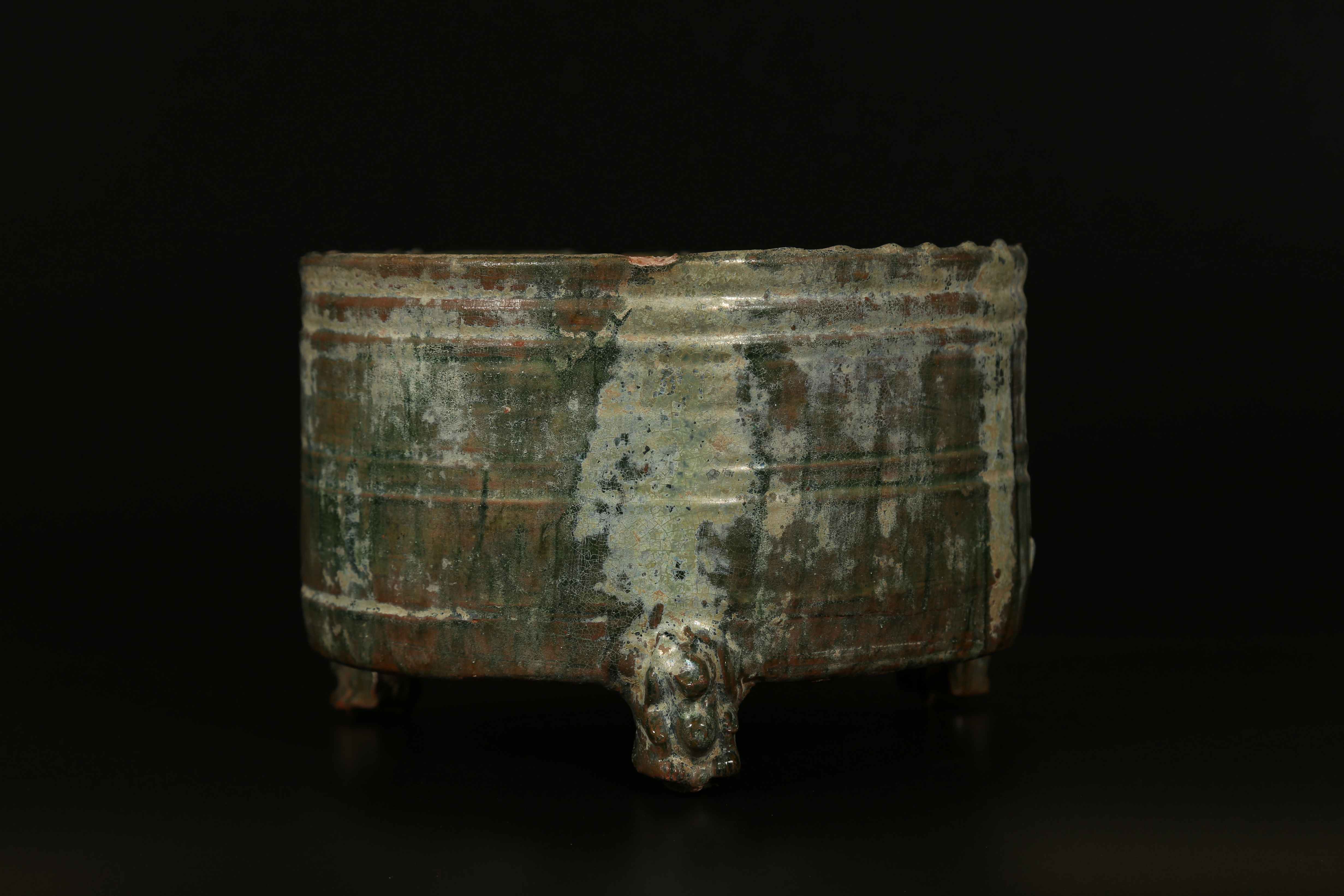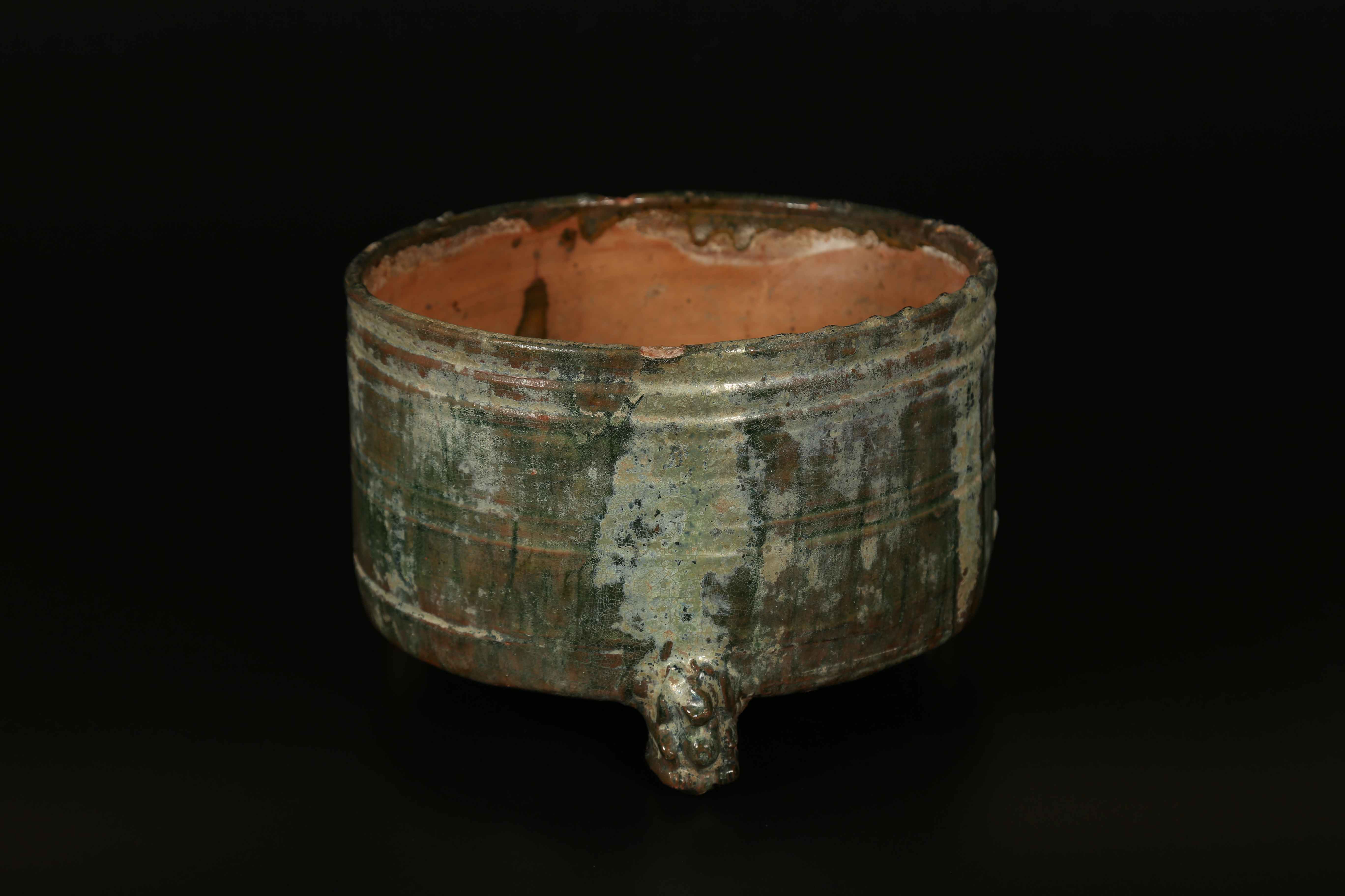 Arte Cinese Urna funeraria Han in terracotta invetriata Cina, dinastia Han. -. Cm 23,50 x 16,00. Contenitore cilindrico poggiante su tre piedini zoomorfi. L'esterno dell'oggetto è ricoperto di una vetrina verde ottenuta dall'ossido di rame, un colore particolarmente popolare durante il periodo Han.