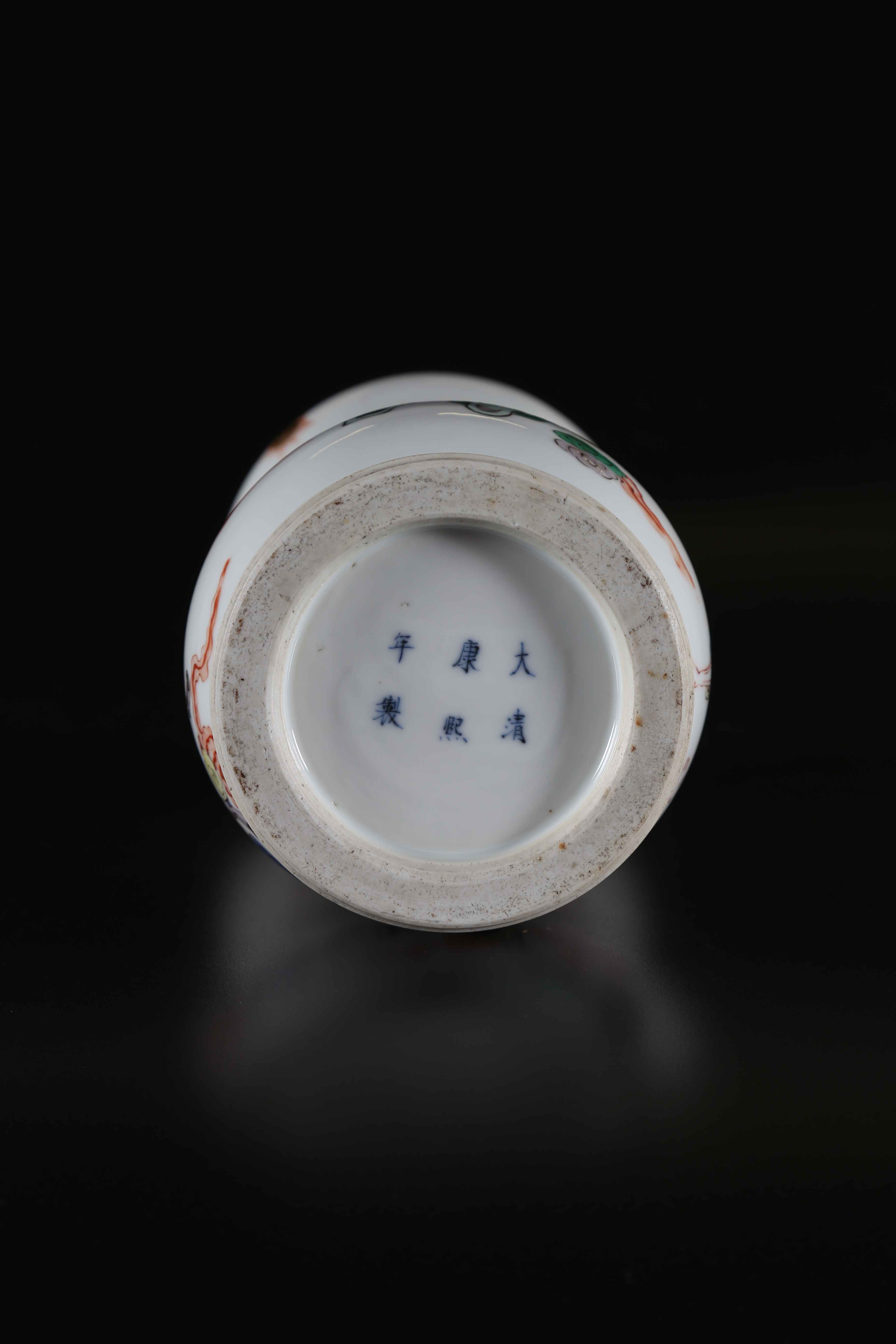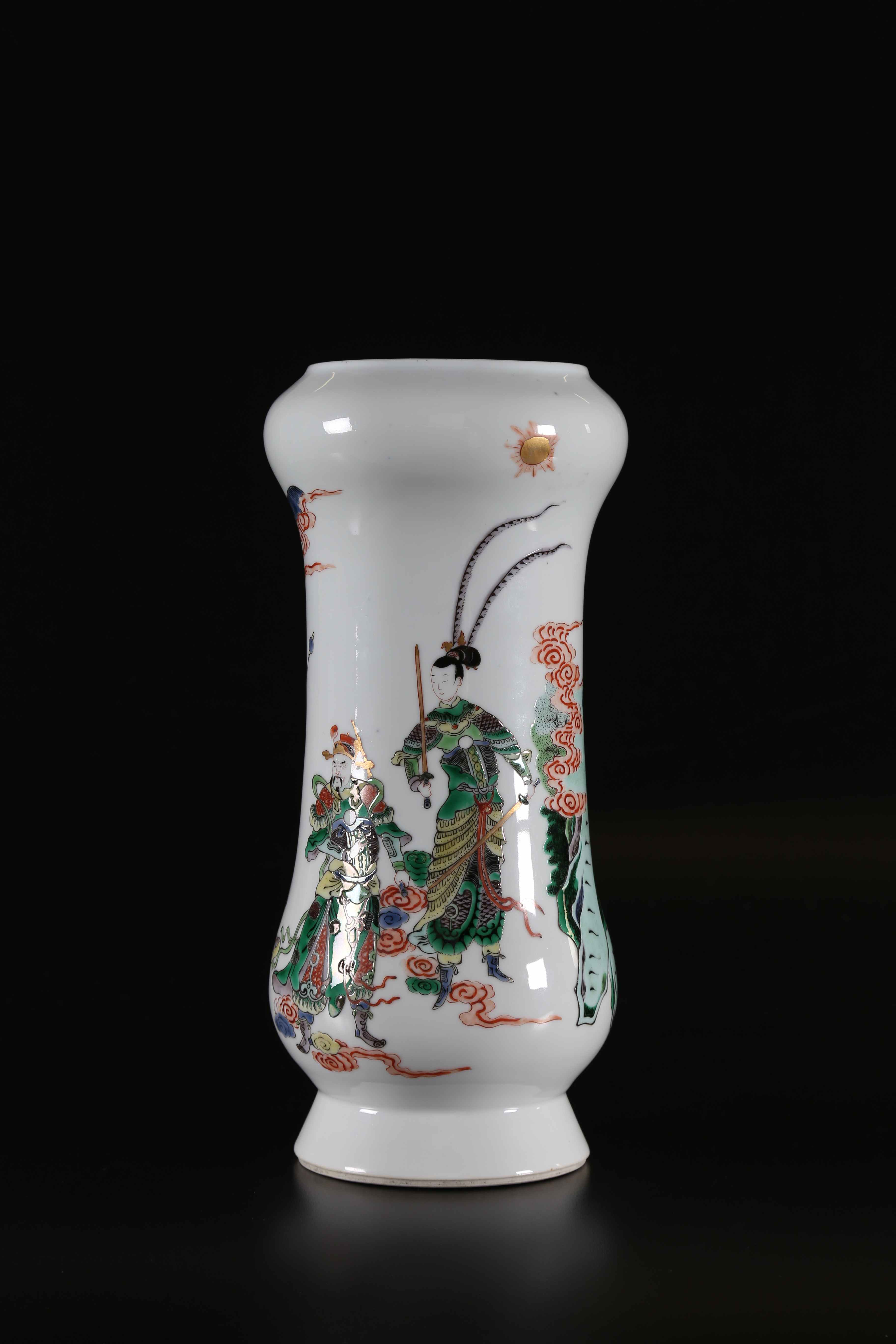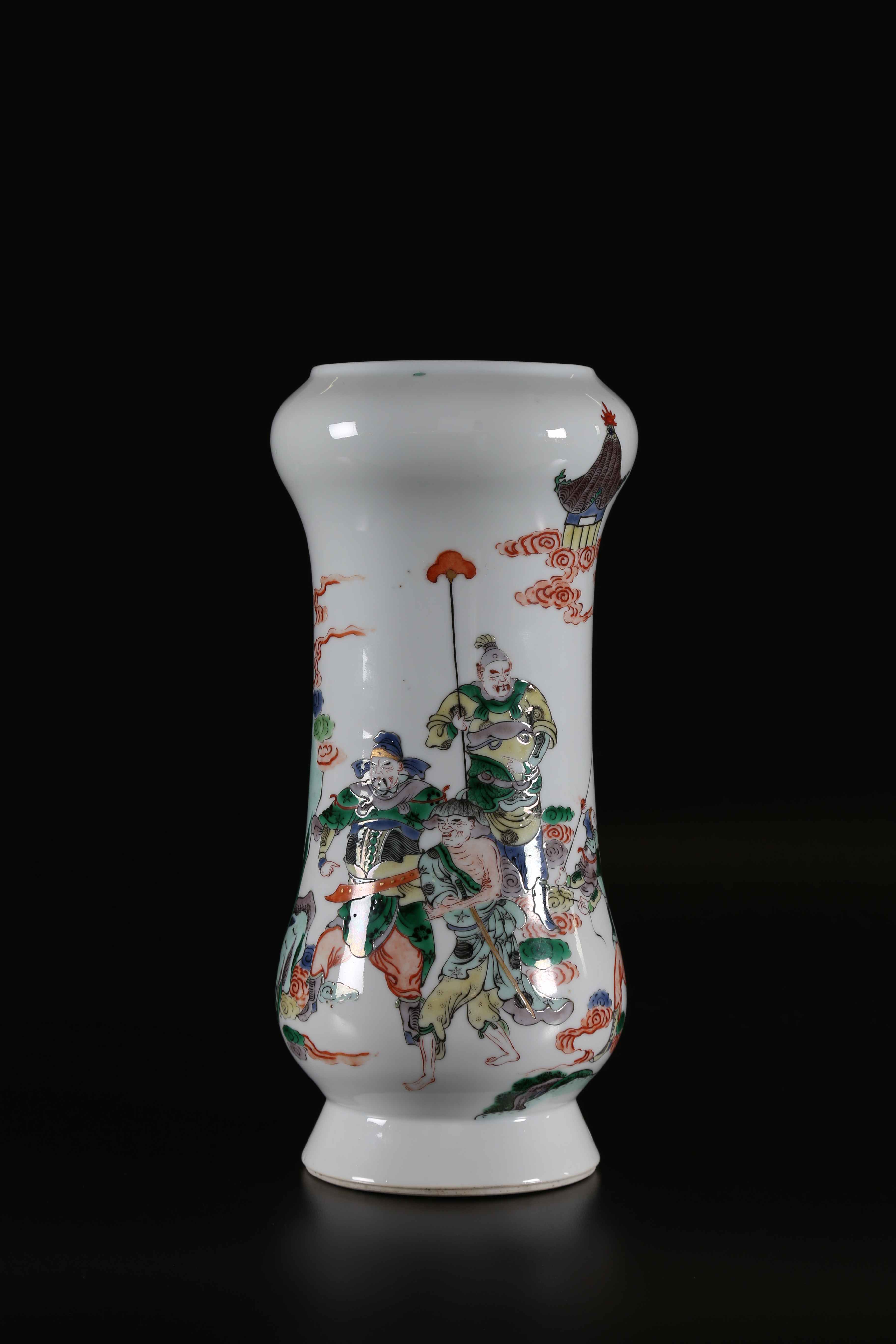 Arte Cinese Vaso in porcellana bianca dipinta con guerrieri Cina, dinastia Qing, XIX secolo. . Cm 31,00. Su fondo bianco risaltano dei guerrieri in frenetica attività. Pagode e nuvole caratterizzano il cielo. Marchio a sei caratteri di Kangxi sulla base.