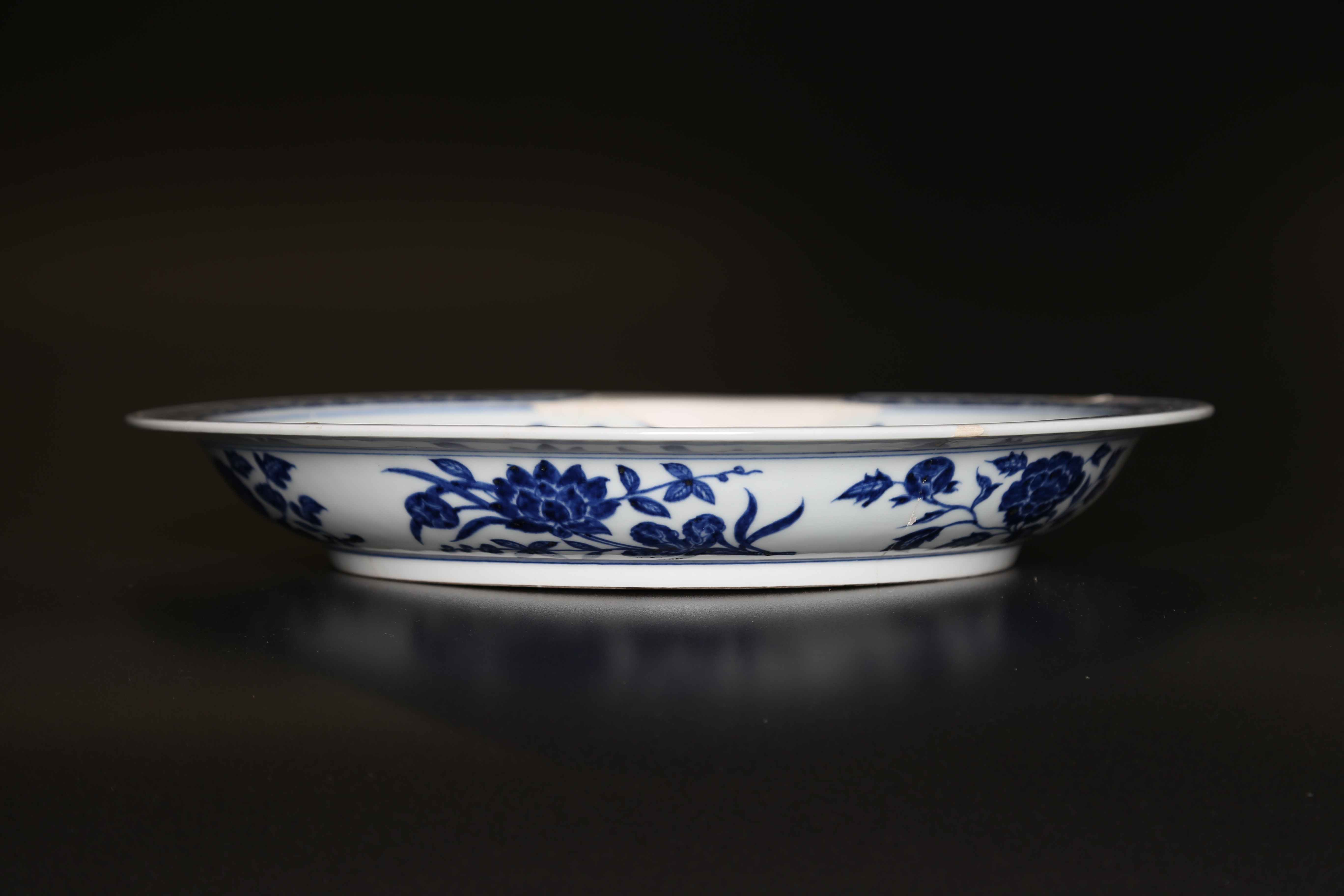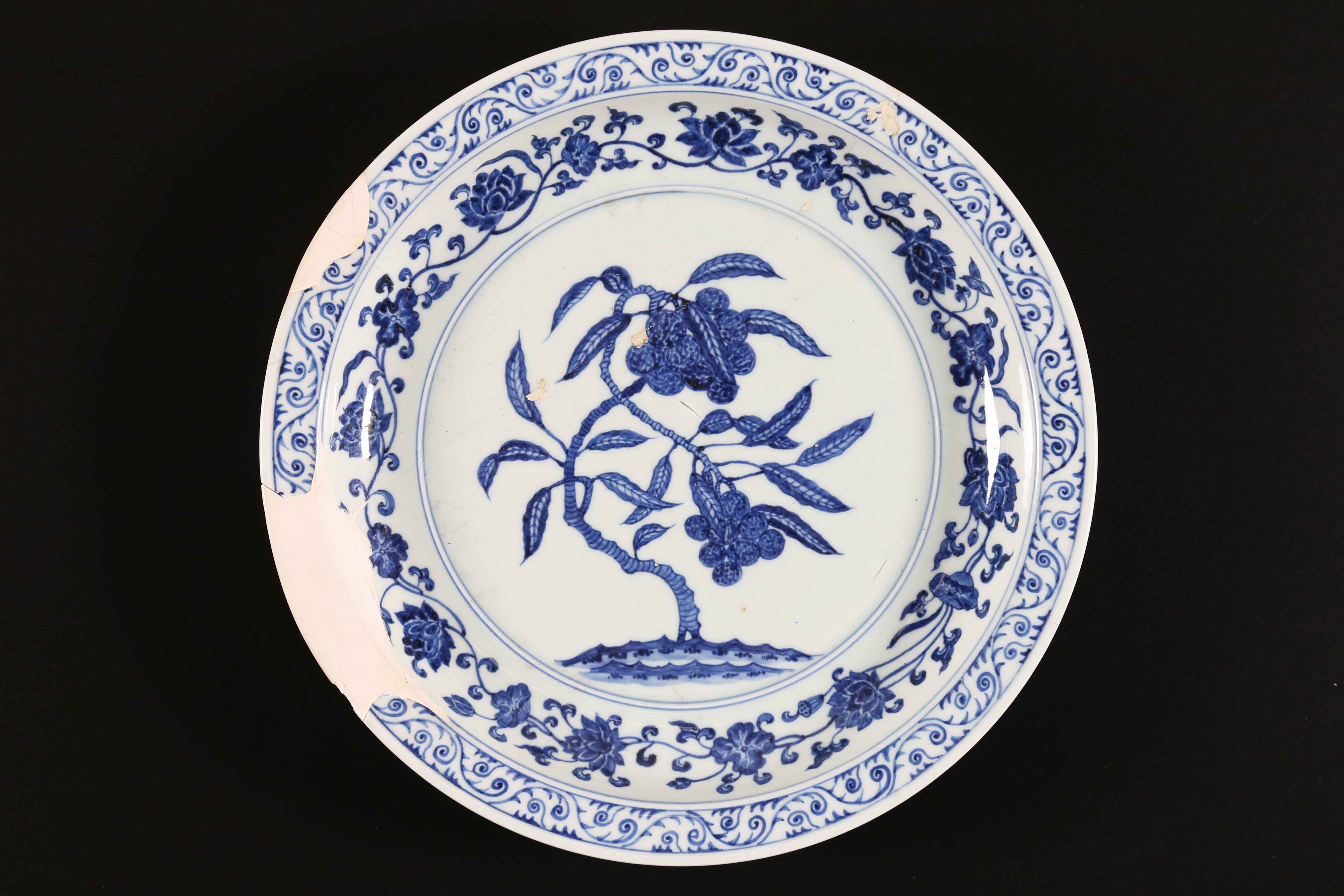 Arte Cinese Vassoio in porcellana Bianco/Blu in stile Yongle Cina. . Cm 36,50 x 5,00. Decorato con un ramo fiorito centrale, una corona di fiori di loto e tralci vegetali nel cavetto ed una fascia con il tradizionale motivo "rocce ed onde" stilizzate sulla tesa. L'esterno riprende il motivo floreale suddividendolo in sei riserve. I motivi decorativi e la loro organizzazione sulla superficie del vassoio sono un omaggio allo stile Yongle, terzo imperatore della dinastia Ming. Restauri.