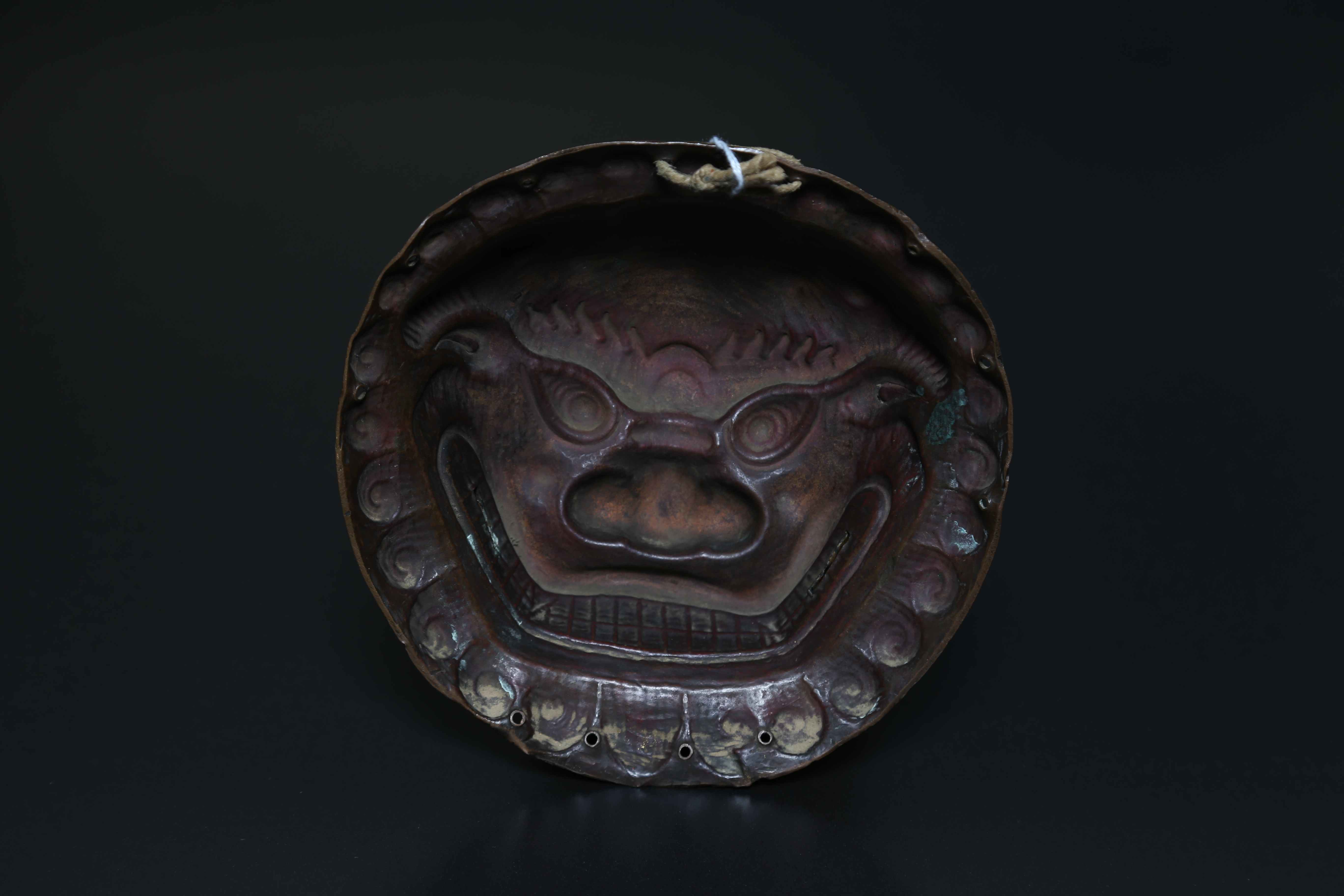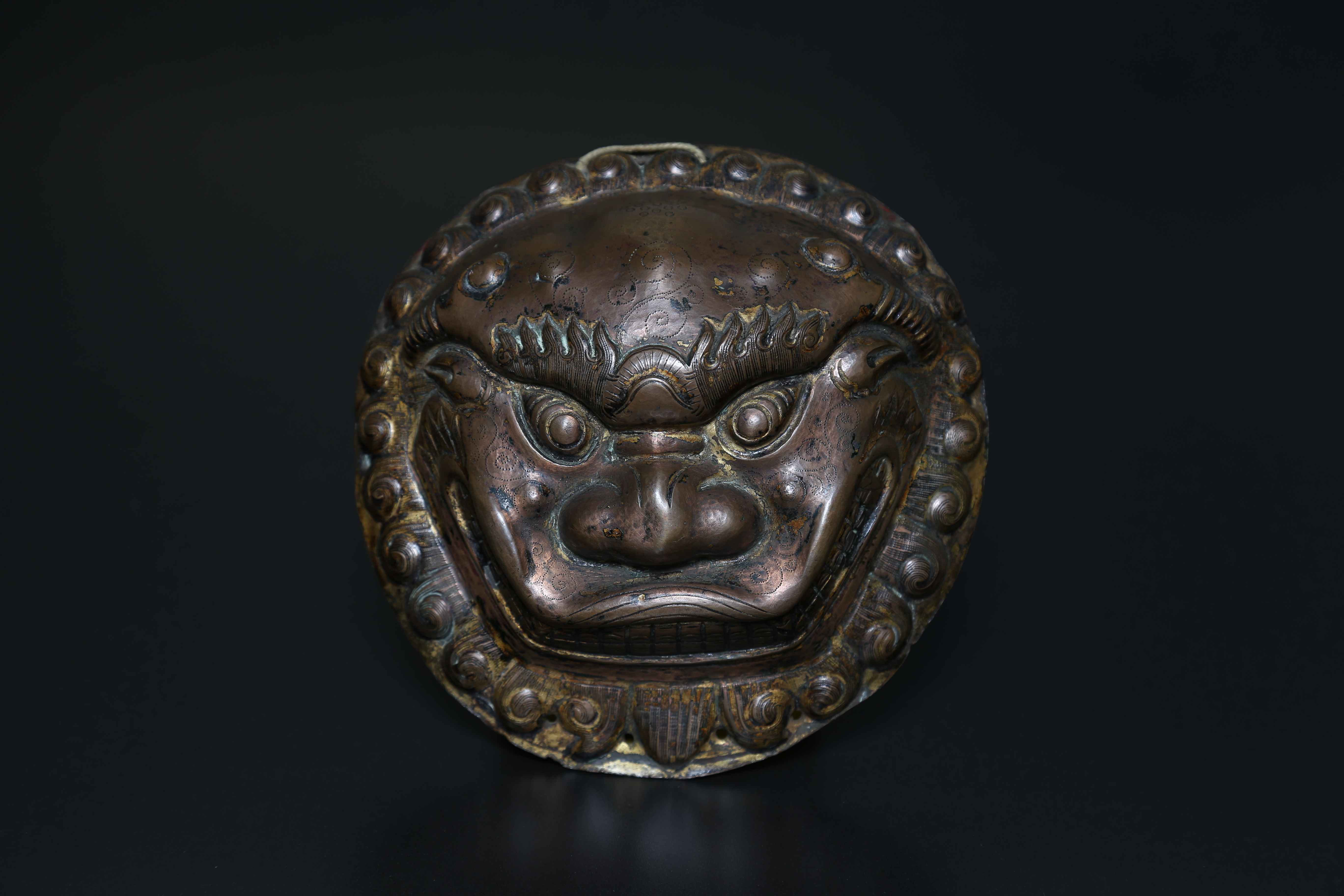 Arte Cinese Battente a forma di leone Cina o Tibet, XVIII secolo . . Cm 24,00. Umbone in rame dorato e lavorato a sbalzo raffigurante la testa di un leone. In origine reggeva in bocca la maniglia, oggi perduta, come suggeriscono i due fori agli angoli della bocca. Rifinito a cesello soprattutto nella zona della criniera e dei denti.