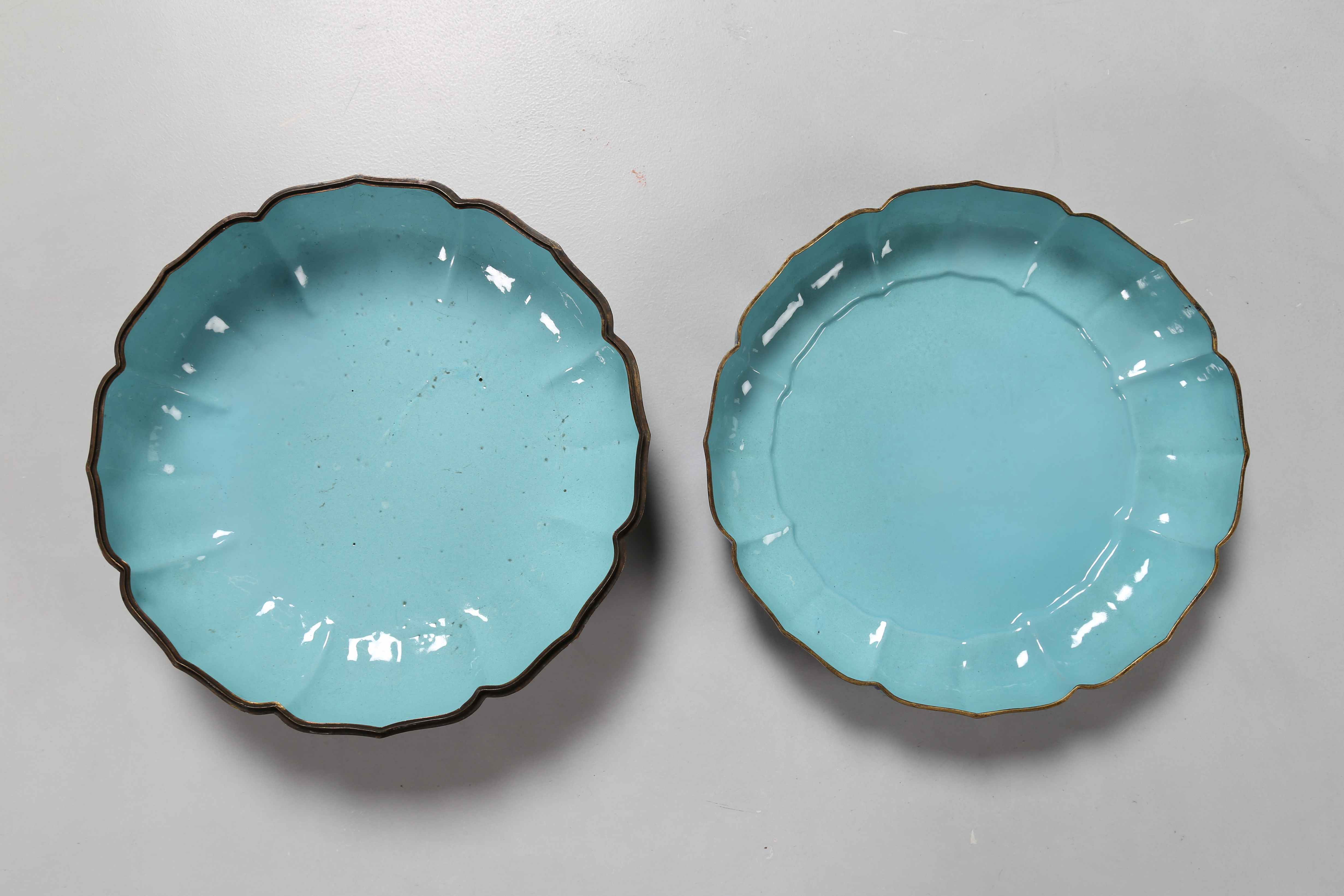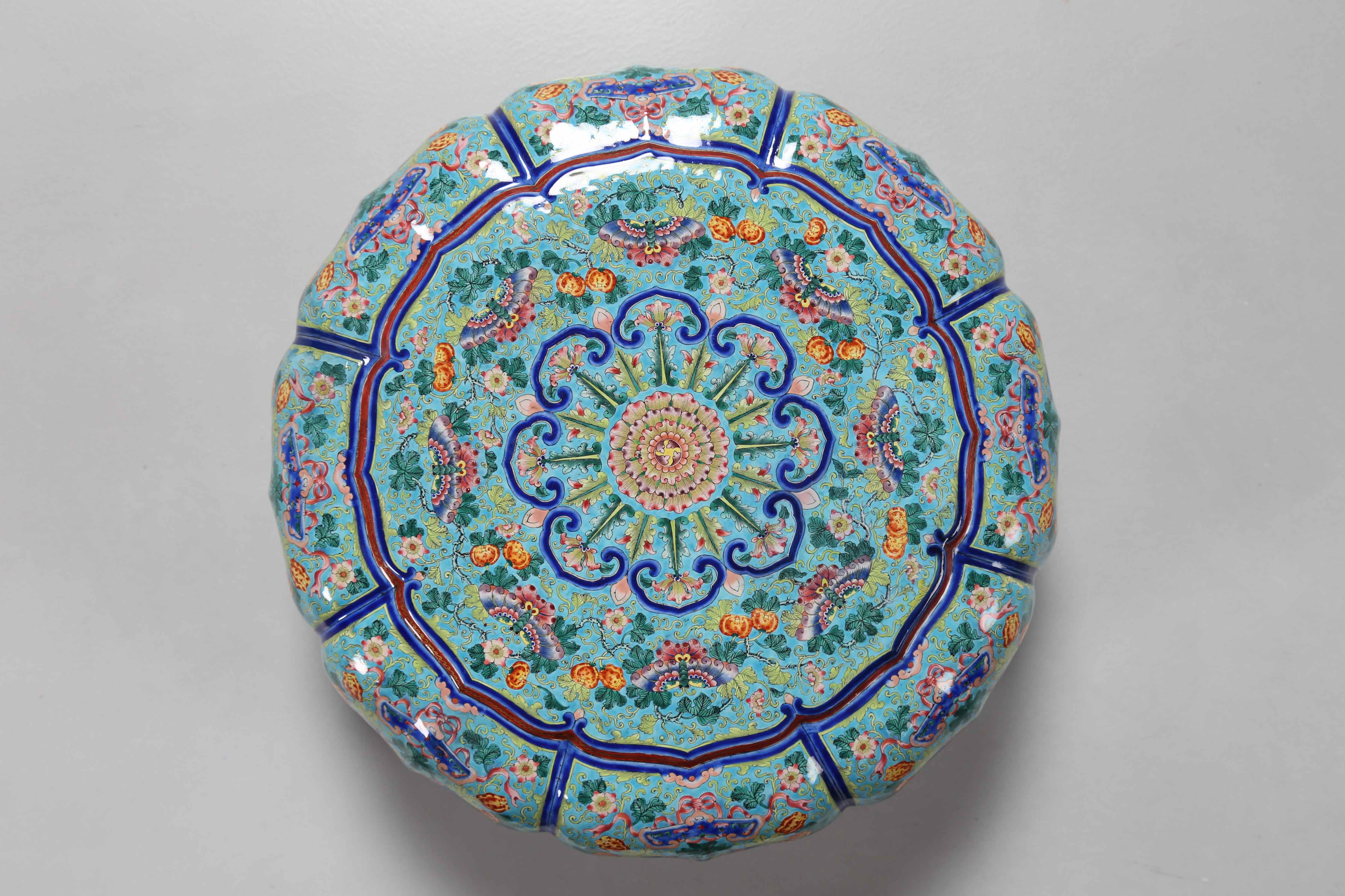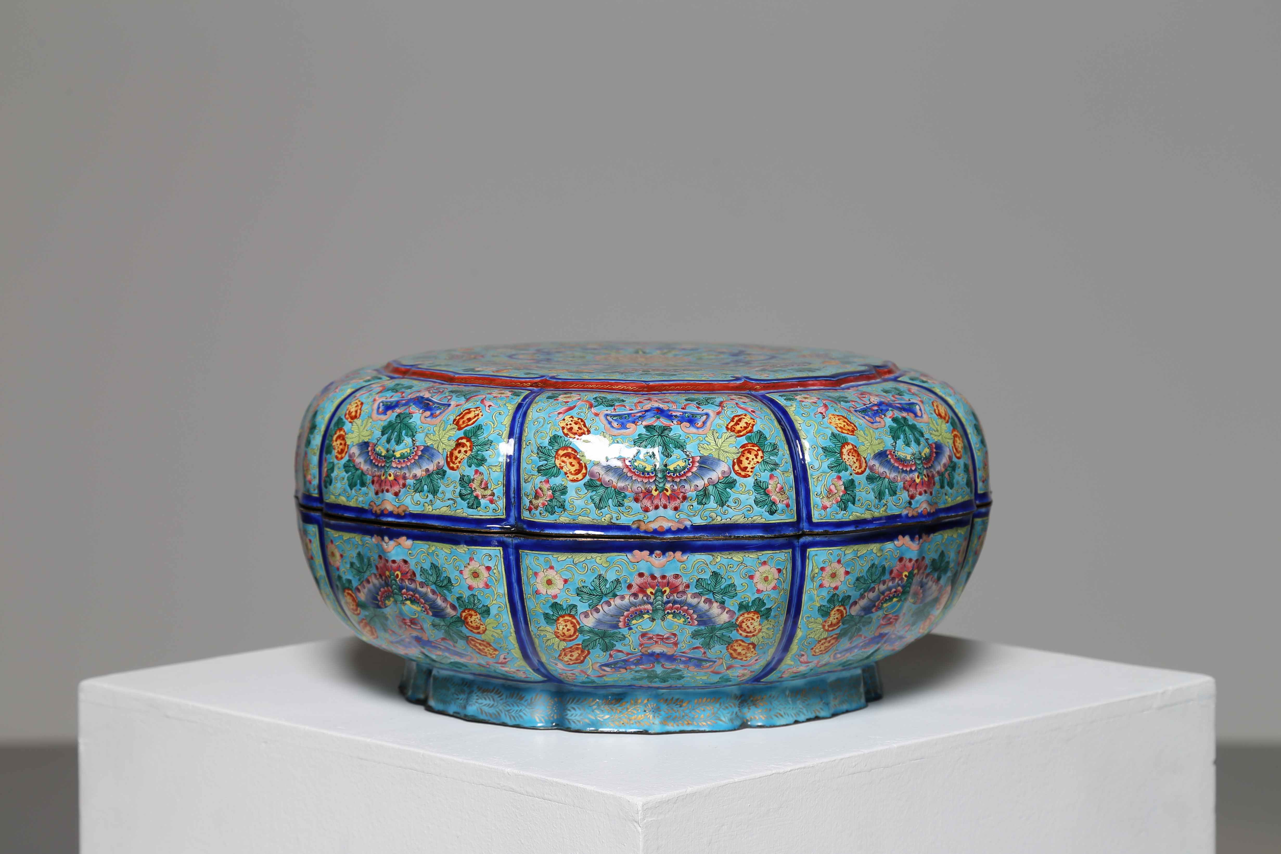 Arte Cinese Scatola lobata in smalti di Canton Cina, dinastia Qing, periodo Qianlong 1736 - 1795. -. Cm 31,50 x 16,00. Raffinata decorazione a smalti policromi su fondo turchese. Al centro del coperchio campeggia un fiore di loto stilizzato entro cornice di ruyi, sul fianco si dispongono farfalle, simbolo di buon auspicio, entro pannelli blu. L'interno è smaltato in turchese chiaro e la base è bianca. Piccoli restauri degli smalti. Per un esemplare comparativo si veda quello esposto al Palace Museum di Pechino.