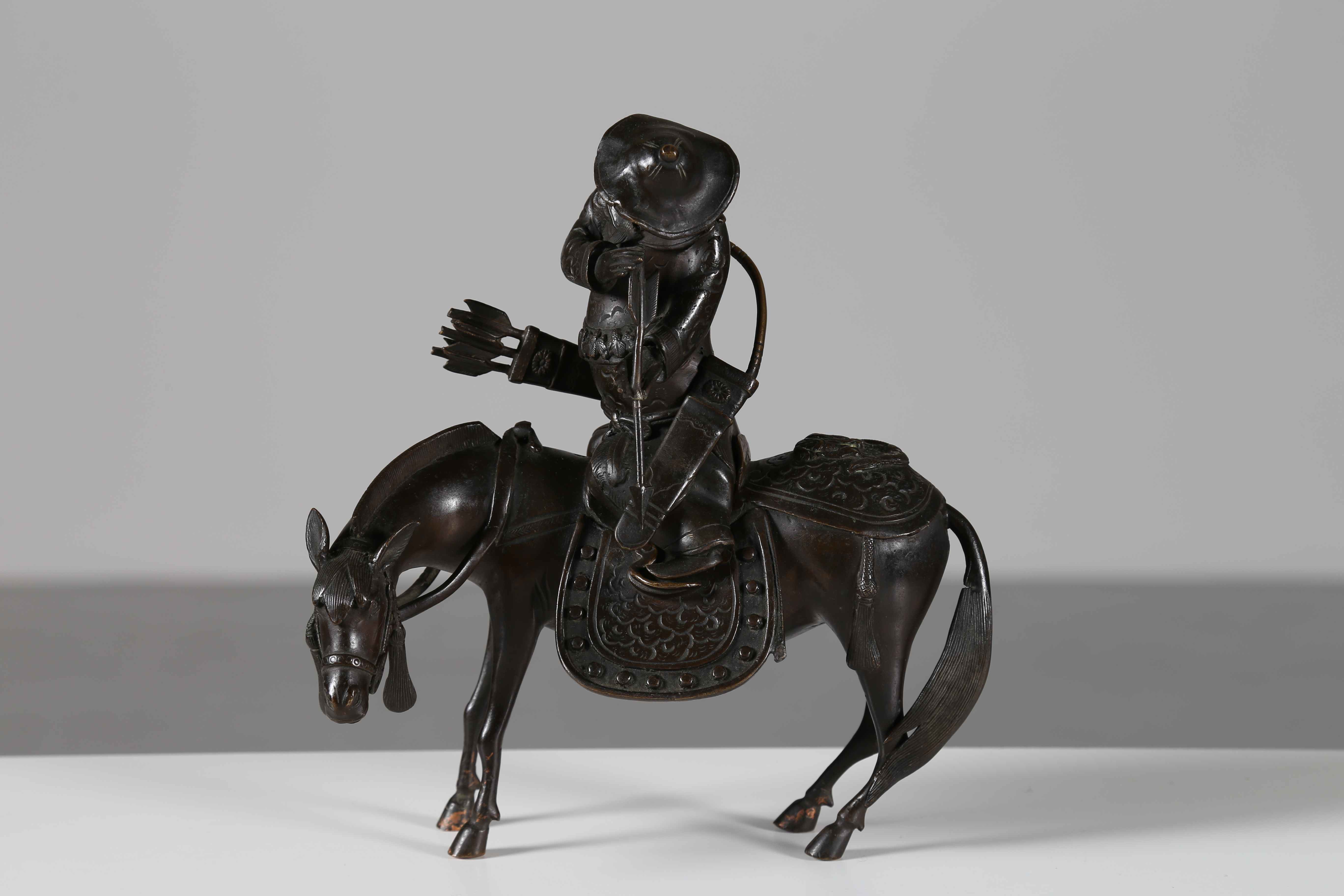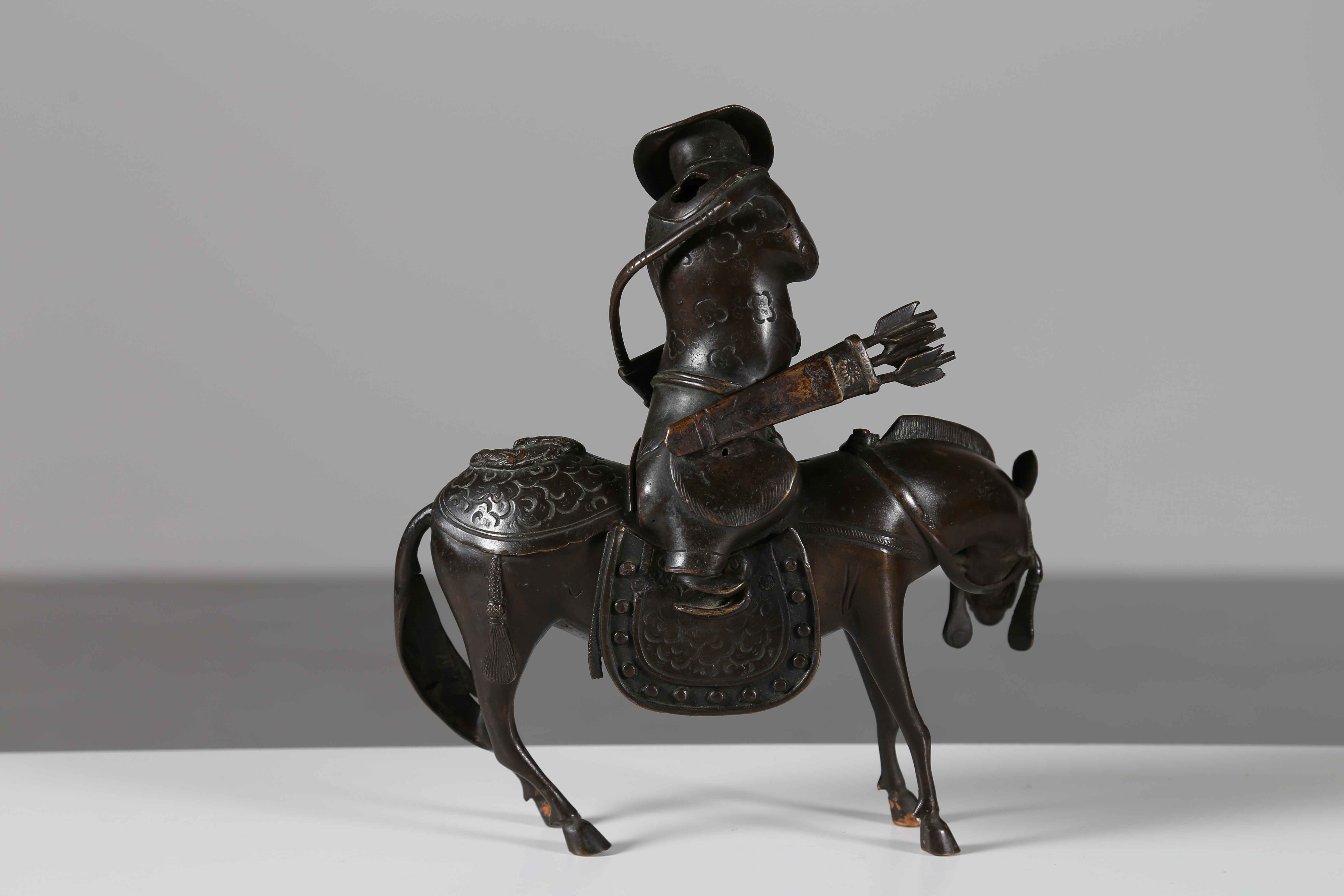Arte Cinese Statua in bronzo raffigurante un arciere a cavallo Cina, dinastia Ming, XVI - XVII secolo. -. Cm 25,50 x 27,00. Bella fusione a cera persa di colore bruno, presumibilmente un incensiere, come il foro quadrilobato sulla schiena dell'arciere parrebbe suggerire. Belli i dettagli delle vesti e del cavallo.