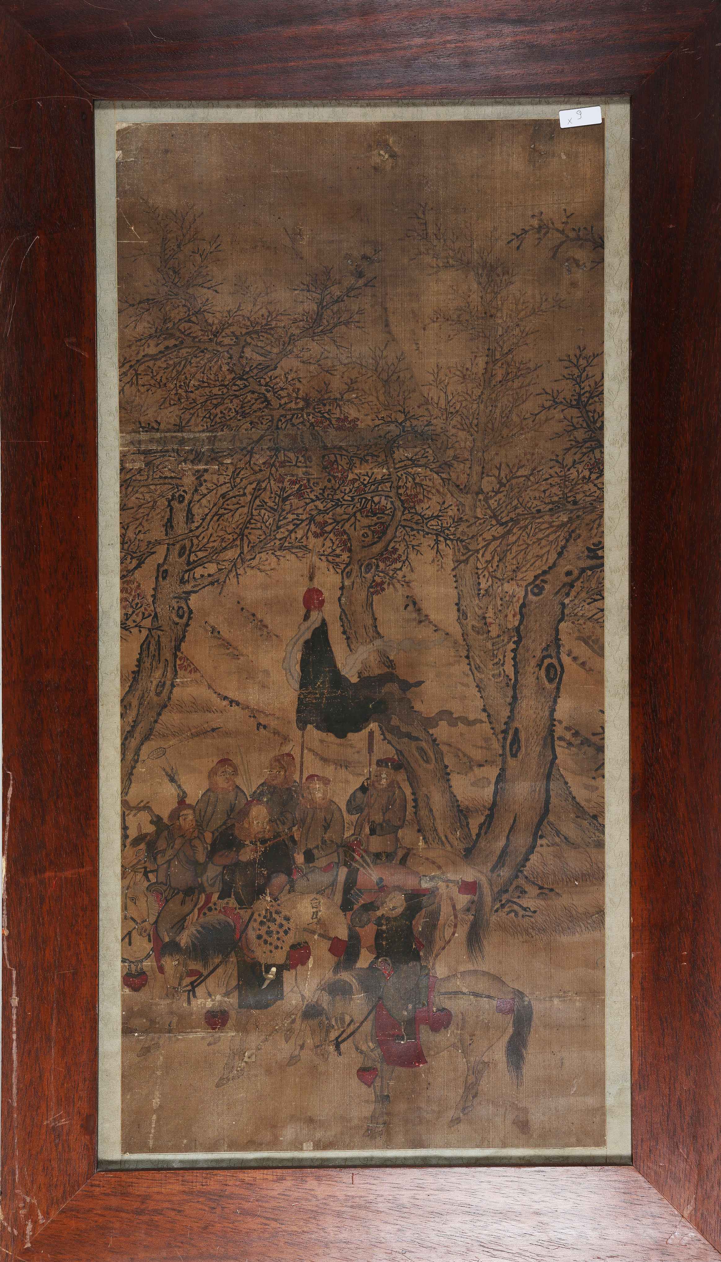 Arte Cinese A painting on silk portraying horsemen with flags. Anonymous, 18th century. . Cm 40,70 x 86,00.