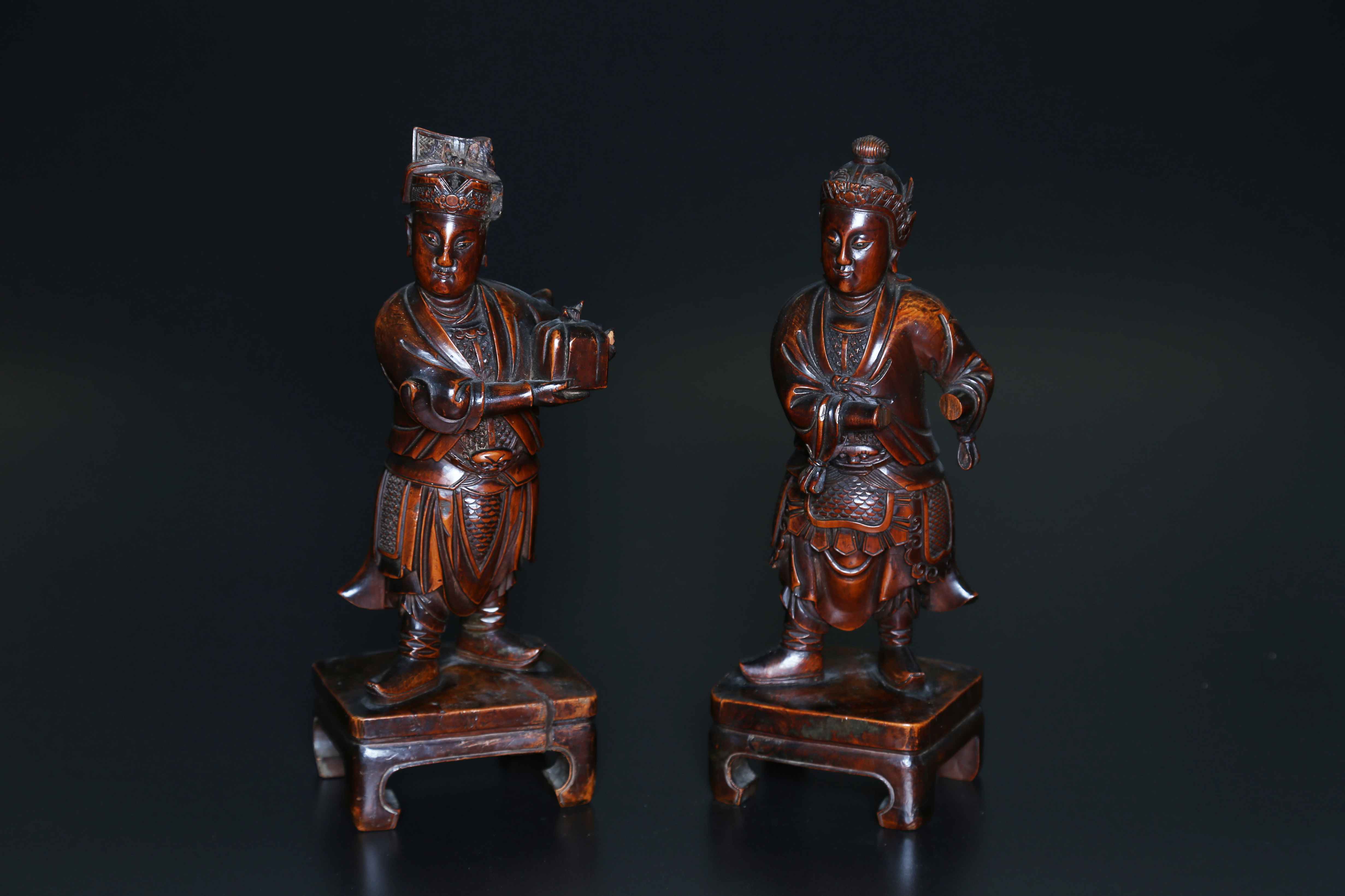 Arte Cinese Coppia di sculture in legno raffiguranti guerrieri