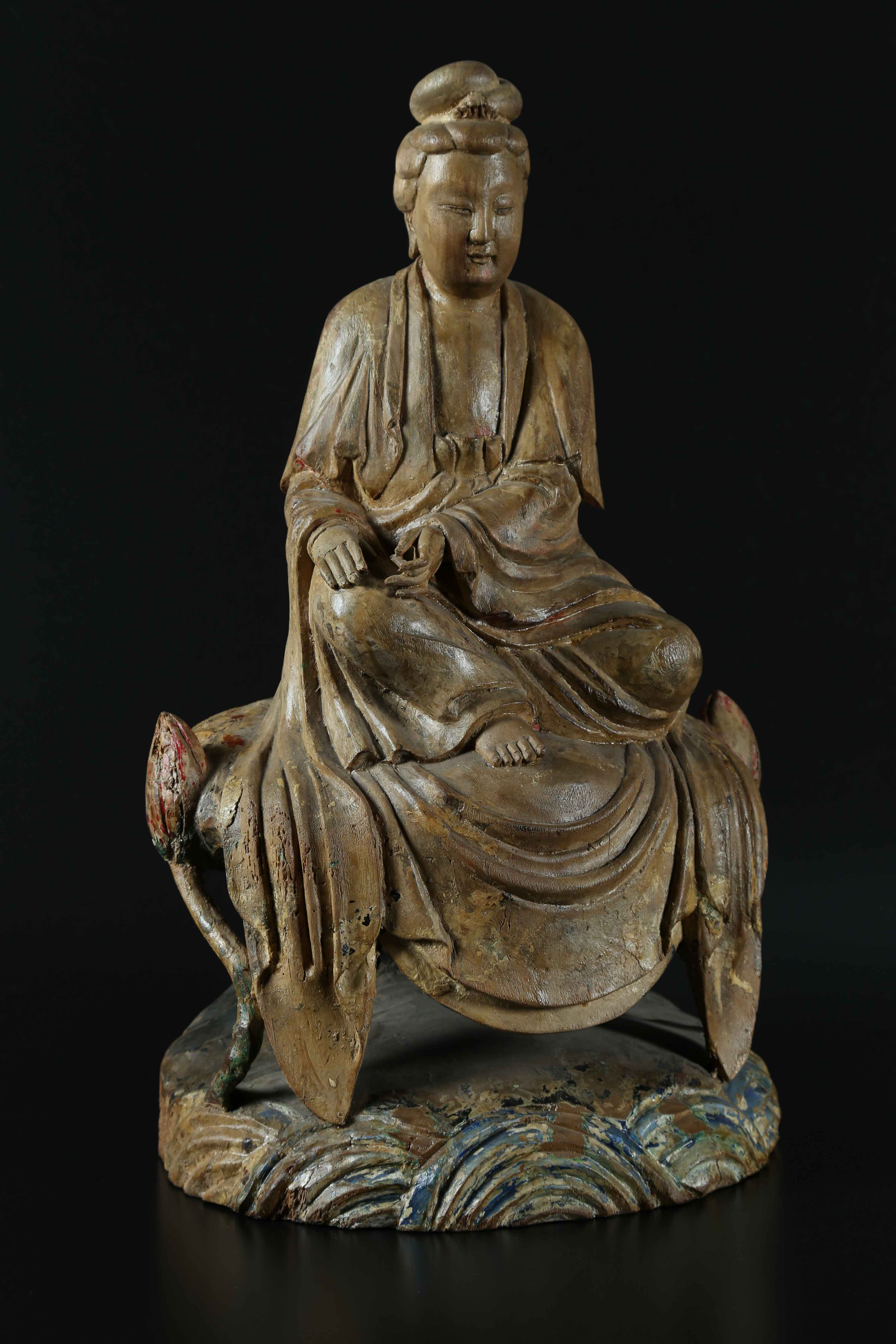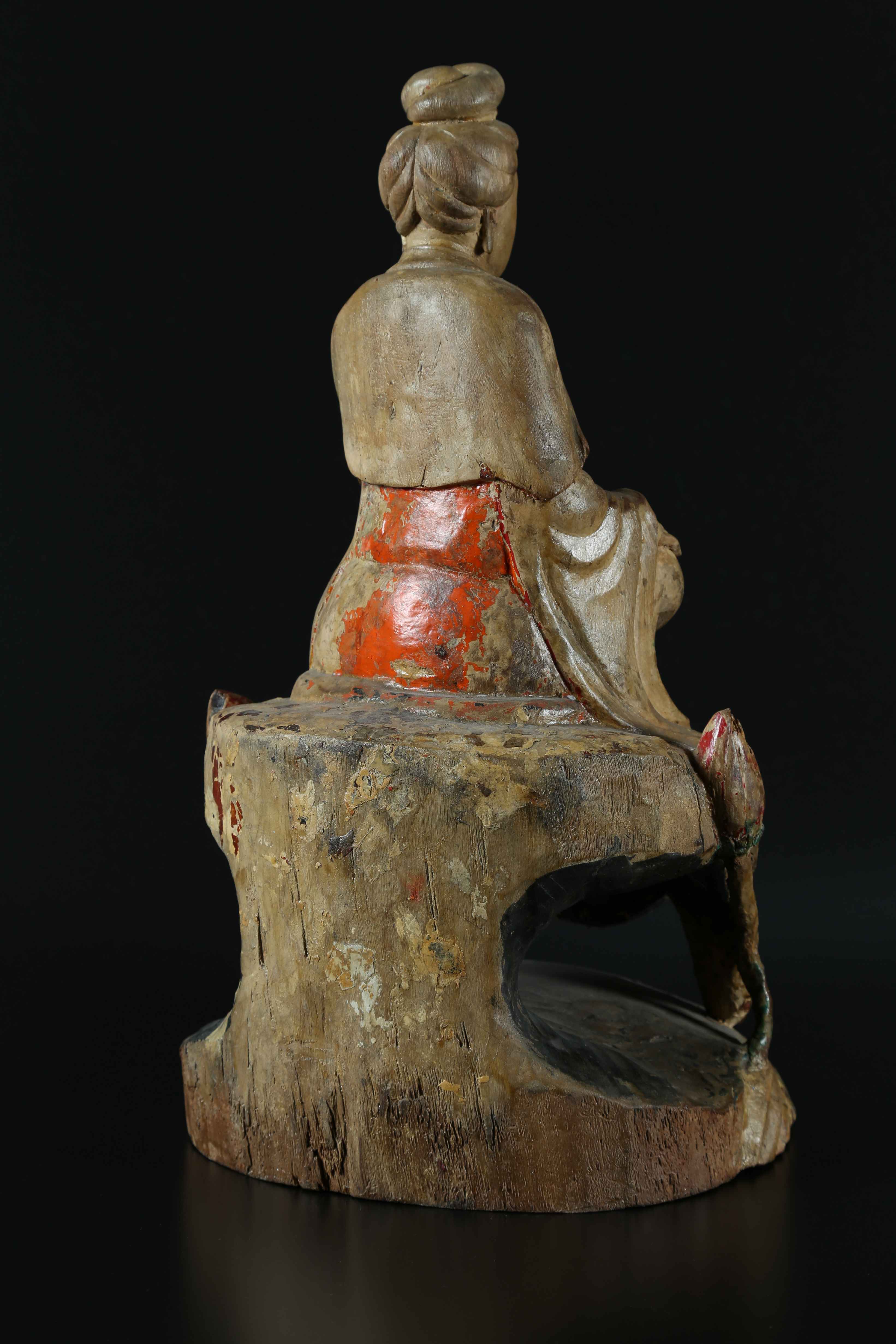 Cina, XVIII - XIX secolo. -. Cm 30,00 x 55,50 x 25,50. Assisa su una base che si eleva da onde stilizzate e accompagnata da due boccioli di fiori di loto. La figura presenta tracce policrome nella parte inferiore, mentre la parte superiore è a legno vivo patinato.