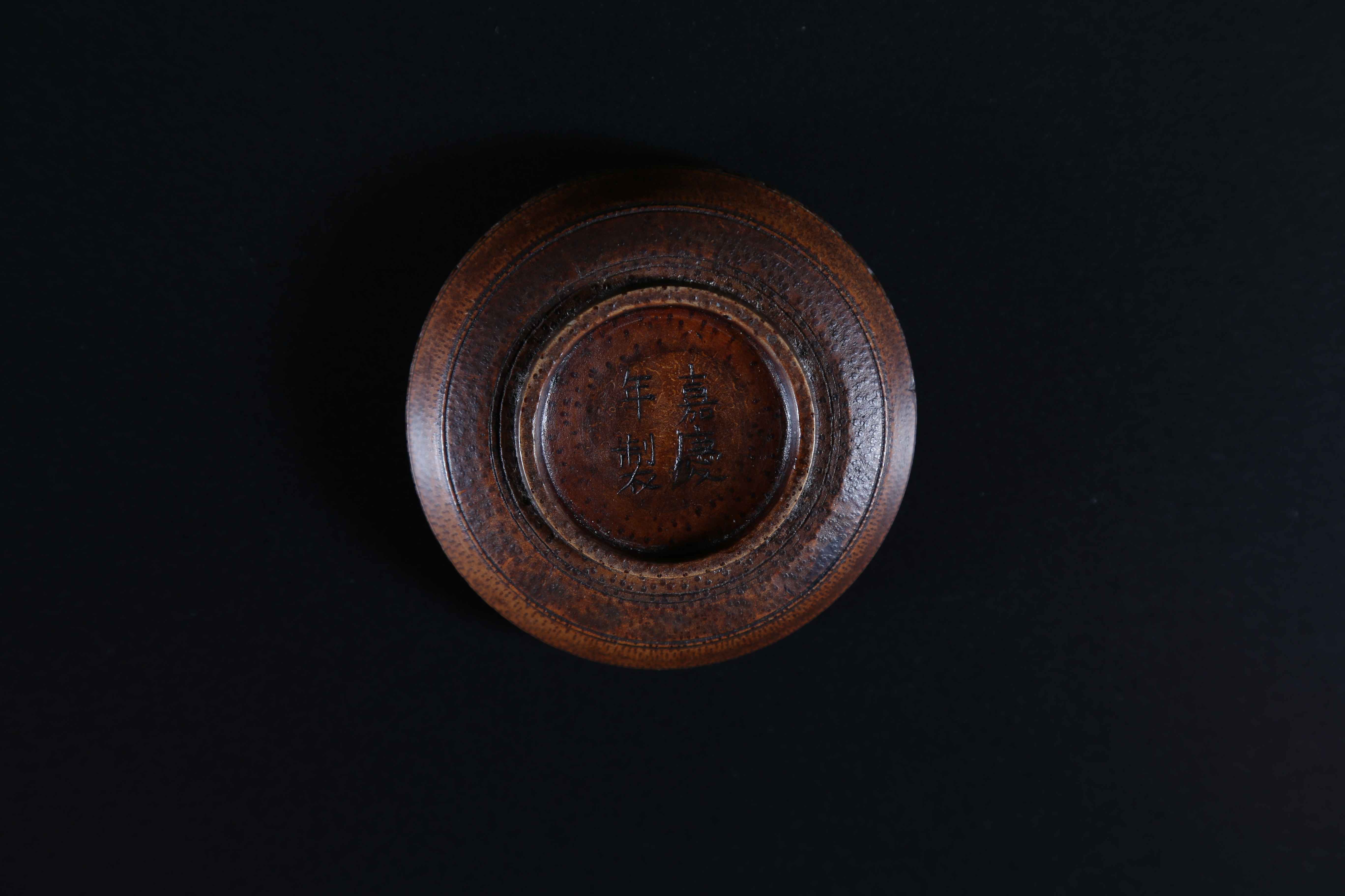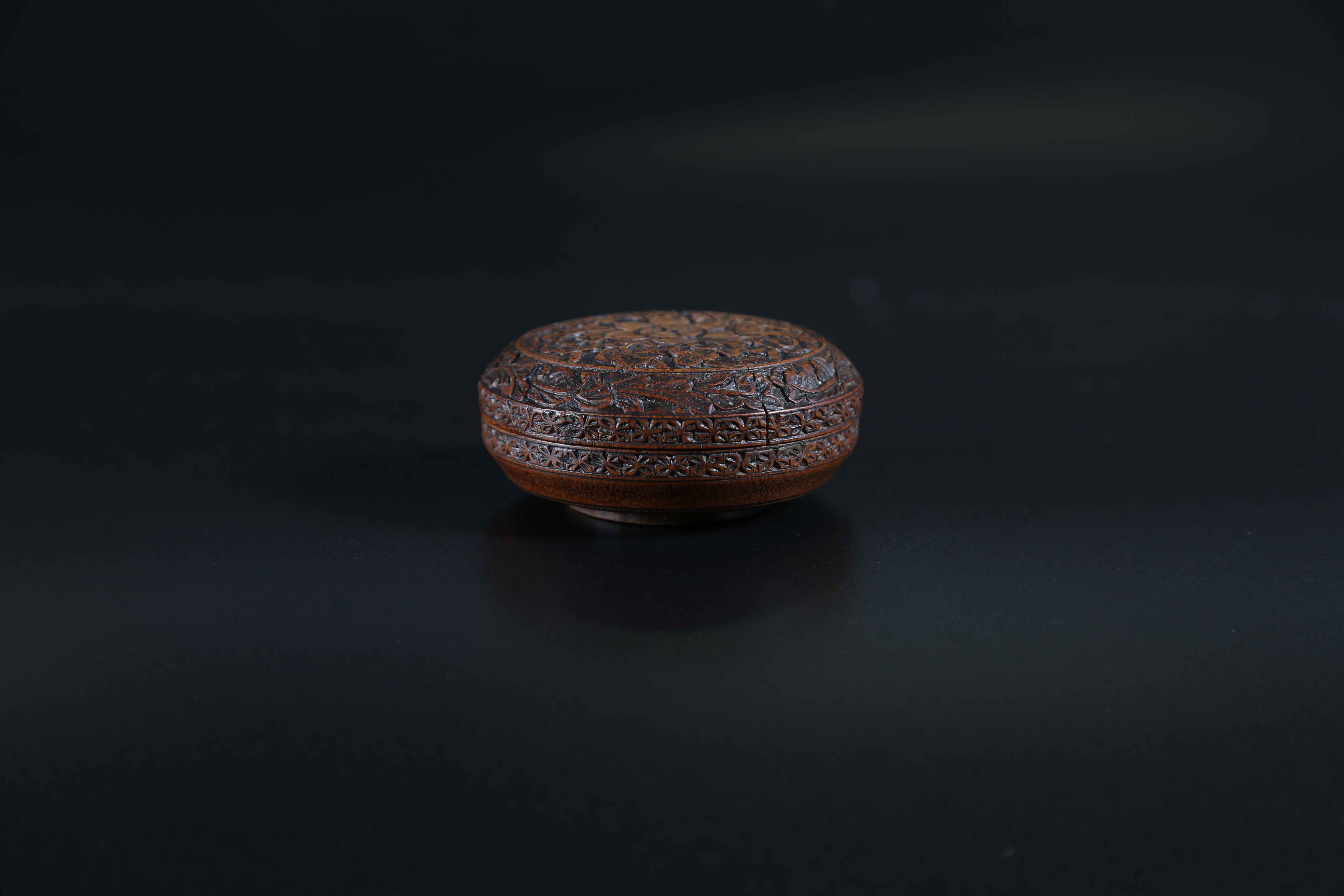Arte Cinese A circular bamboo carved box and cover with a four characters Jiaqing mark at the base and possibly of the period. China, Qing dynasty, 19th century. . Cm 8,00 x 3,00.