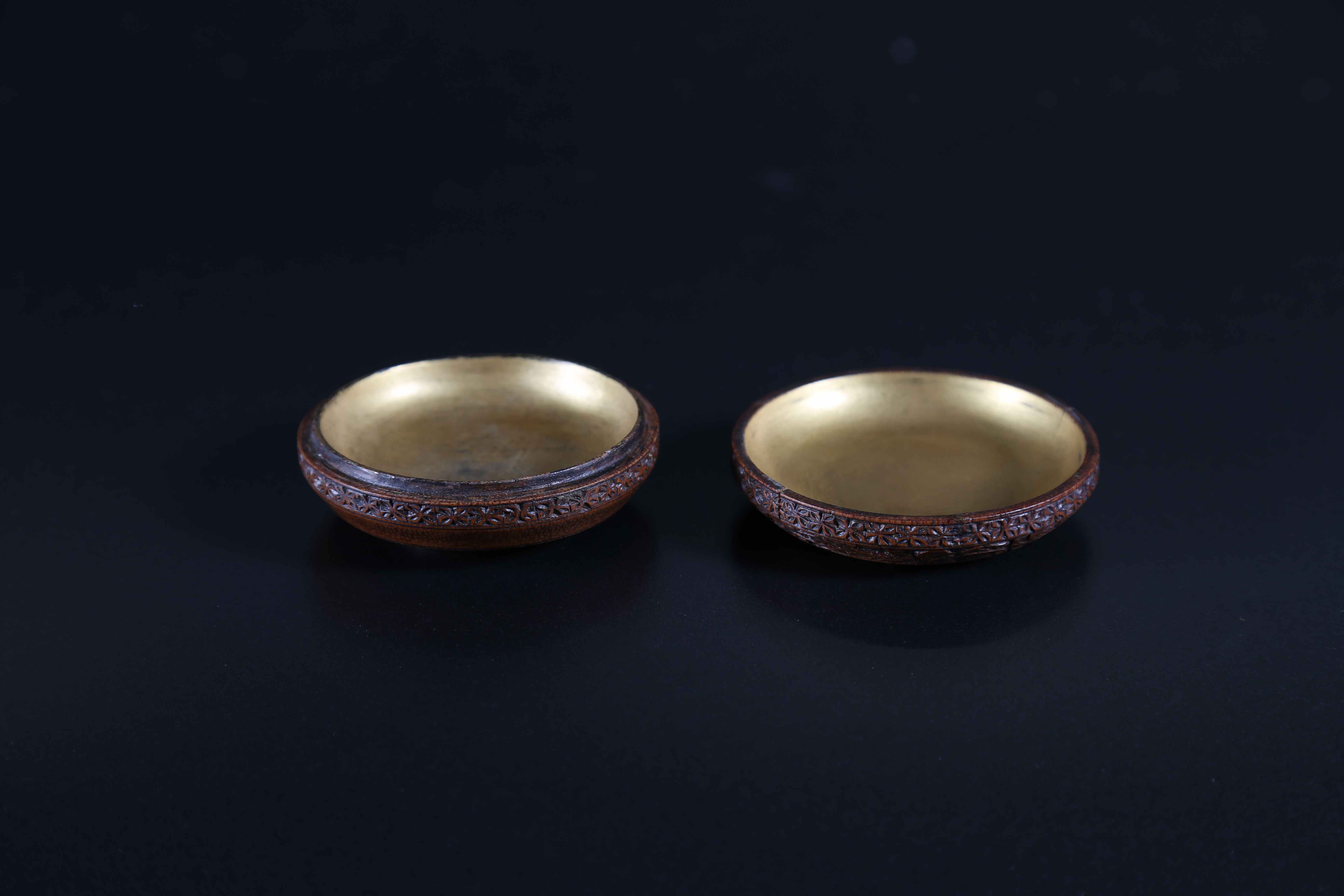 Arte Cinese Scatola circolare in bamboo intagliato a motivo floreale con marchio a quattro caratteri Jiaqing sulla base Cina, dinastia Qing, XIX secolo. . Cm 8,00 x 3,00. Deliziosa scatolina in bamboo con interno in lacca dorata.