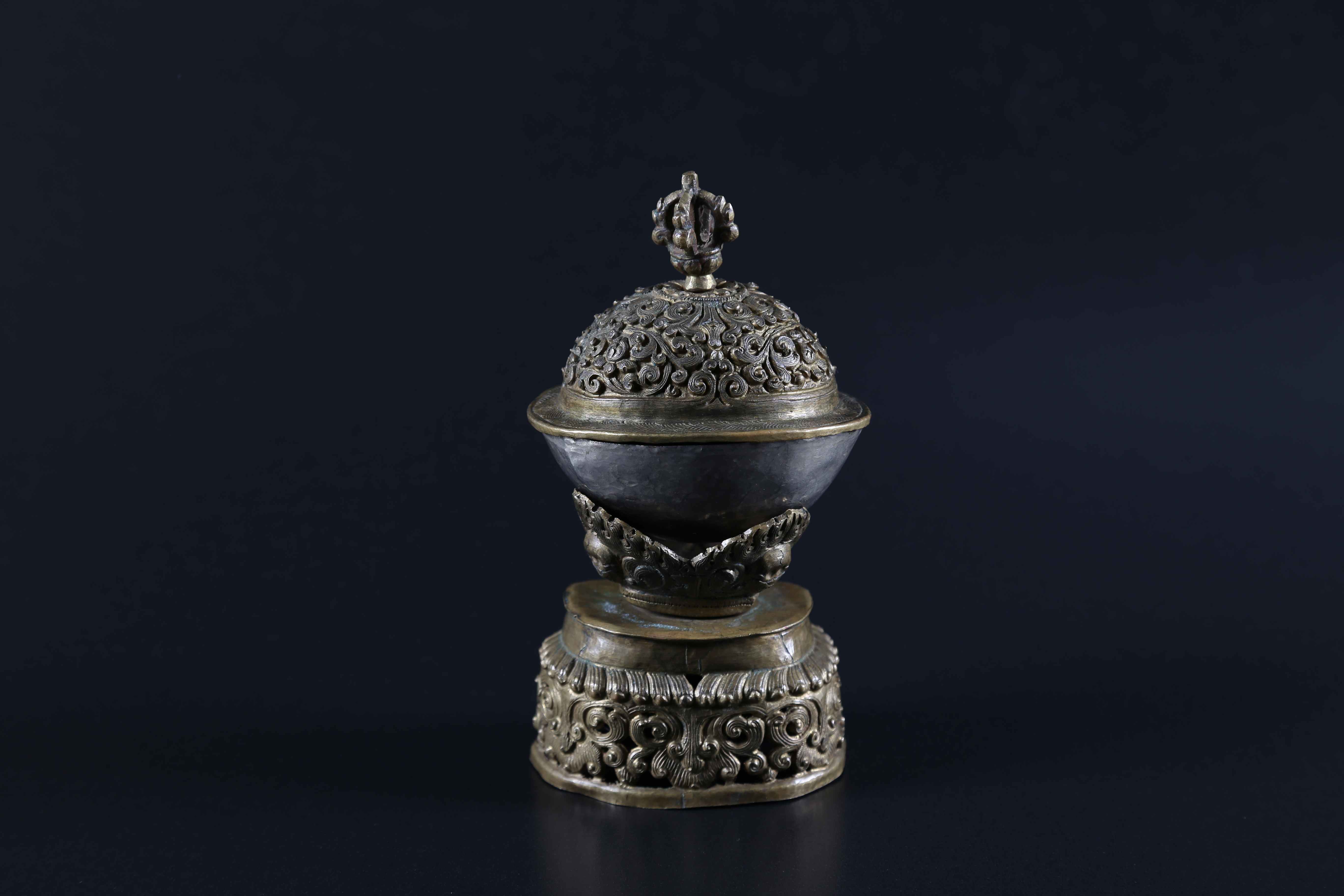 Tibet, XIX secolo . -. Cm 8,00 x 17,00. Il supporto finemente sbalzato mostra motivi vegetali e dei piccoli teschi sulla base. Il coperchio, similmente lavorato, presenta finale a mezzo vajra.