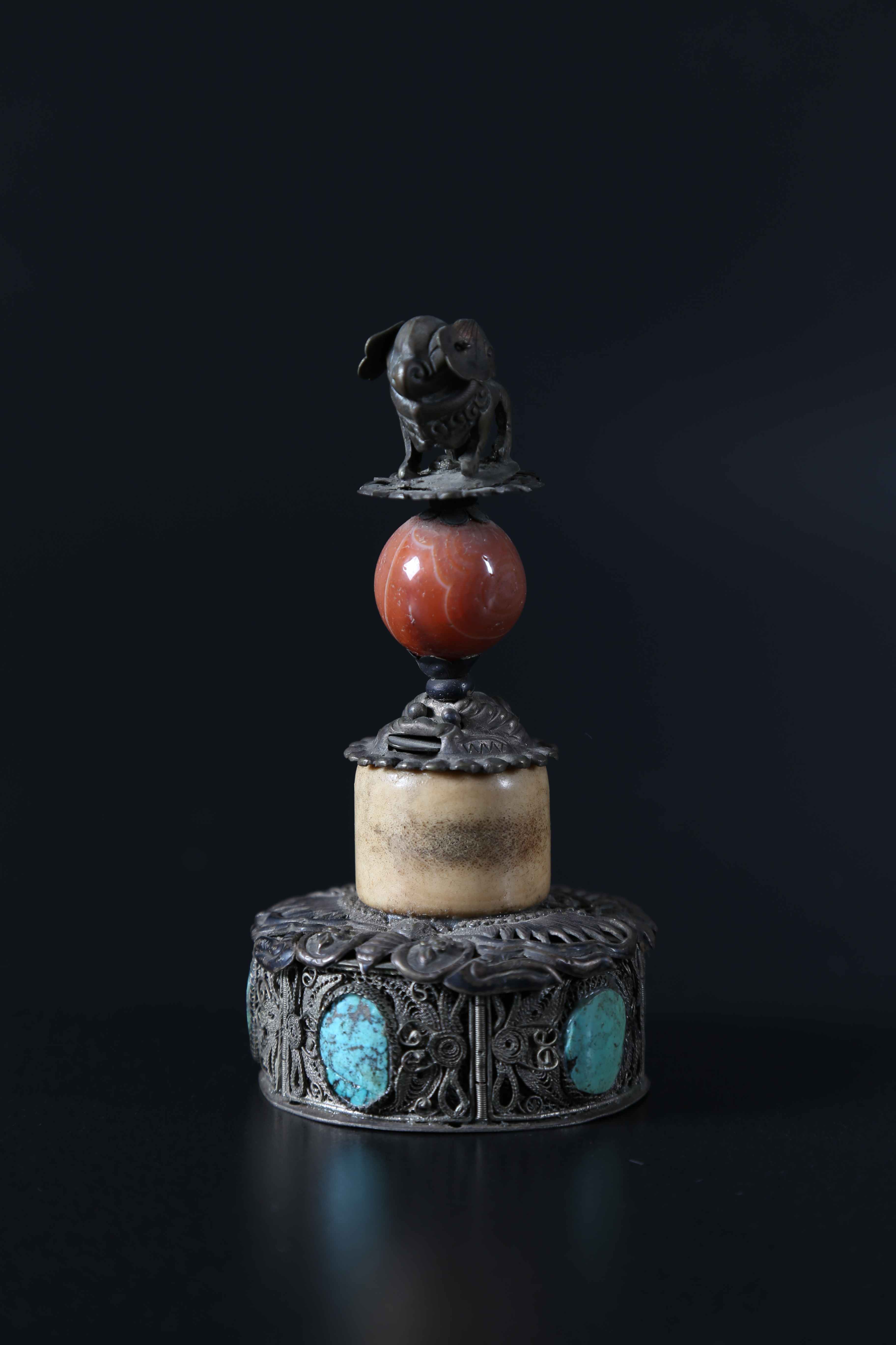 Tibet, XIX secolo. -. Cm 12,50. Ornamento da cappello in argento, turchese, corniola e osso. Da notare il fine lavoro si sbalzo e filigrana.