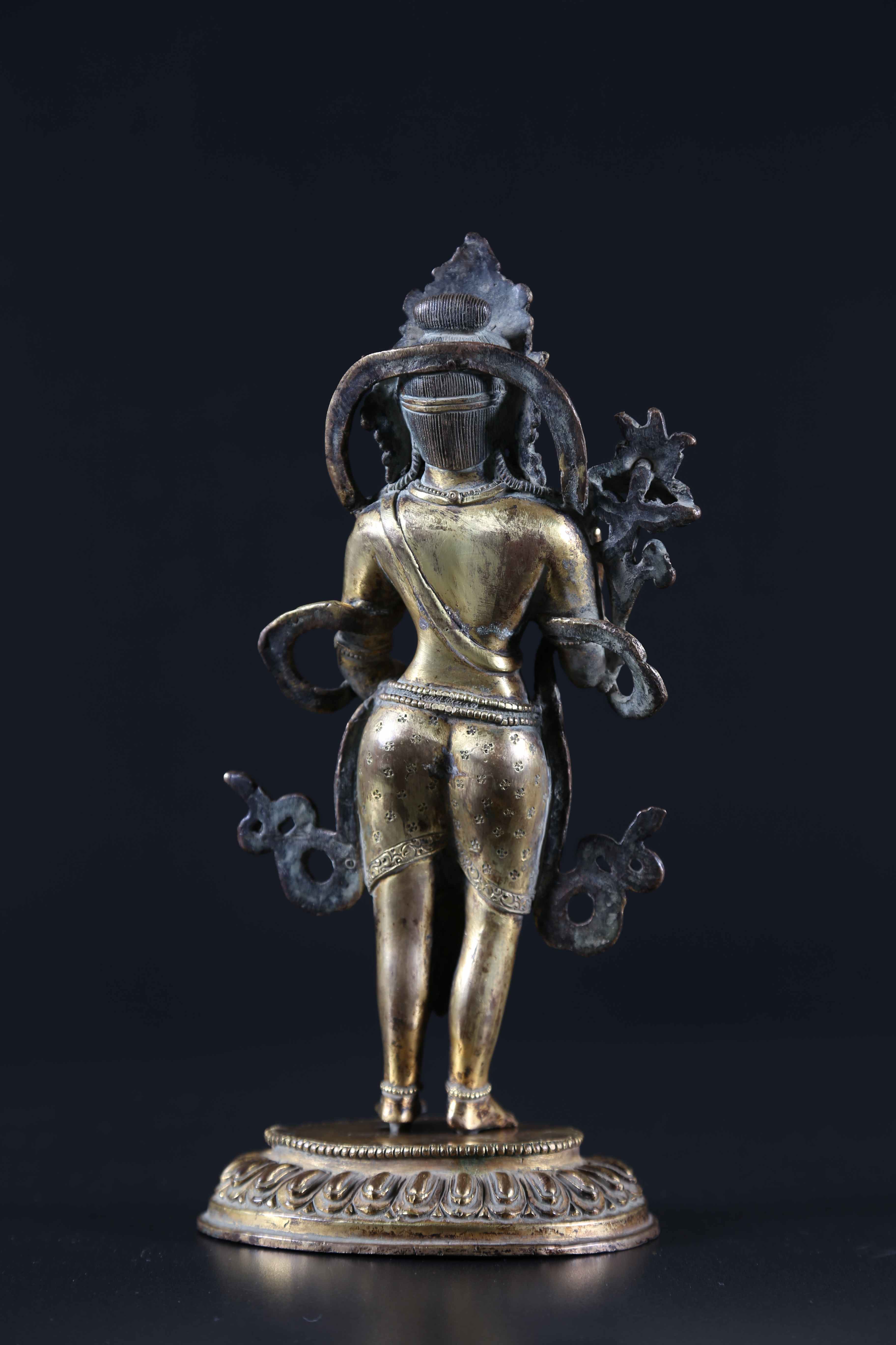Tibet, fine XIX secolo. -. Cm 12,70 x 27,50. Fusione in bronzo dorato ritraente in posizione stante il bodhisattva trascendente Ksitigarbha vestito con i paramenti tipici della sua classe e mostra delle piccole turchesi incastonate nei gioielli. La sua mano sinistra è nel gesto dell'asceta (sramanamudra) mentre la destra, con la quale regge anche un tralcio di loto, è nel gesto di esposizione della dottrina vitarkamudra.