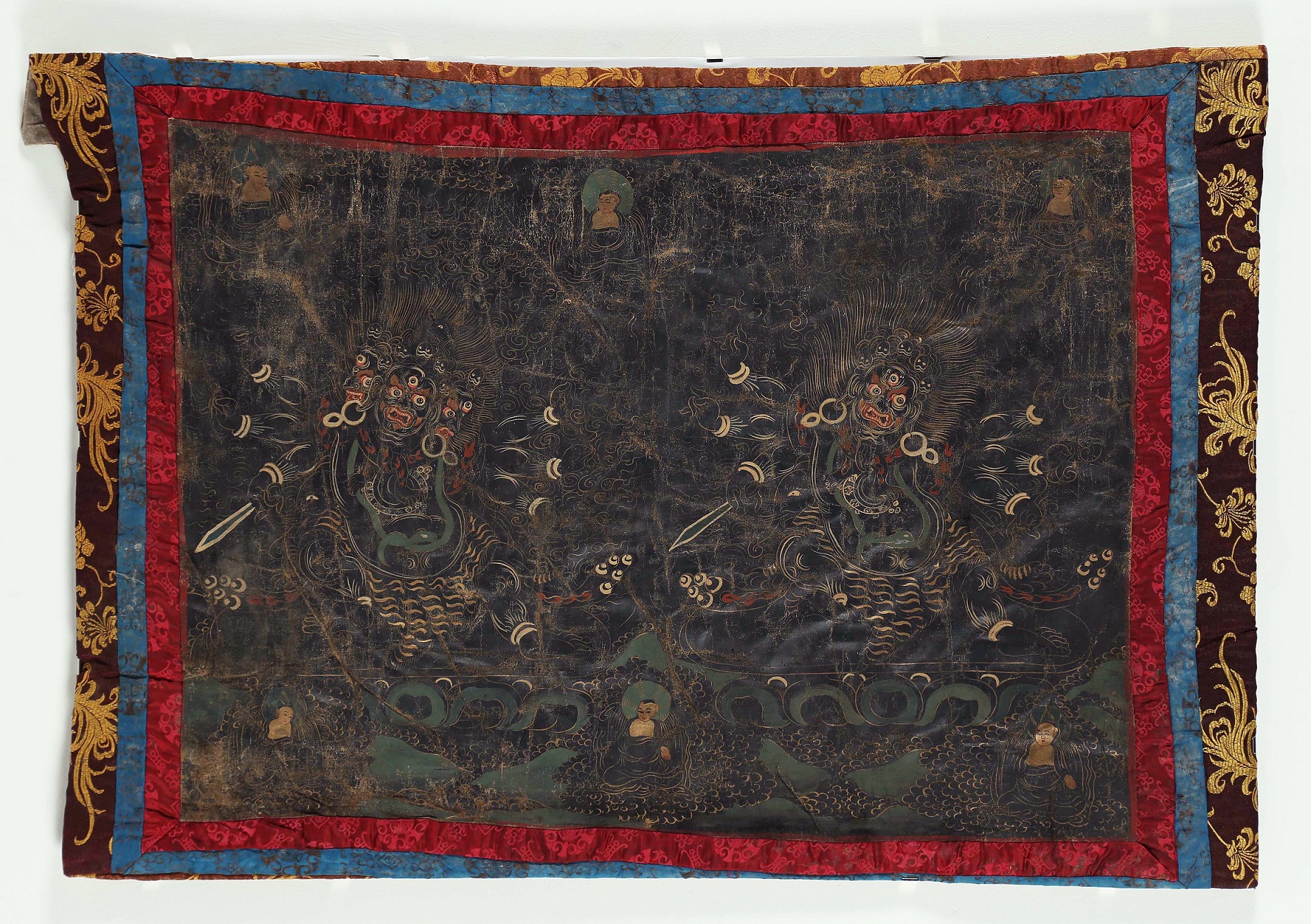 Arte Himalayana A Thangka Mahakala. Tibet, 19th century. . Cm 70,00 x 100,00. A Thangka with black background in the Nak-thang style. It portrays a six-handed and three-faced Hayagriva on the right. Hayagriva is characterized by the horse head showing up from his hair.