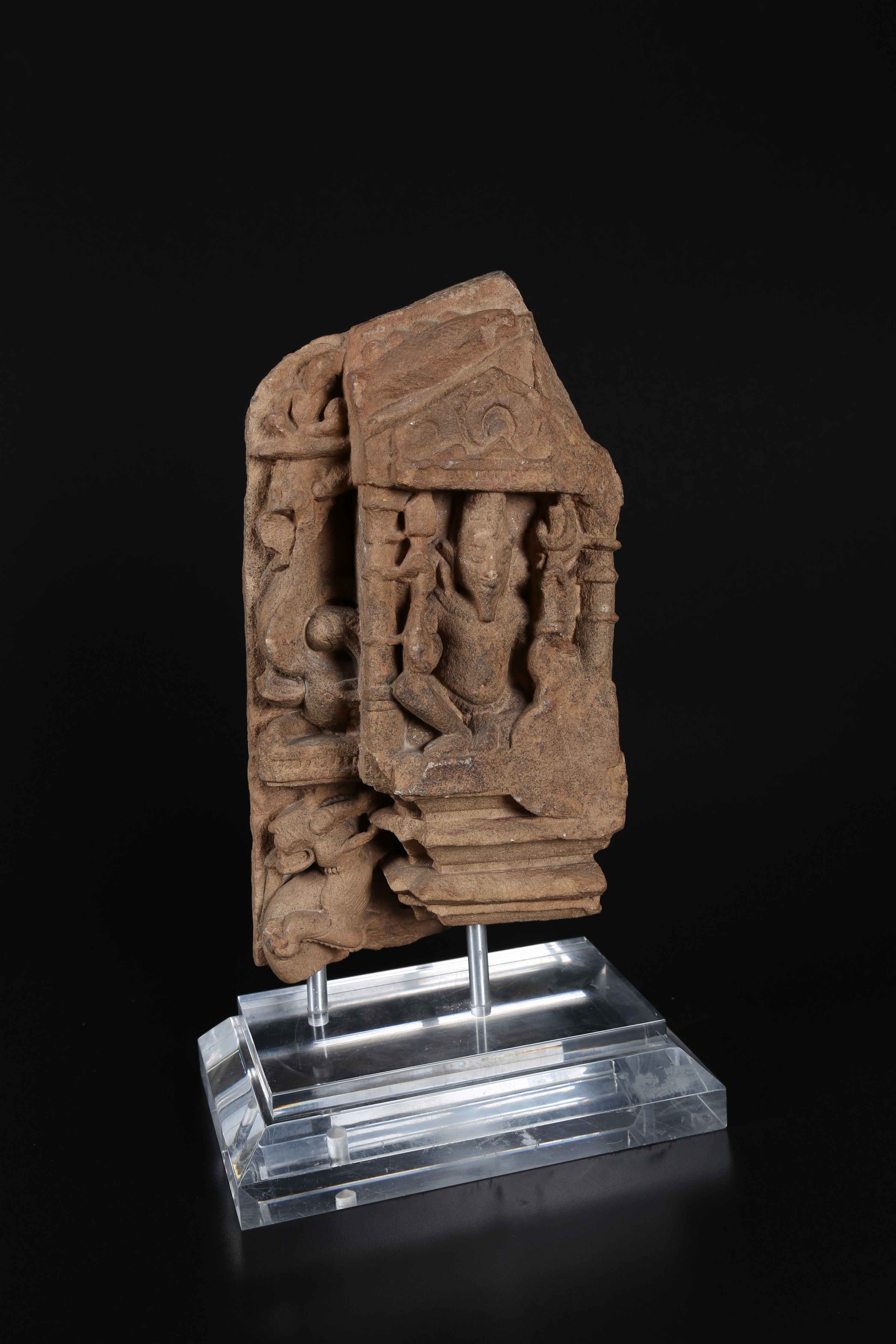 Arte Indiana Scultura in arenaria raffigurante Agni India Meridionale, periodo Chandela, XII secolo. -. Cm 34,00. Piccola edicola probabilmente appartenente alla decorazione, presumibilmente esterna, di un mandir (tempio) raffigurante il barbuto dio del fuoco Agni.