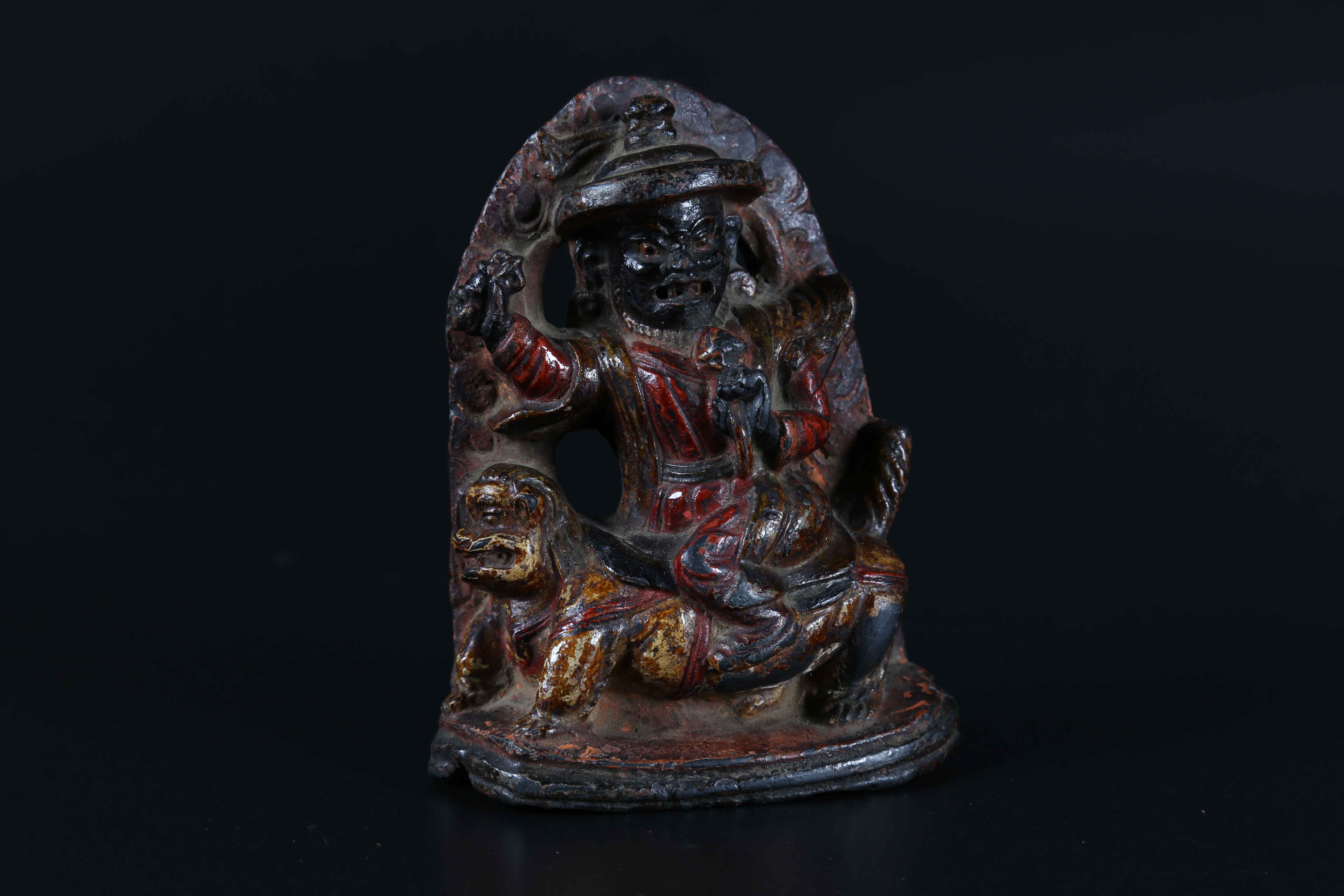 Tibet, XVII secolo. -. Cm 12,00. Scultura raffigurante il re del corpo Monbu Putra, caratterizzato dalla carnagione blu e dal leone stilizzato, sua cavalcatura; altri attributi sono il vajra ed una bacchetta magica (khatvanga) che tiene nelle sue mani.