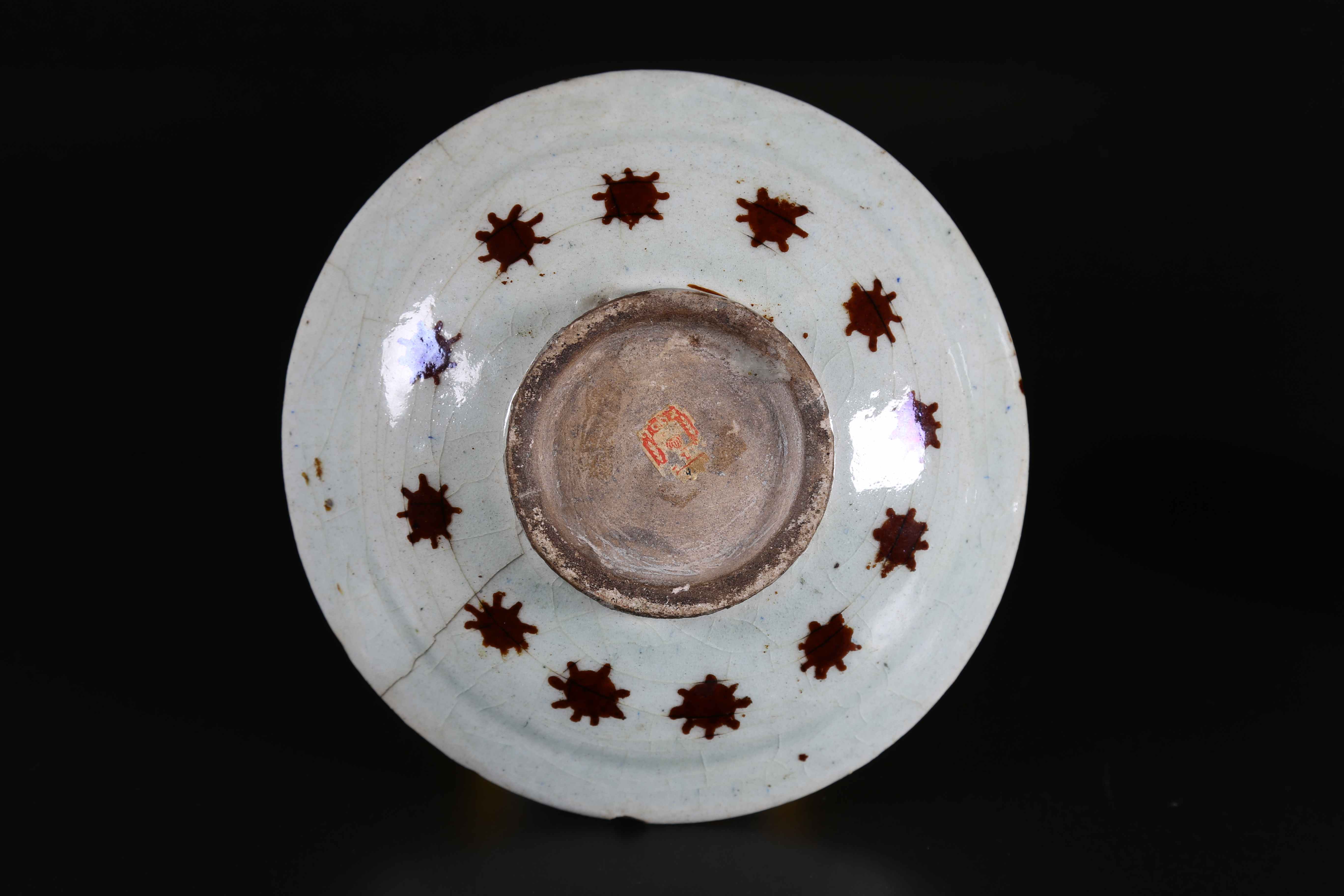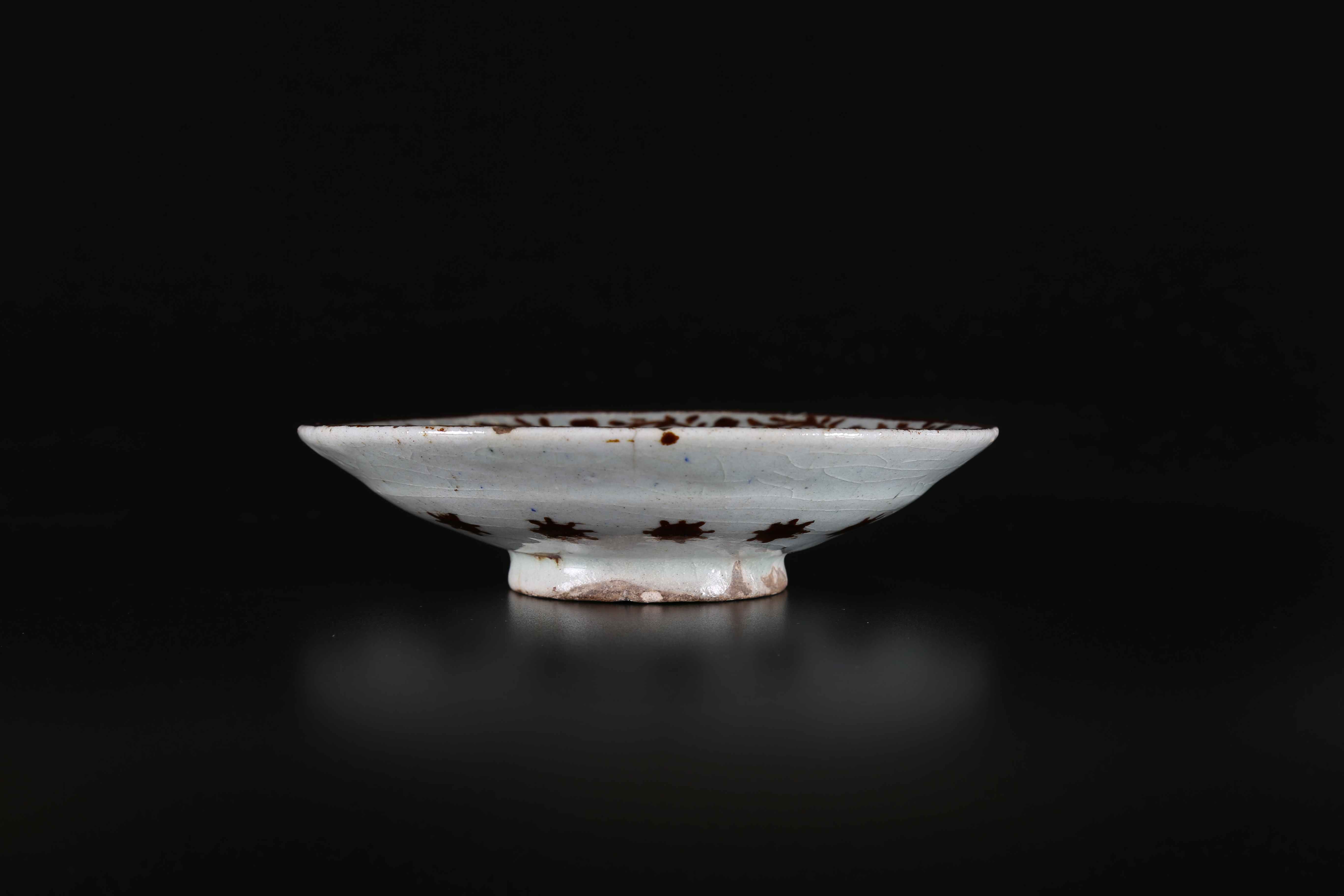 Iran, dinastia safavide, XVII secolo. -. Cm 19,00 x 5,00. Poggiante su disco, le pareti interne dipinte con motivo floreale ondulato ed il centro raffigurante un coniglio ed un uccello in un paesaggio appena accennato. L'esterno è decorato con una corona di piccoli cerchi con raggi.