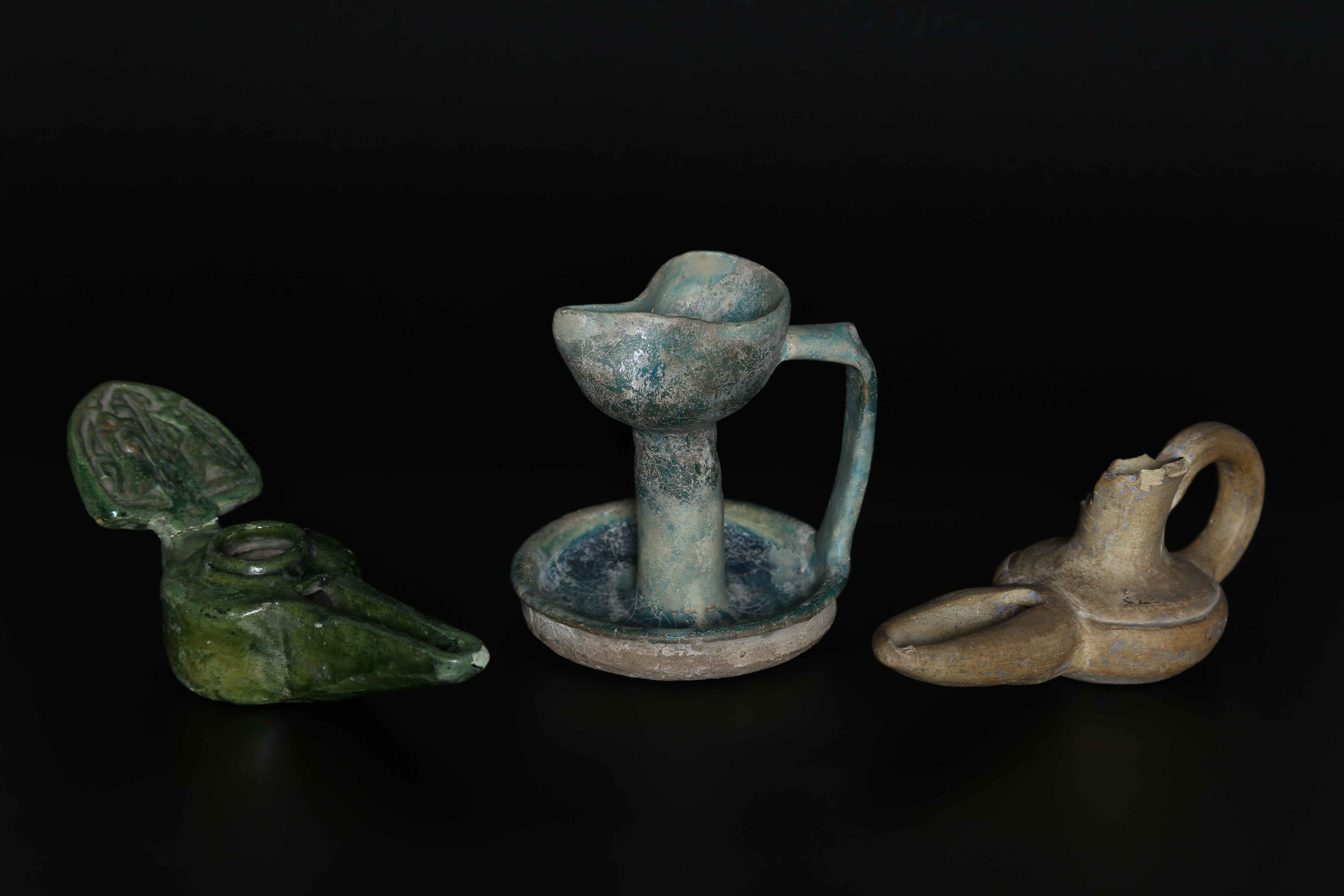 Arte Islamica Tre lampade ad olio in ceramica Iran, XI - XII secolo. . Cm...