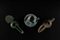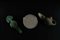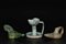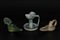 Iran, XI - XII secolo. . Cm 11,50. Lotto composto da tre piccole lampade ad olio mediorientali, due in ceramica invetriata di turchese e verde, l'ultima non presenta vetrina e ha parte del collo mancante. La coppa verde mostra due animali stilizzati affrontati sull'impugnatura e la turchese a forma d'orecchio, con iridescenza e cadute della vetrina.