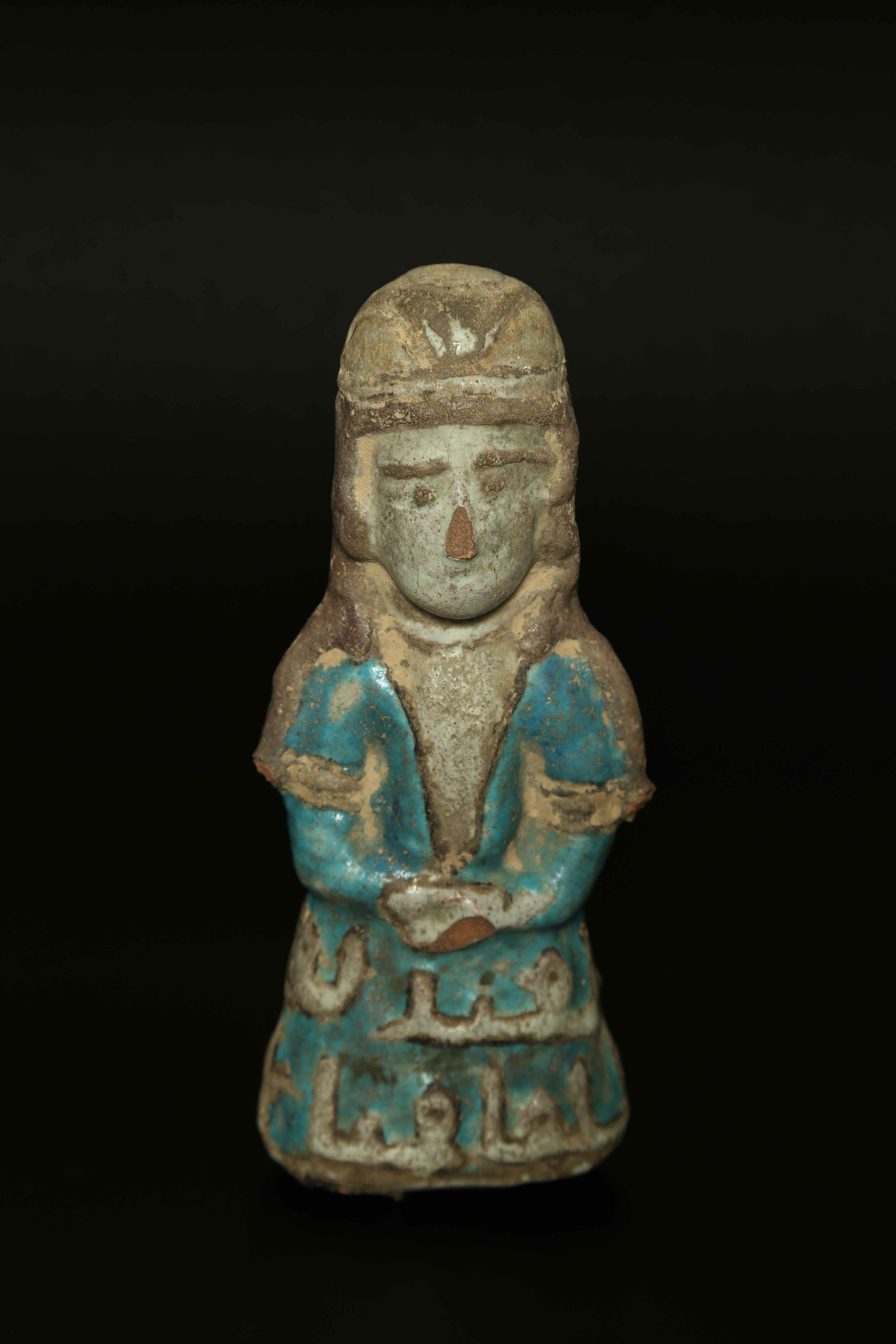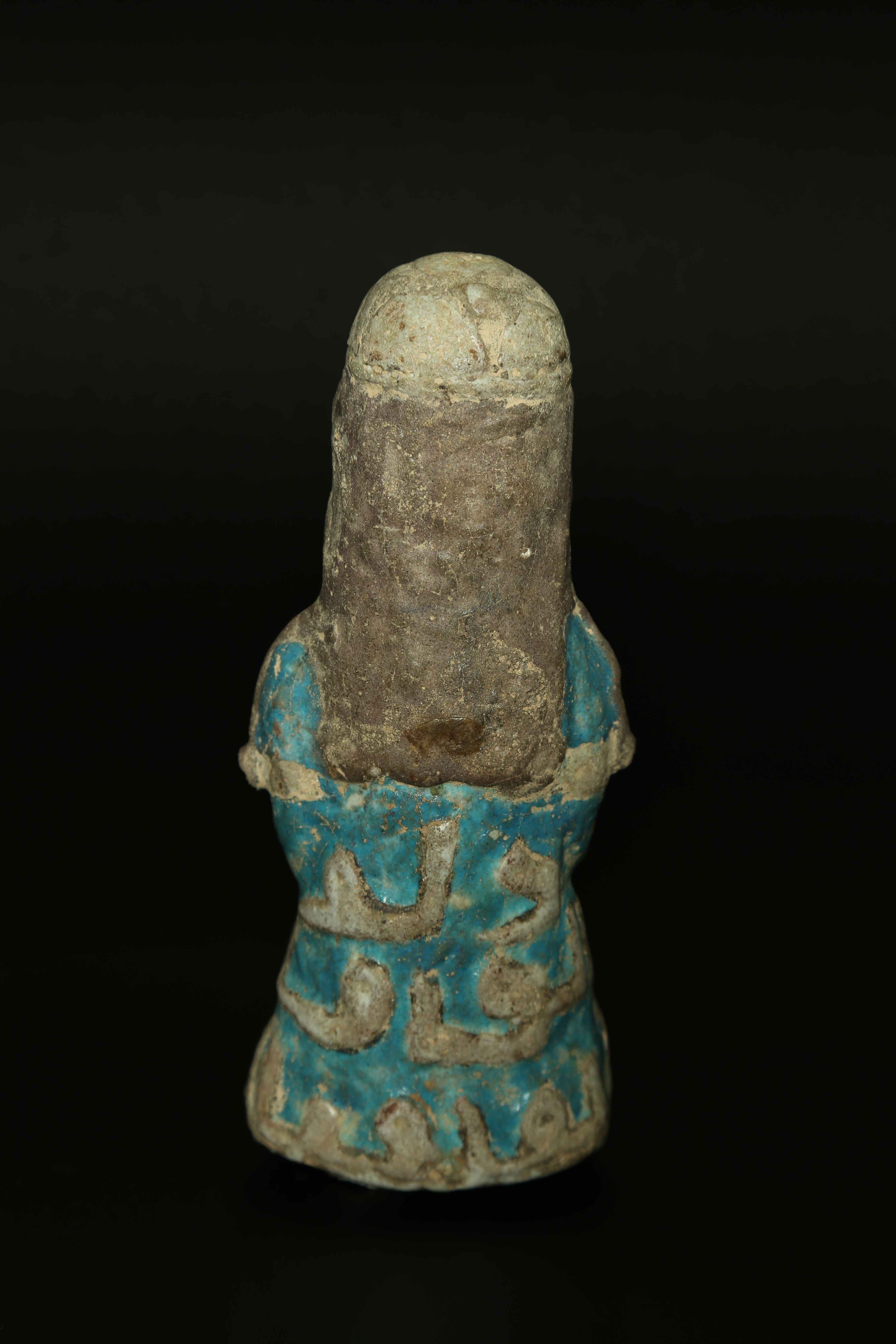 Terracotta stampata e smaltata . . Cm 17,00. Personaggio dai tratti somatici tipicamente mongoli, indossa un vestito turchese con decorazione epigrafica in arabo.