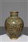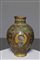 Ceramica smaltata . . Cm 37,00. Poggiante su disco, con ampio corpo globulare e collo dritto, decorato con fasce orizzontali contenenti elementi vegetali nelle tonalità del verde, del giallo e del blu. Un'ampia riserva circolare nel centro reca l'effige di un turco riconoscibile per l'ampio turbante di tipologia ottomana.