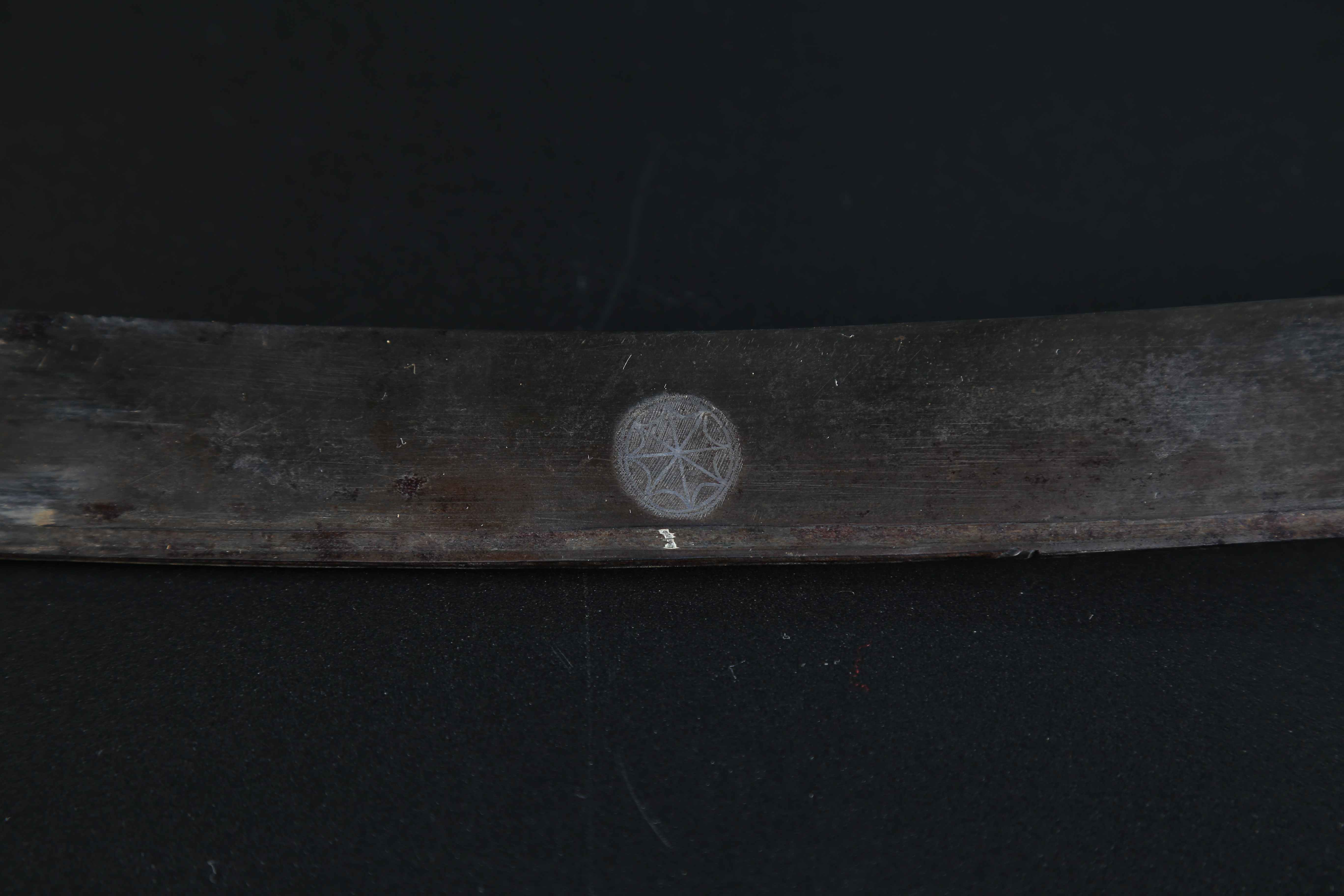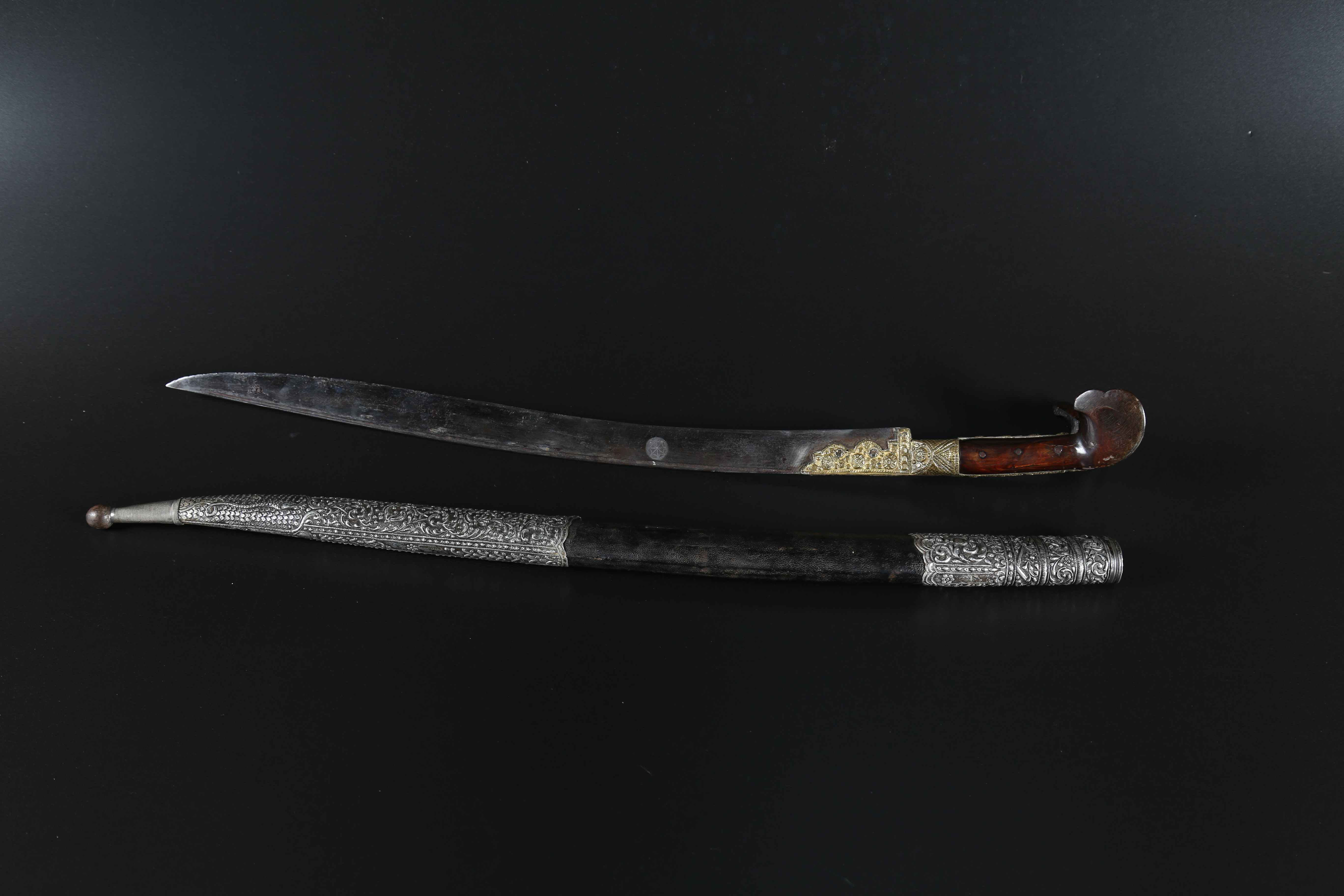 Arte Islamica A Turkish Yatagan with leather and embossed silver scabbard, dated 1270 (1849) Turkey, half 19th century. . Cm 112,00. A beautiful Yatagan with wooden handle embellished with an embossed golden plaque. This plaque shows plant motifs which embellish a part of the blade that is decorated with carved arabesques and a rectangular frame where "property of Ahmad 1270" is written. (1270 refers to 1849 AD.) The leather sheath has its extremities embellished with an embossed silver foil with floral motifs.