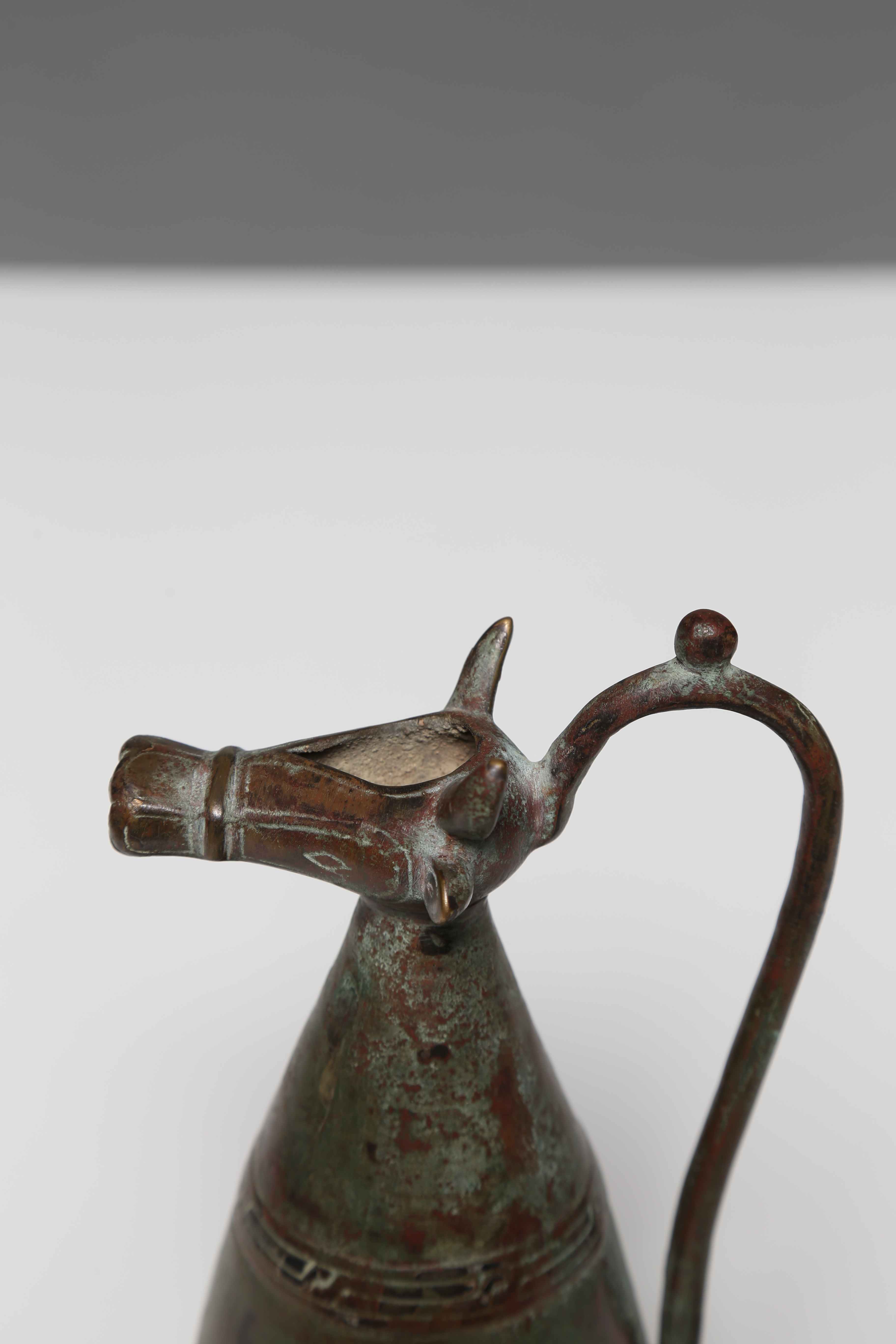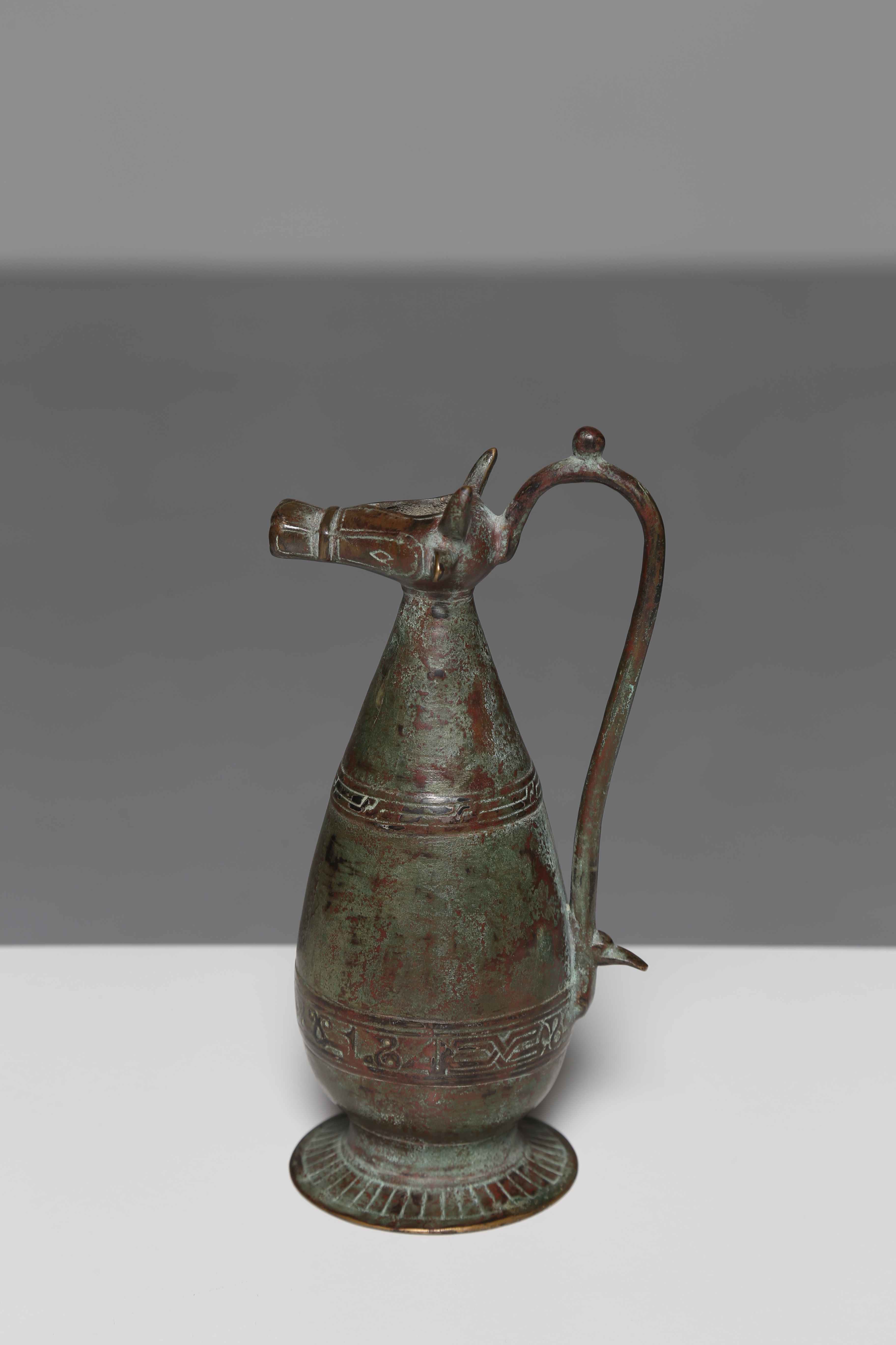 Iran Orientale, Khorasan, XII - XII secolo. . Cm 21,00. Piccolo versatoio in metallo con corpo piriforme, testa zoomorfa e poggiadito a pomello sull'ansa. Due sottili fasce con scritte in cufico ornano il manufatto.