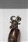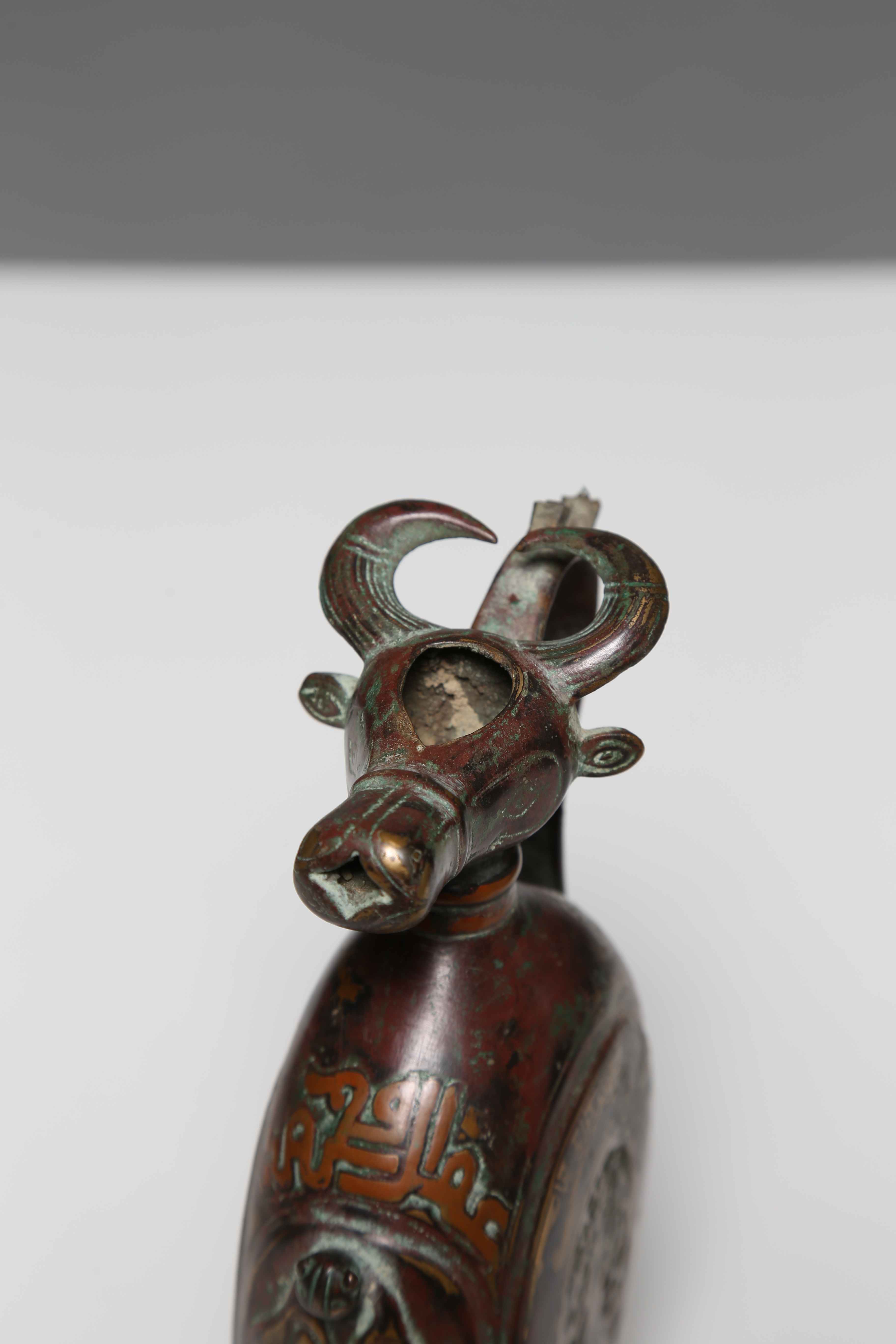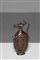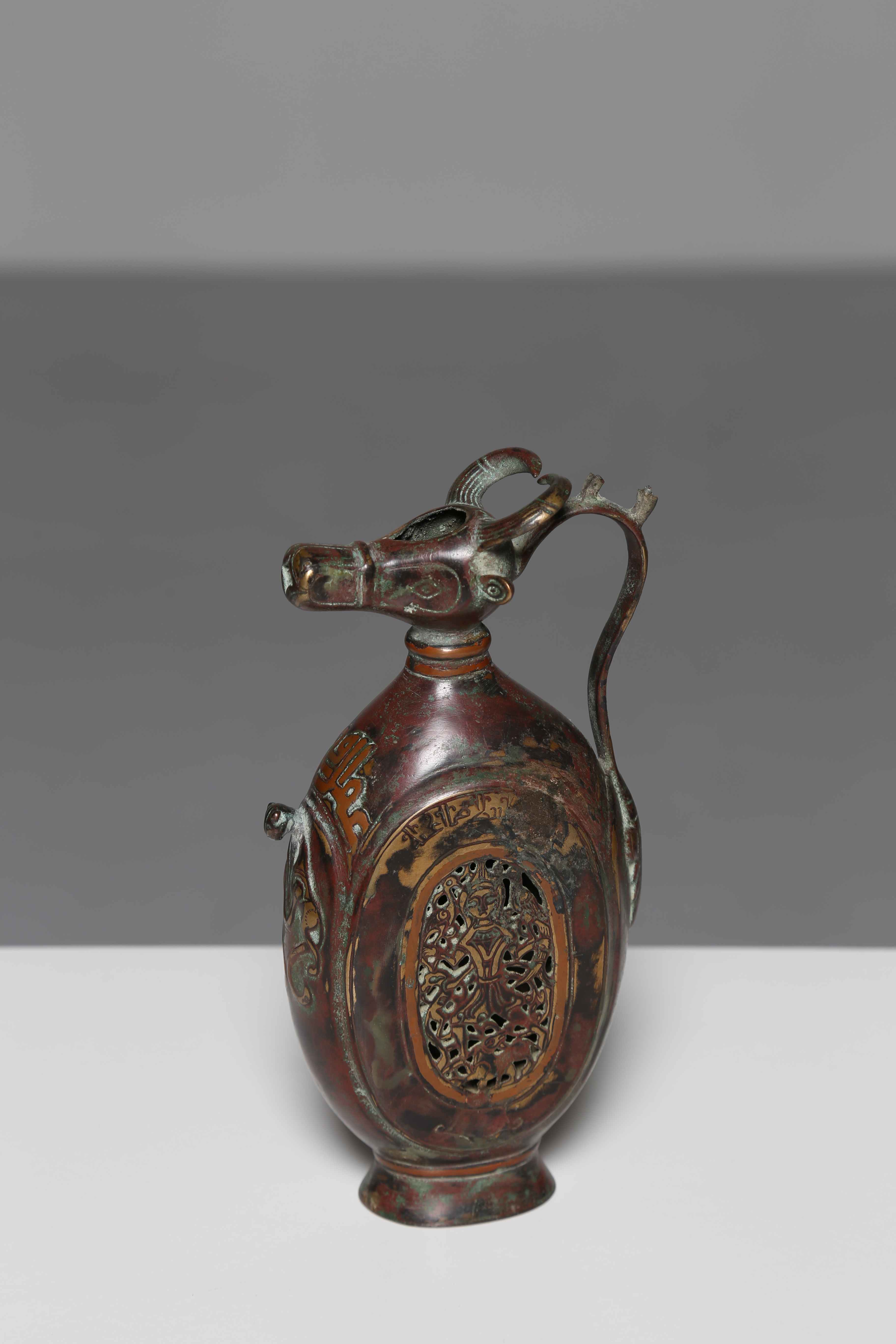 Iran Orientale, Khorasan, XI - XII secolo. . Cm 20,00. Piccola brocca con corpo piriforme e terminazione a testa bovina stilizzata. Decorata con lavorazione centrale a giorno da cui emergono figure umane e animali entro riserve ovali sormontate dall'incisione riferita al Profeta. Su un fianco due leoni stilizzati affrontati, sull'altro fianco un'ansa ricurva con poggiadito rotto si innesta sulla base della testa zoomorfa che funge da versatoio.