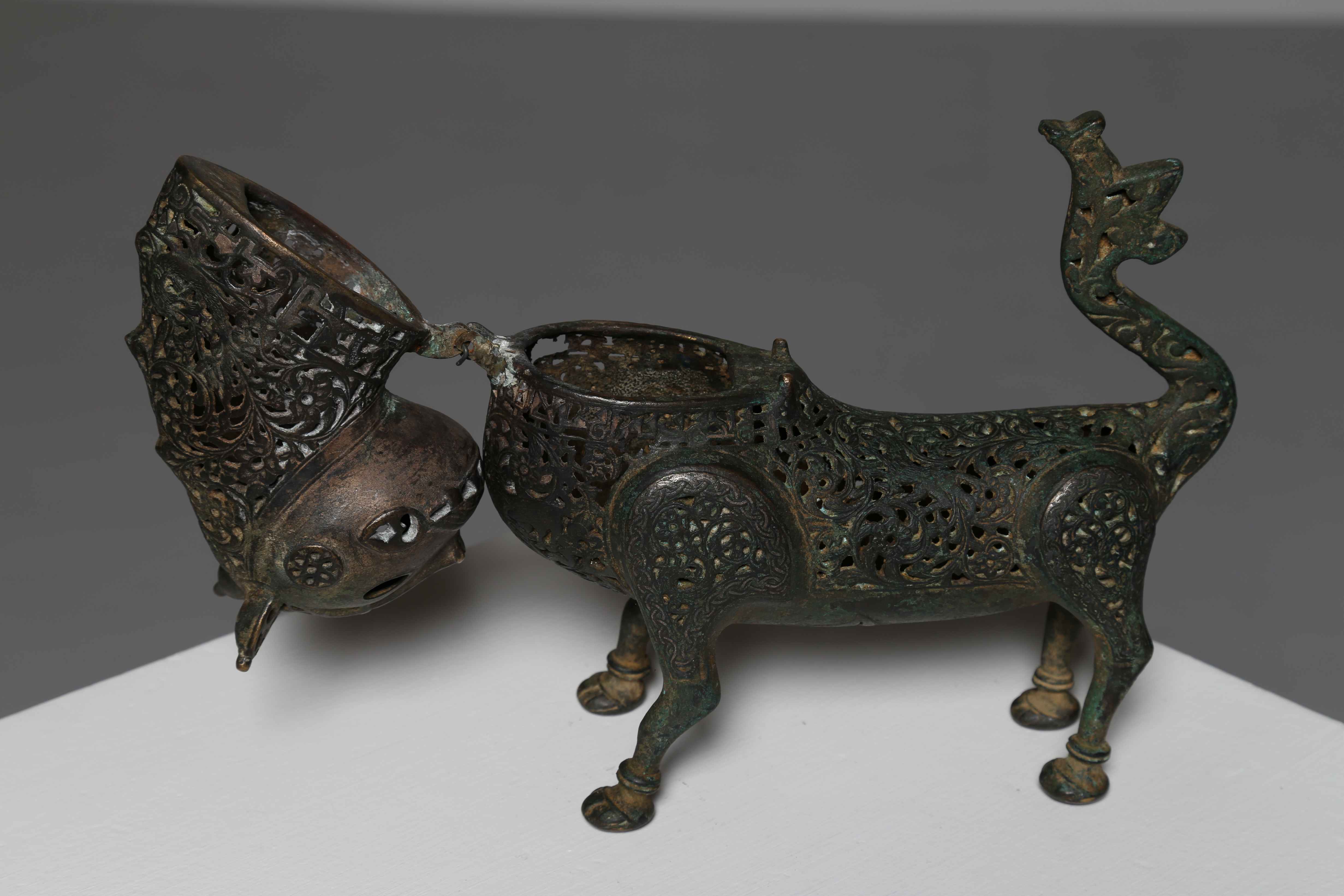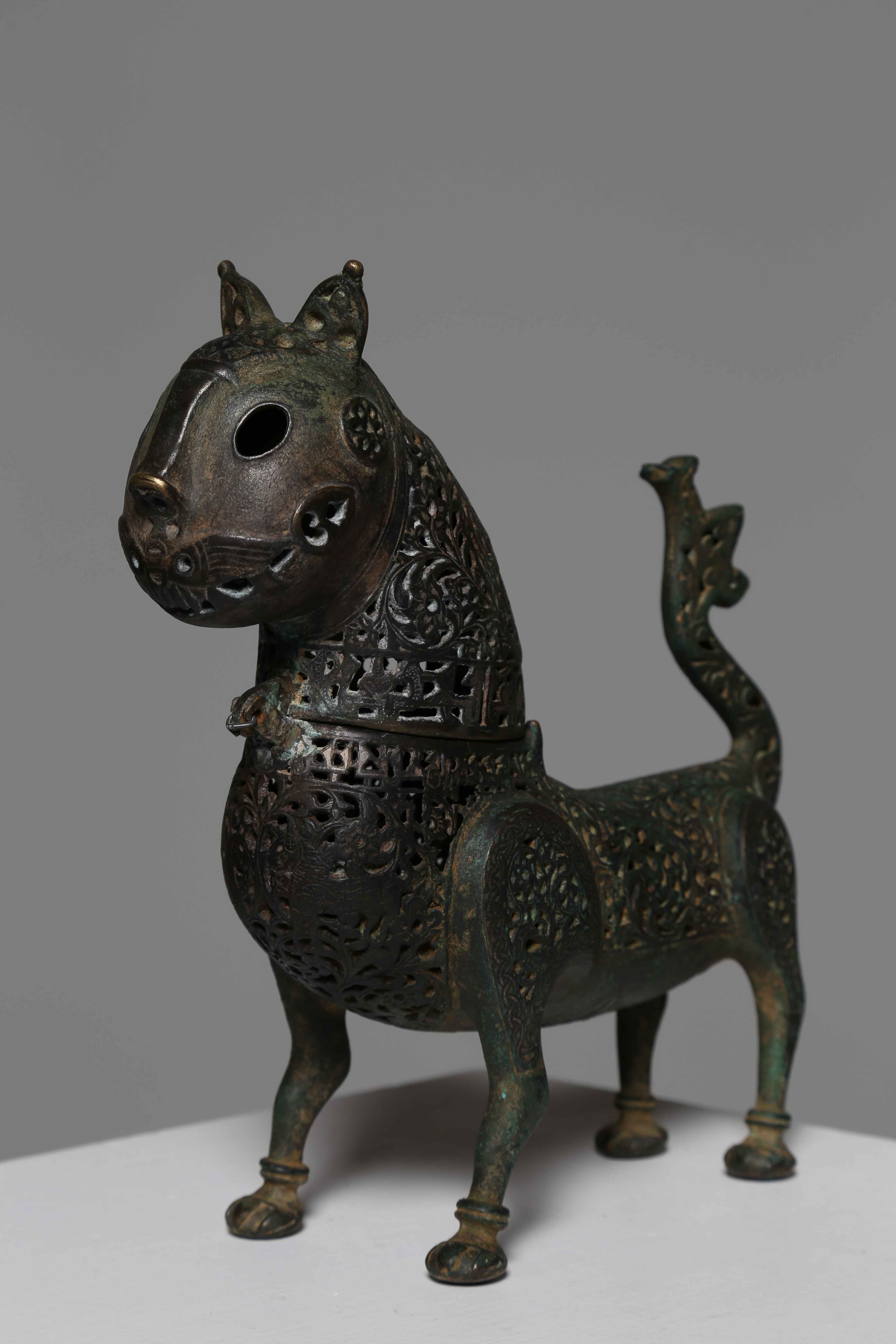 . . Cm 25,00 x 27,00. Incensiere a forma di felino stilizzato decorato con una profusione di motivi floreali a traforo e lunga coda (che forse fungeva da manico) terminante con tre punte. Una cerniera rende apribile l'oggetto muovendo la testa ed il collo, abbellito alla base da una fascia di iscrizioni o pseudo tali in cufico. Due quadrupedi affrontati si stagliano sul petto della fiera, appena sotto la cerniera, mentre gli occhi cavi lascerebbero intendere che in origine l'incensiere potesse essere rifinito con due intarsi in ceramica invetriata, come nell'esemplare esposto a Roma, alle Scuderie del Quirinale in occasione della mostra "Arte della Civiltà Islamica", conclusasi lo scorso Settembre. Per un altro esemplare comparativo si veda quello conservato al Musée du Louvre (Accession Number AA19).