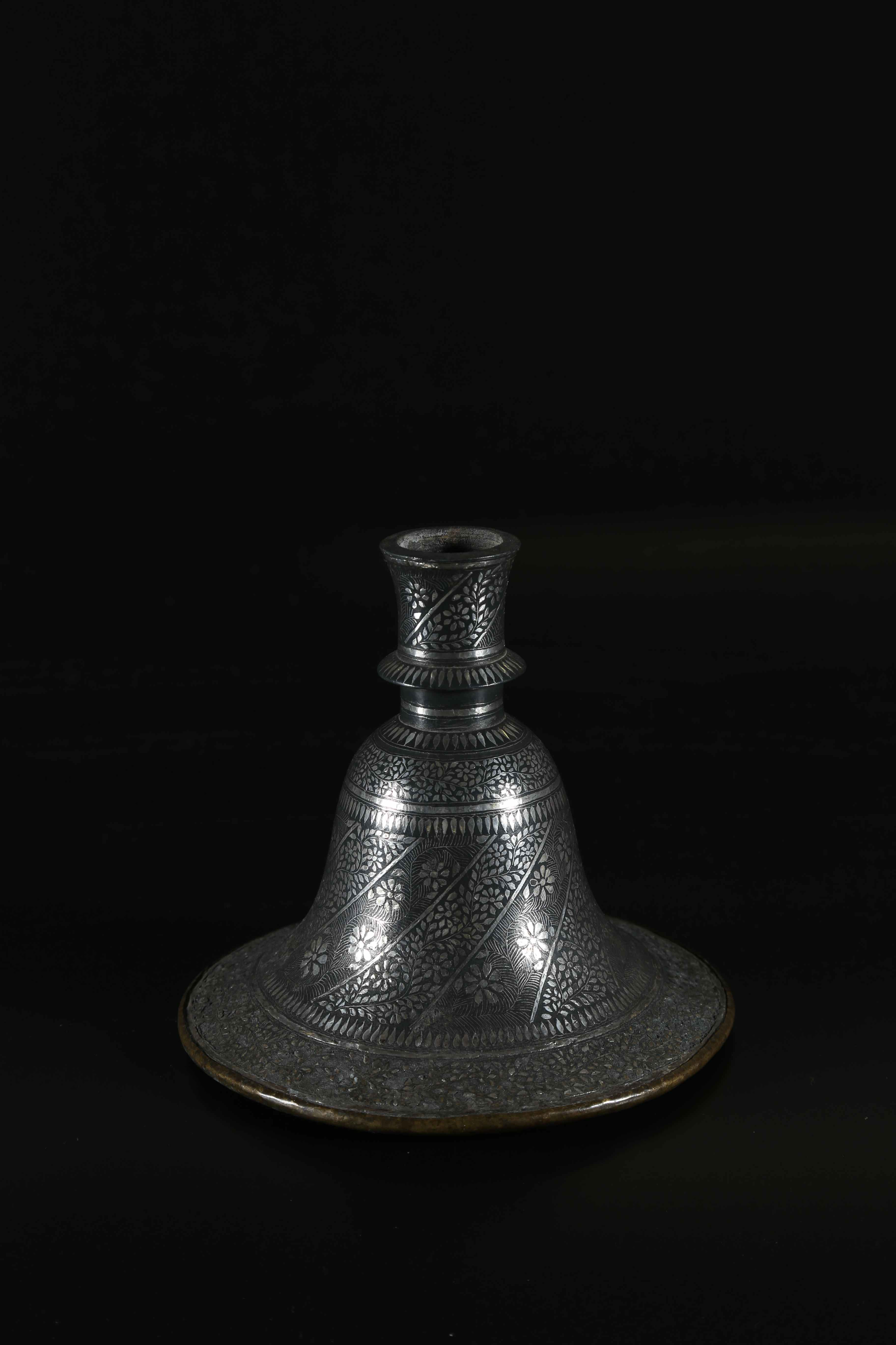 lega metallica con intarsi in argento . . Cm 19,00. Base per huqqa a forma di campana. Il bordo della base finemente decorato con fiorellini intrecciati, il corpo ed il collo con sottili pannelli floreali arrangiati a spirale.