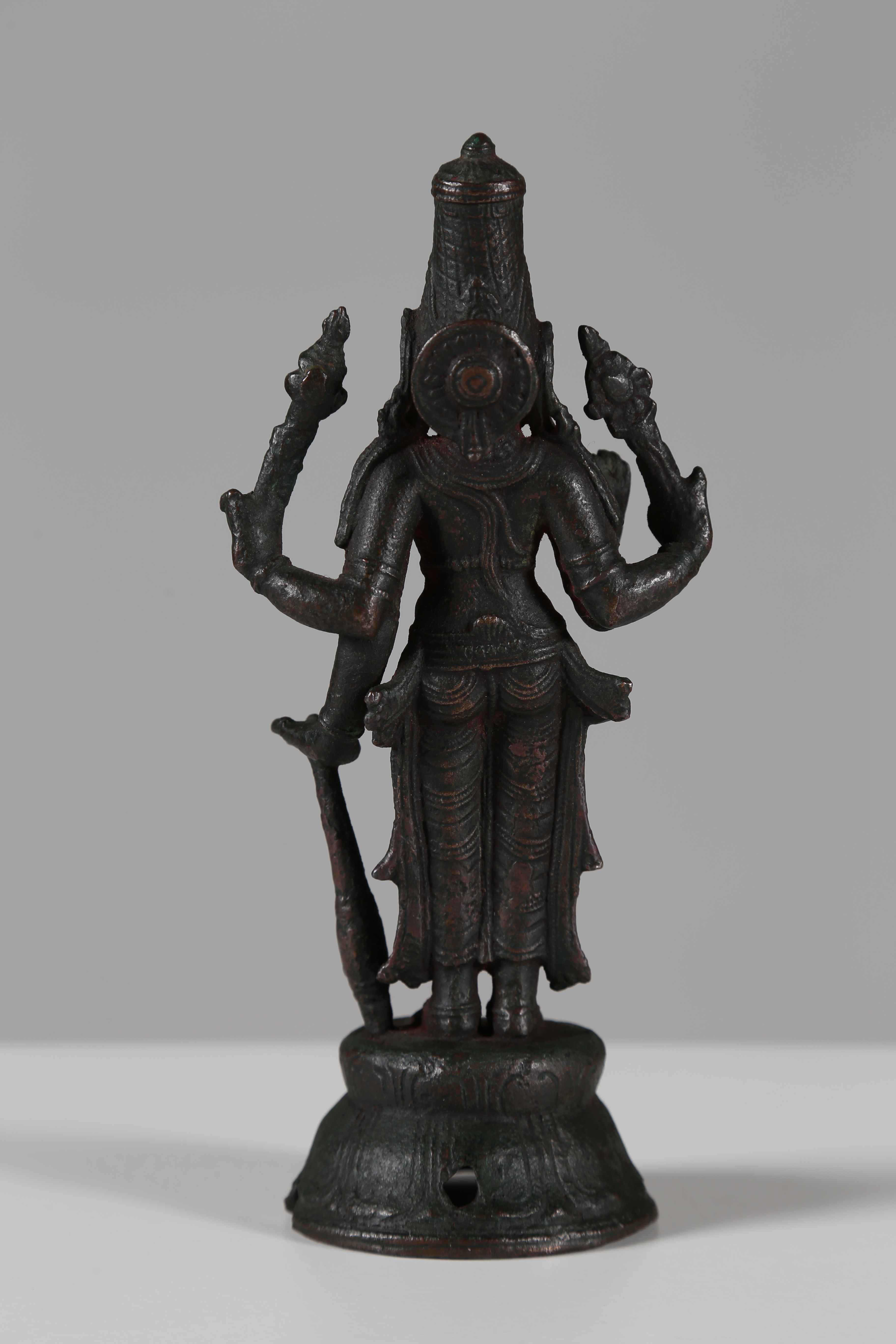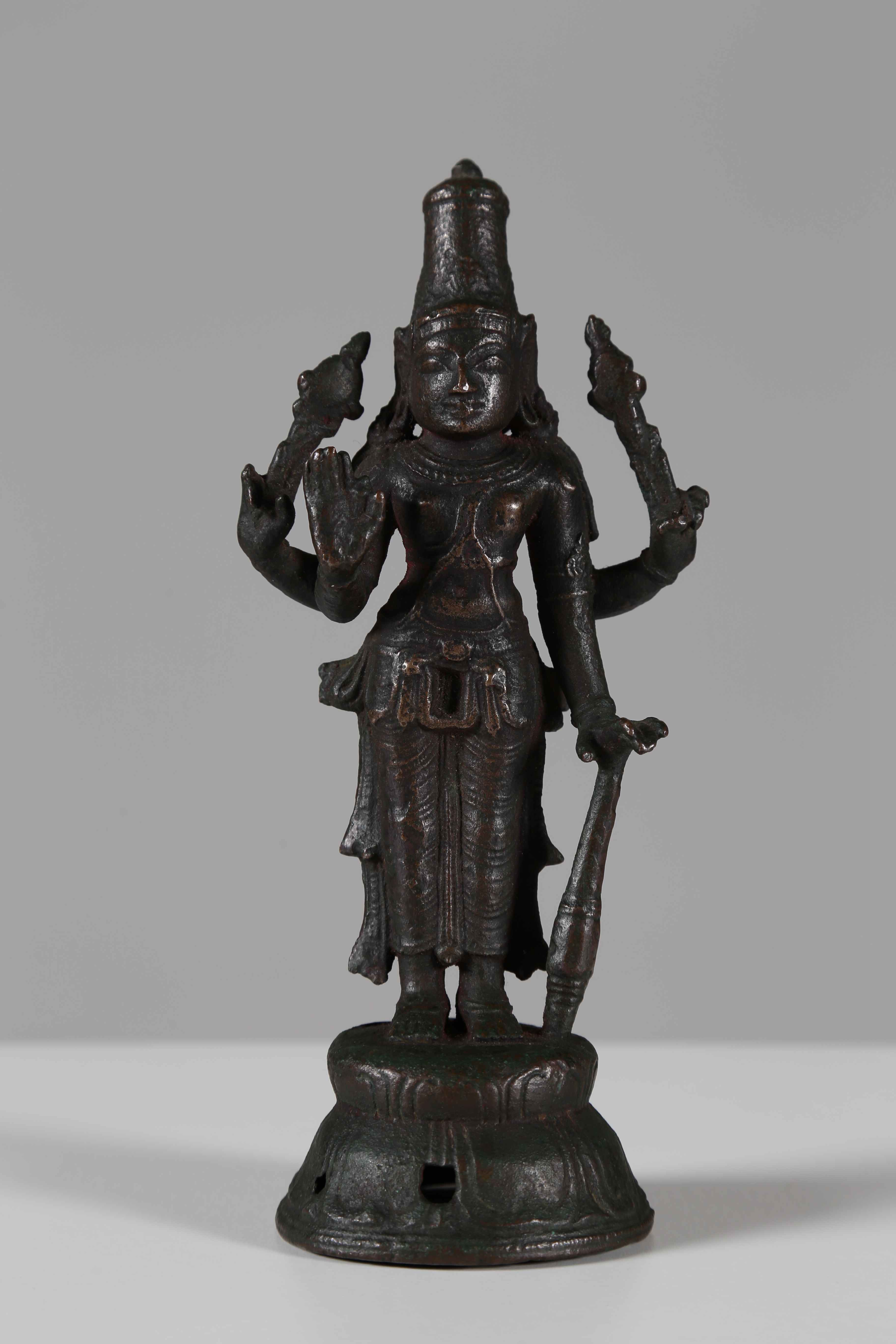India meridionale, Tamil Nadu, periodo Chola, XI secolo . -. Cm 6,30 x 19,00. Stante su una base a loti multipli, la divinità reca nelle molteplici mani alcuni degli attributi tipici tra cui: la clava, la mazza e la conchiglia. L'ornamento circolare sulla nuca è tipico della produzione Chola.