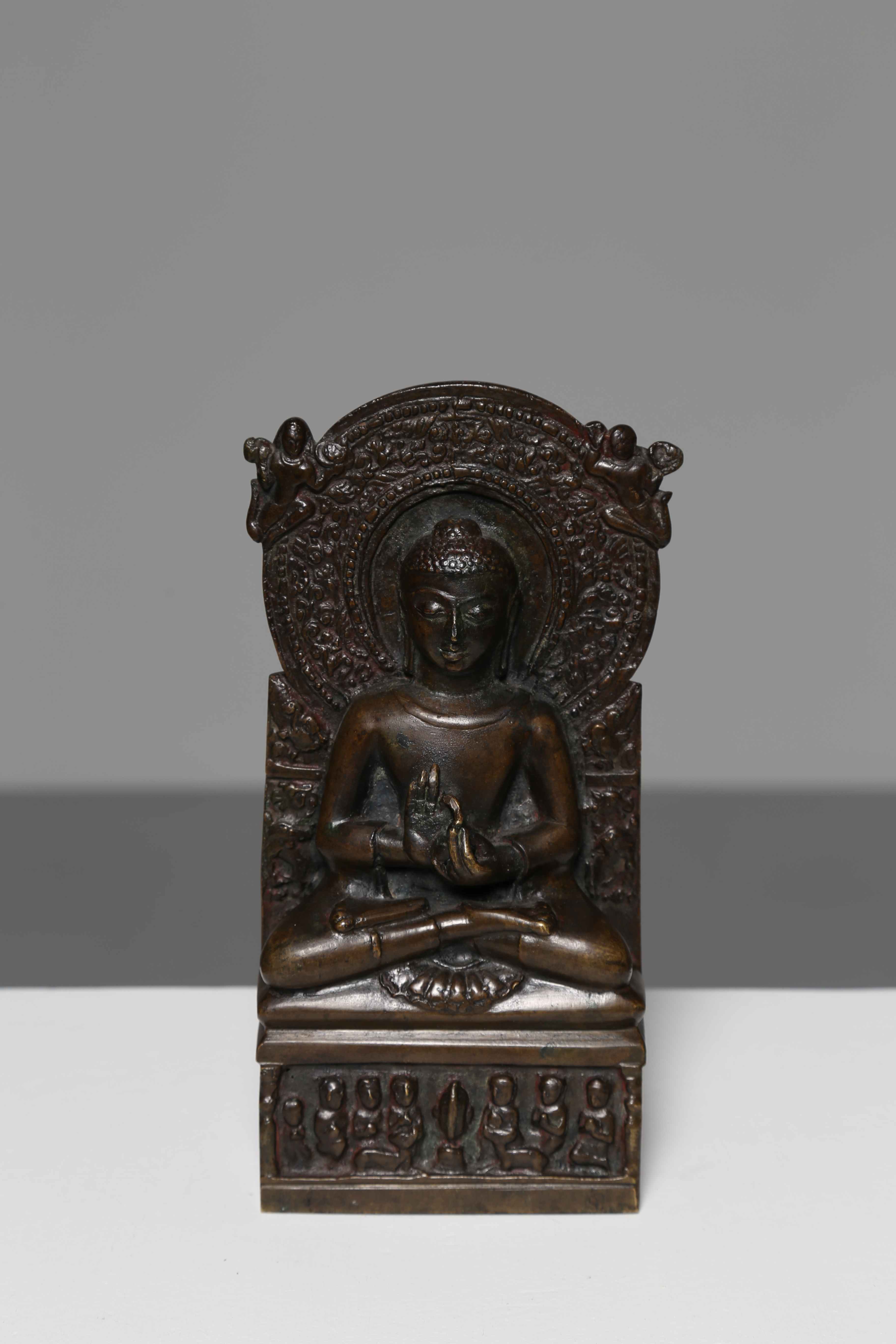 India, XVIII secolo. . Cm 26,00. Bronzo raffigurante Buddha seduto in Vajrasana e con le mani in dharmachakra mudra, la ruota del dharma, una gesto che simboleggia il momento in cui Buddha Sakyamuni predicò ai suoi compagni il primo sermone dopo l'illuminazione nel parco dei cervi di Sarnath.