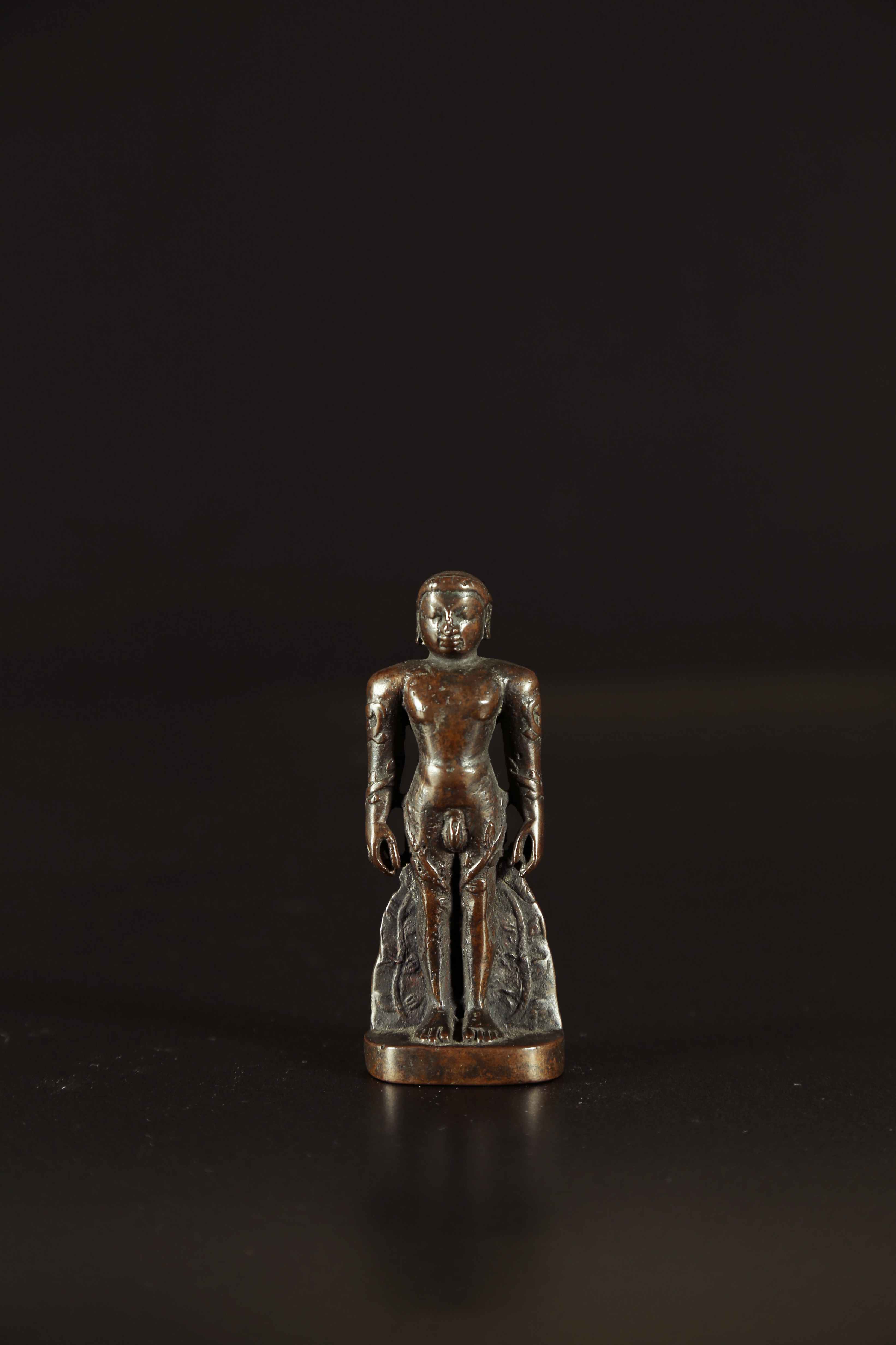 India, 12th century. . Cm 4,00 x 10,50. This sculpture portrays Bahubali, son of the first tirthankara and founder of Jainism. He is often depicted with plants and leaves on his legs: the legend states that such vegetation grew over his lap after Bahubali remained for an entire year in Kayotsarga position to meditate.