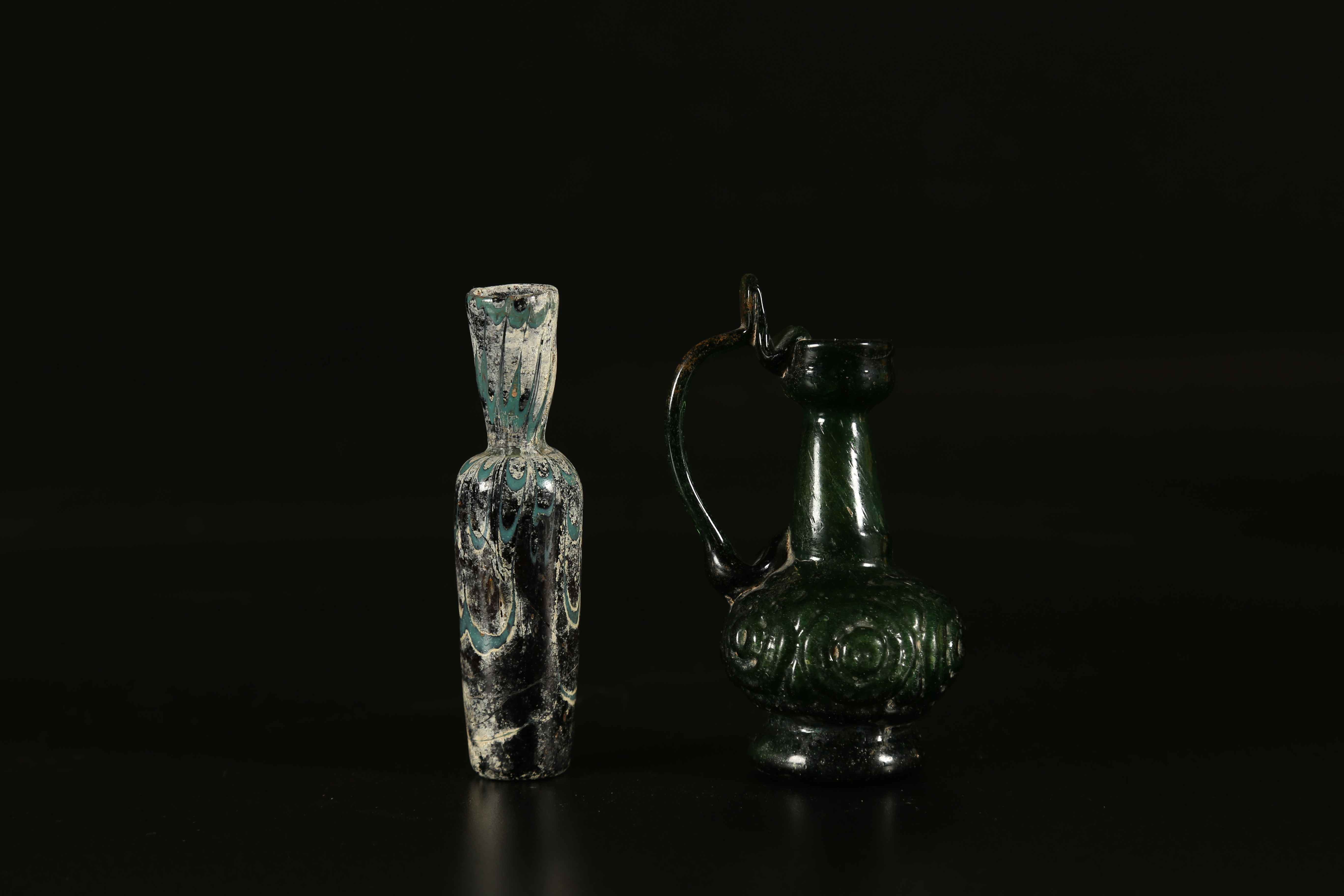 Arte Islamica Two small Islamic glasses: a ewer and a marvered glass bottle Iran, 10th - 11th century Egypt or Syria, 10th century. . Cm 10,50.