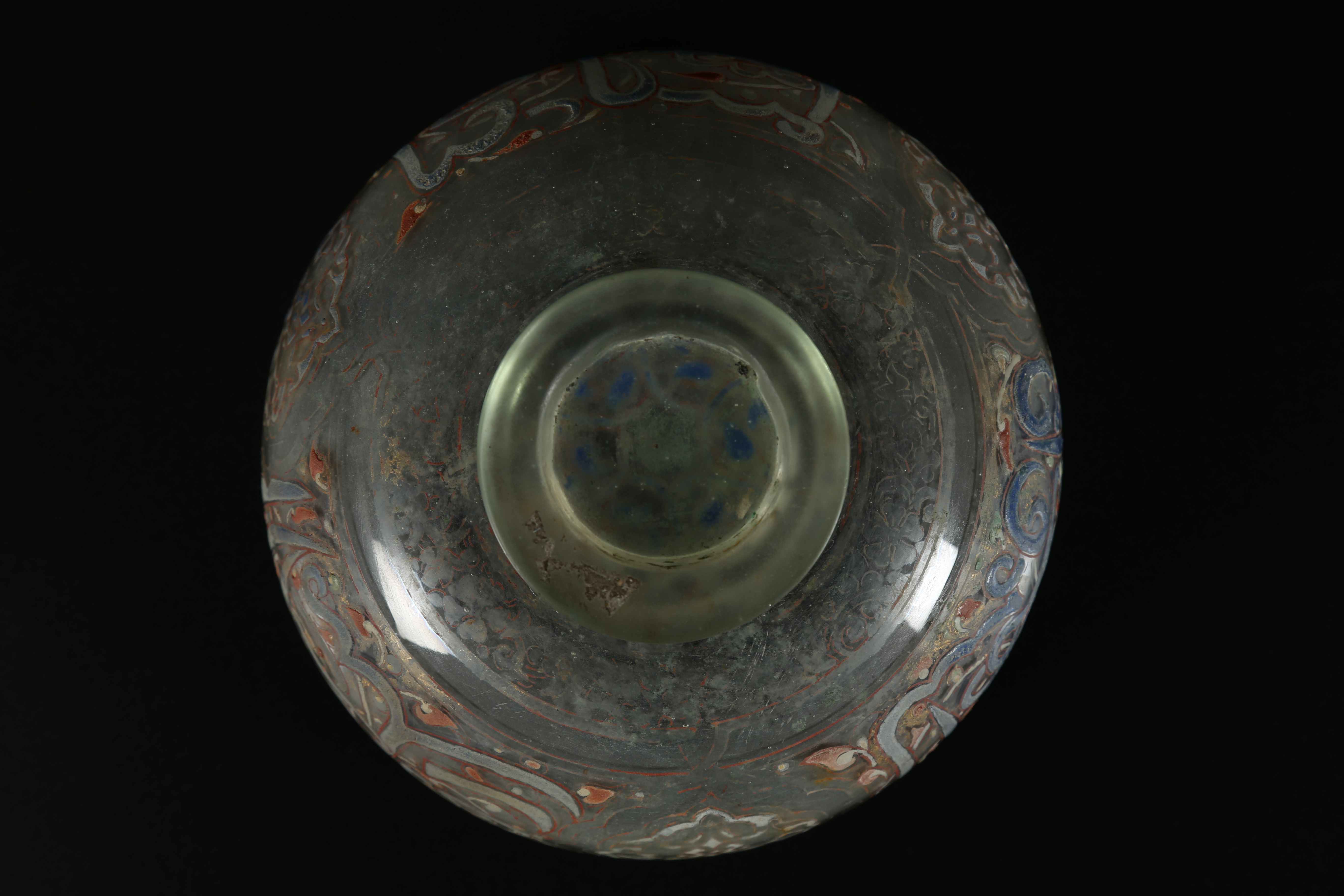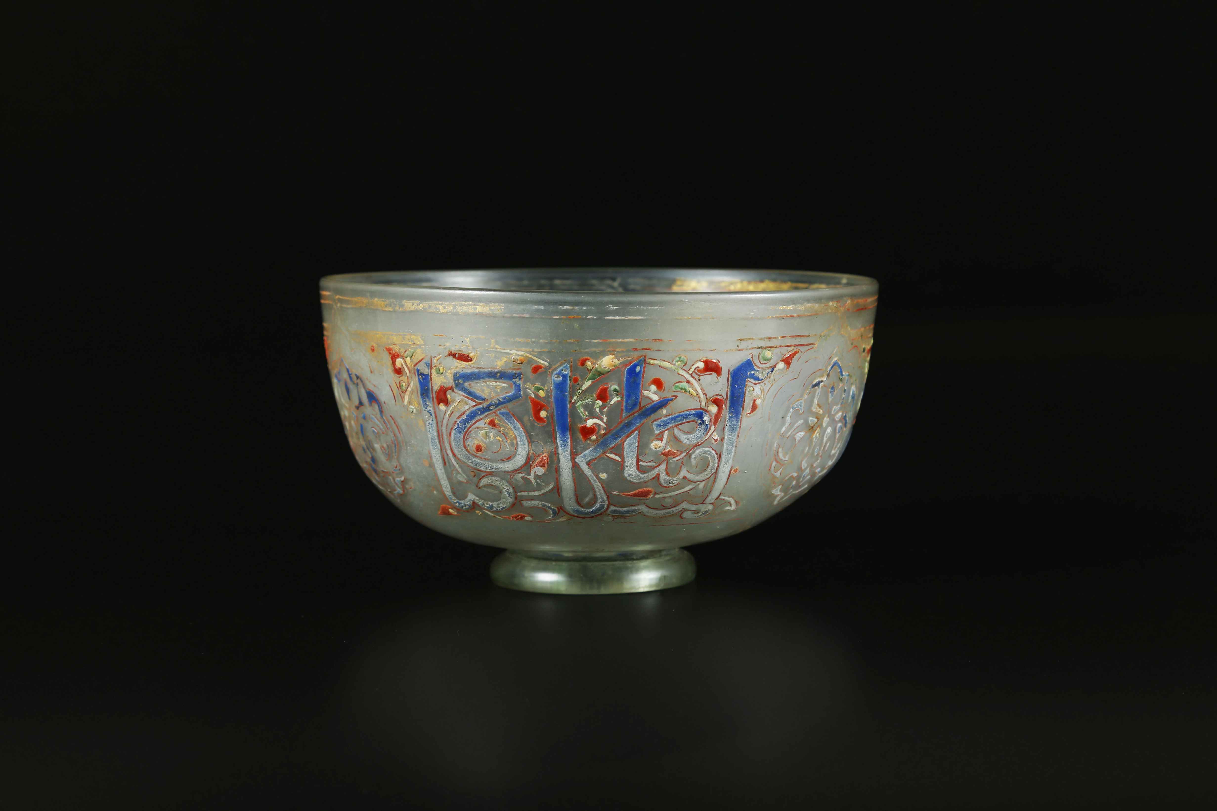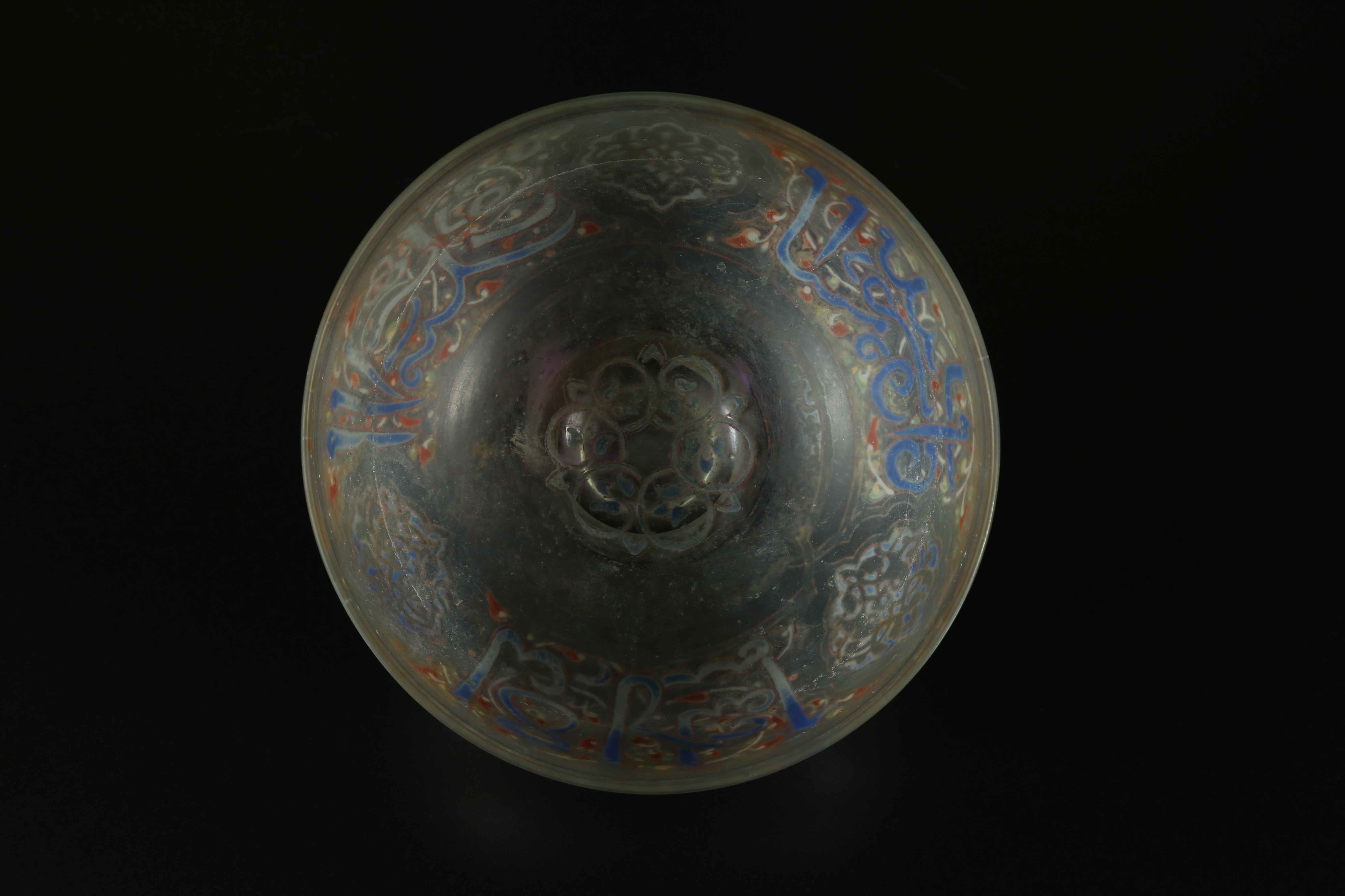 Vetro inciso e smaltato. . Cm 17,00 x 9,00. La bella coppa poggia su disco e mostra una decorazione epigrafica alternata a medaglioni con arabeschi smaltati di blu e rosso.