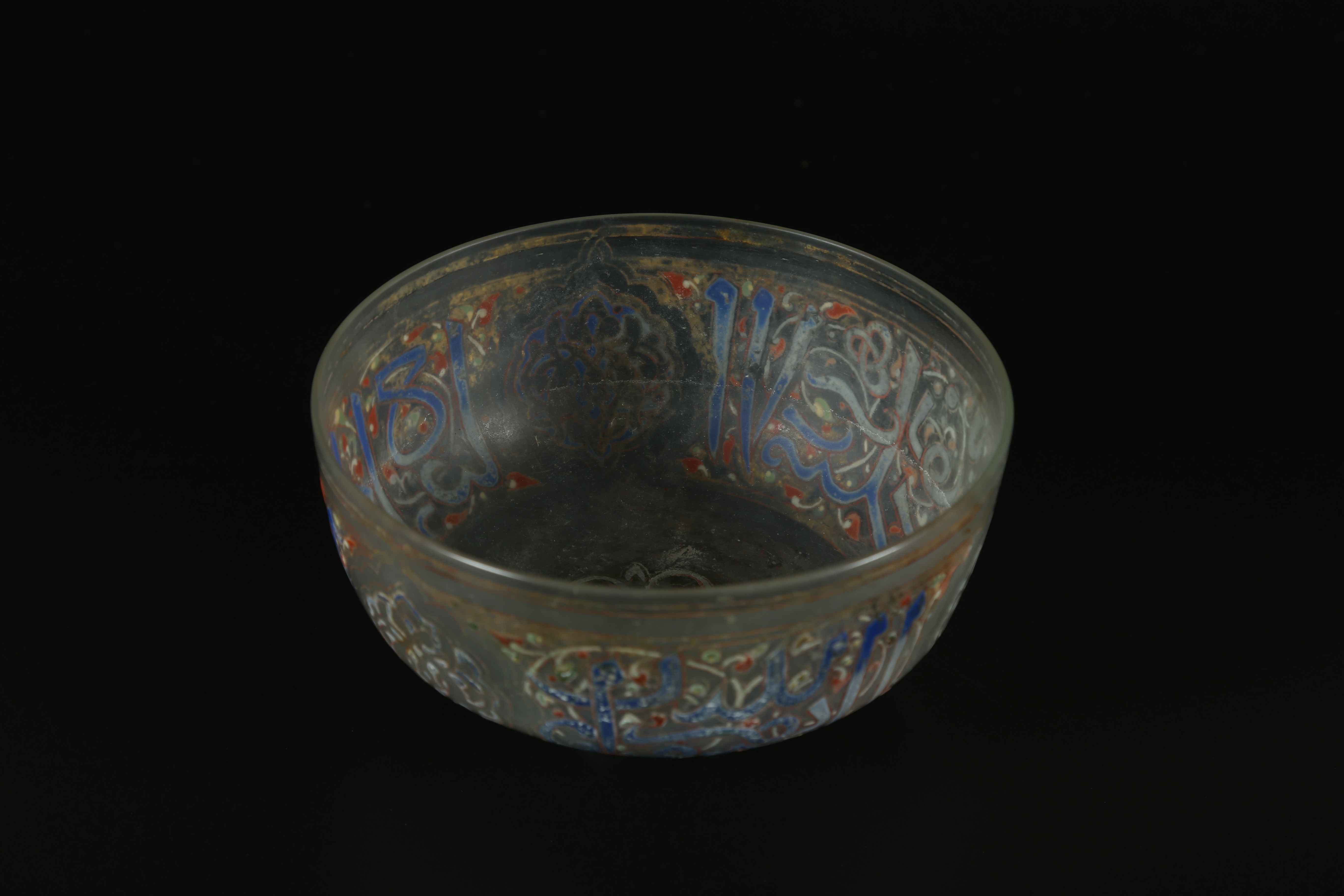 19th century or earlier . . Cm 17,00 x 9,00. This beautiful cup is placed on a disc and shows an epigraphic decoration with medallions and blue-and-red enamelled arabesques. The inscription says, "Allah is the Light of the heavens and the earth. The Parable of His Light is as if there were a Niche and within it a Lamp" (Quran, incomplete verse 24:35). The complete verse says, "Allah is the Light of the heavens and the earth. The Parable of His Light is as if there were a Niche and within it a Lamp: the Lamp enclosed in Glass: the glass as it were a brilliant star: Lit from a blessed Tree, an Olive, neither of the east nor of the west, whose oil is well-nigh luminous, though fire scarce touched it: Light upon Light! Allah doth guide whom He will to His Light: Allah doth set forth Parables for men: and Allah doth know all things". This is the Surah An-Nur (The Light), which is often written on the lamps used in mosques: in fact, the connection between the light and Allah is obvious. Therefore, although the quote is incomplete on this lot, maybe for the lack of space, probably the original function of this cup was liturgic.