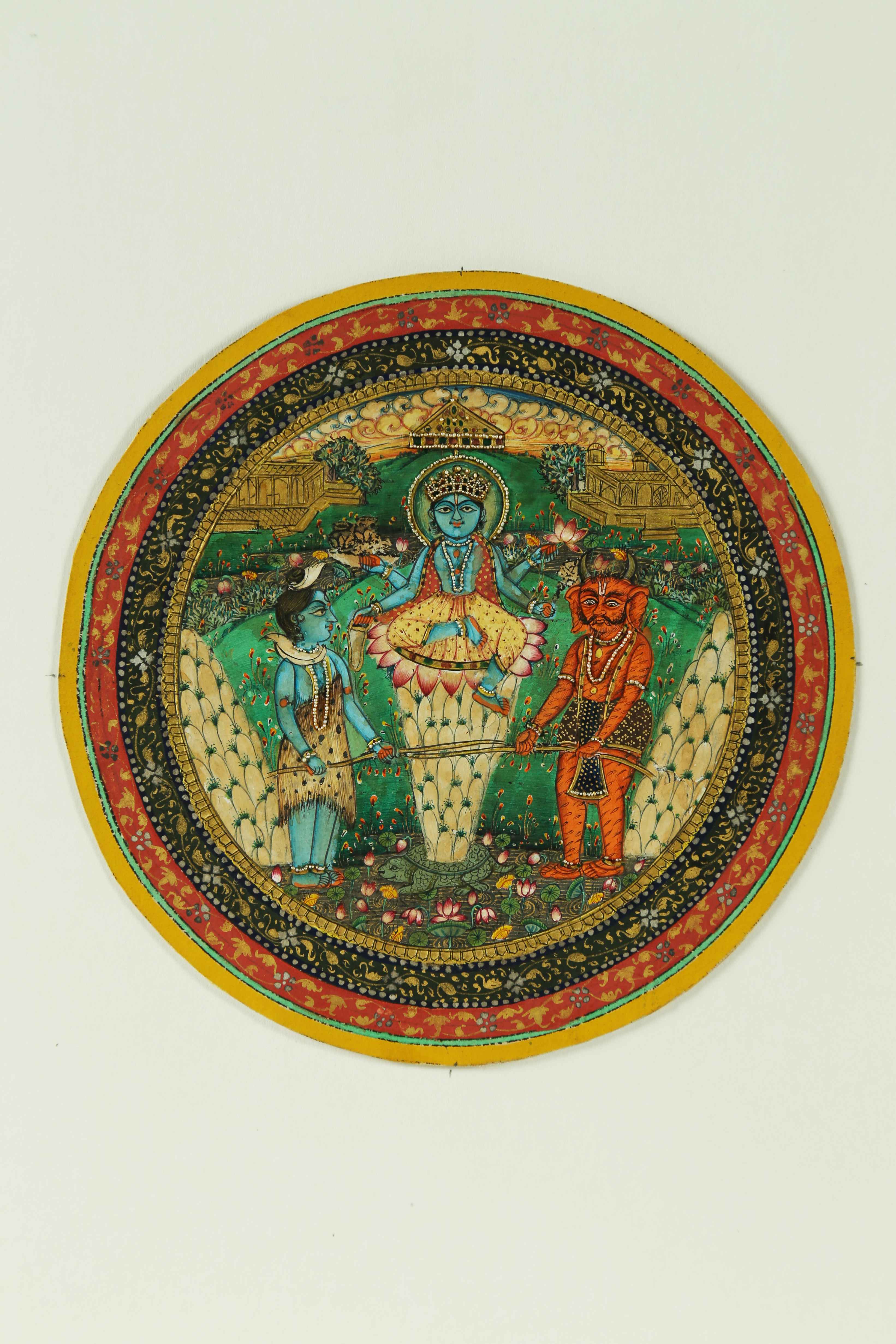 Arte Indiana Reliquario portatile raffigurante il frullamento dell'oceano di latte India, Jaipur, metà XIX secolo Pigmenti naturali, oro e perline su carta . -. Cm 15,00. Montato su passepartout: 33 X 33 cm