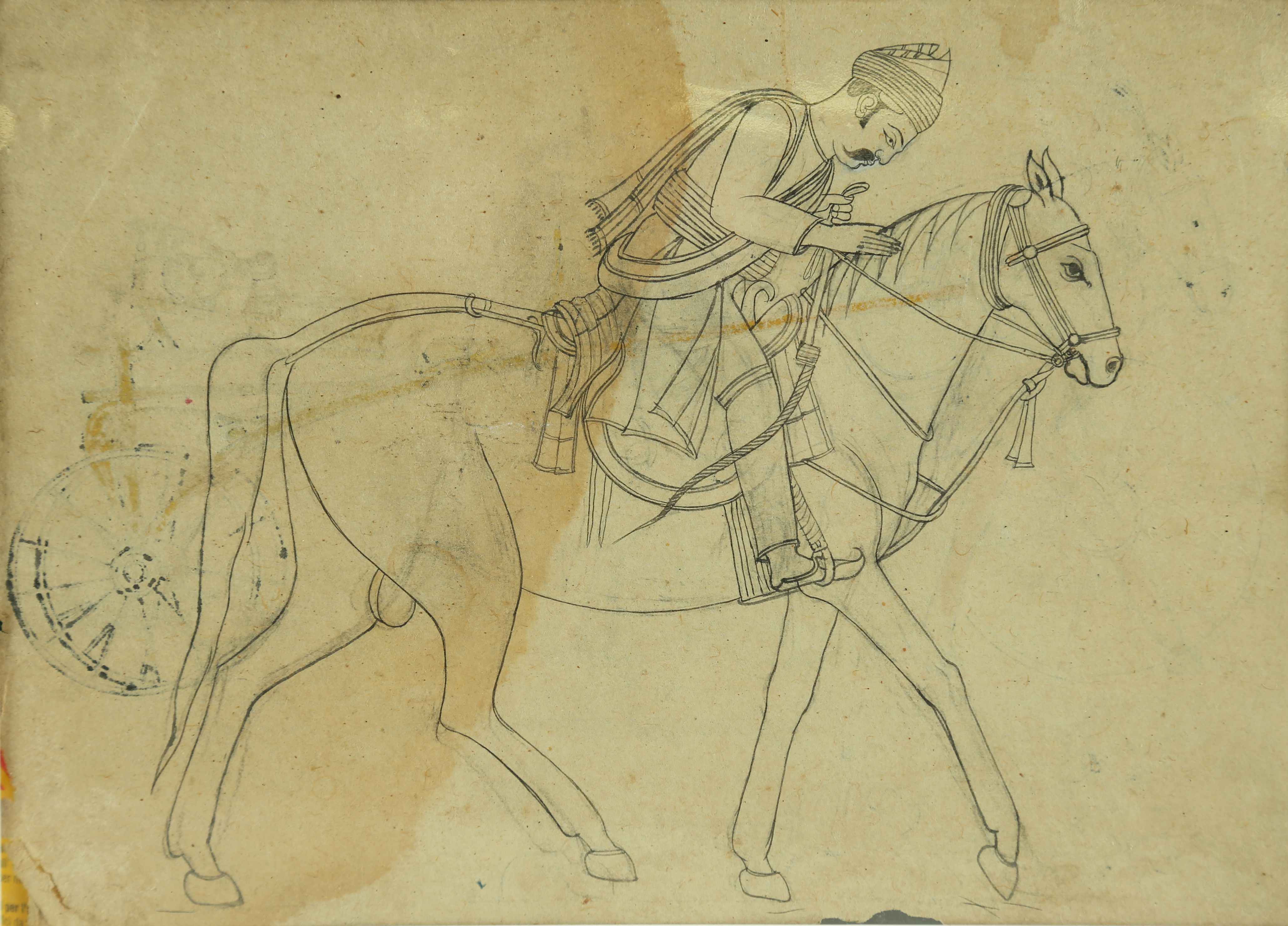 Arte Indiana Disegno preparatorio fronte e retro raffigurante cavalli e cavaliere