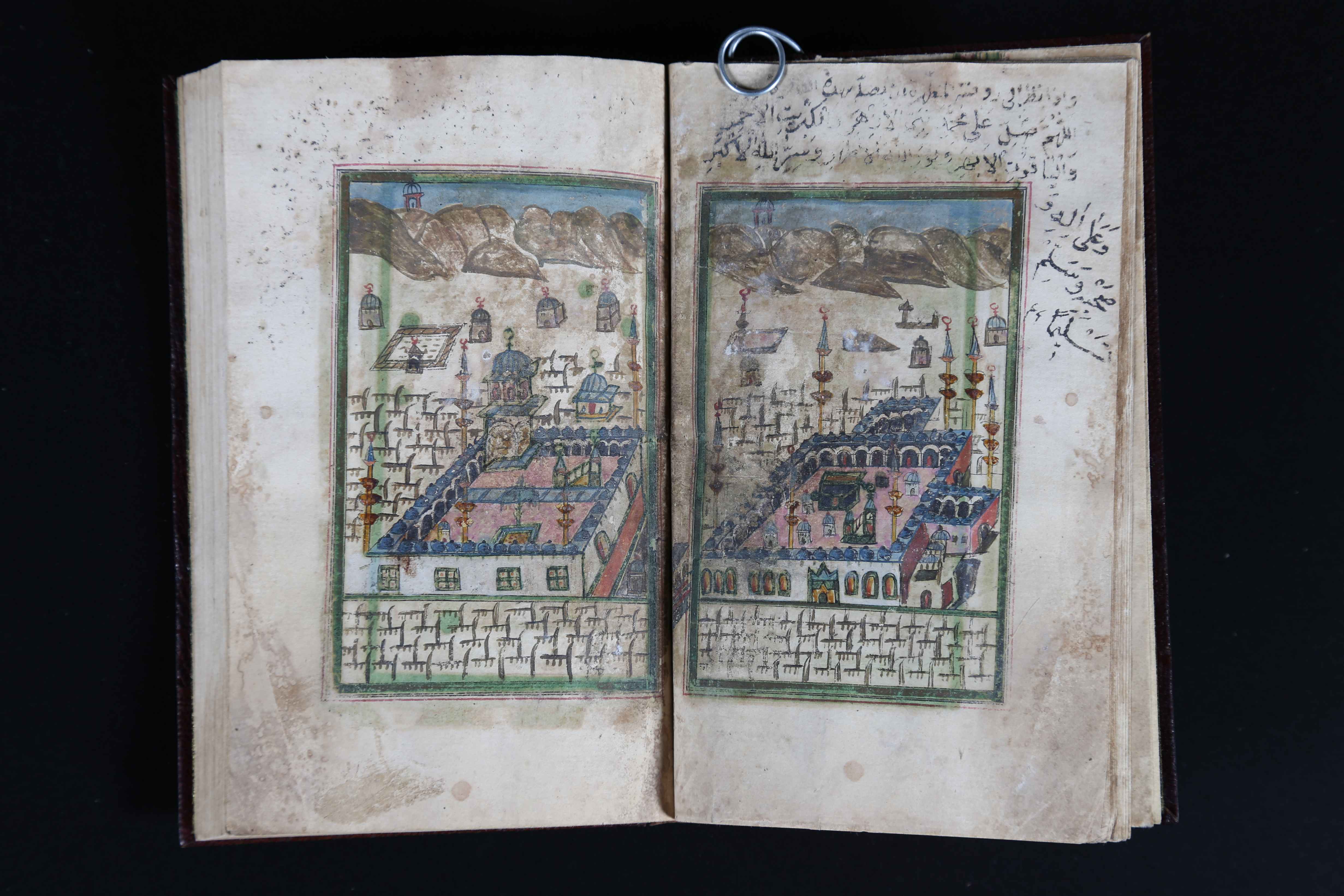 . . Cm 10,50 x 17,00. Piccolo libro devozionale, probabilmente un prontuario per pellegrini, con rilegatura il pelle decorata sui due lati con carta marmorizzata. All'interno il frontespizio dorato e verde, due illustrazioni di Mecca e Medina, una pagina con il timbro dell'autore ed il colophon che informa che il libro sia stato trascritto da Mohammad Al-Rezaiee nell'anno 1260.