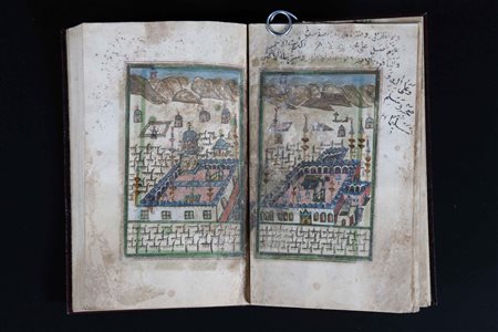 Iran or Turkey, 19th century. . Cm 10,50 x 17,00. This little devotional book, probably a manual for pilgrims, has a leather binding embellished with marbled paper. The first title page is colored in gold and green and has two drawings of Medina and Mecca. There is a page with the author's stamp and the colophon says that the book was transcripted by Mohammad Al-Rezaiee in 1260 AD. Part of the book has been renovated.
