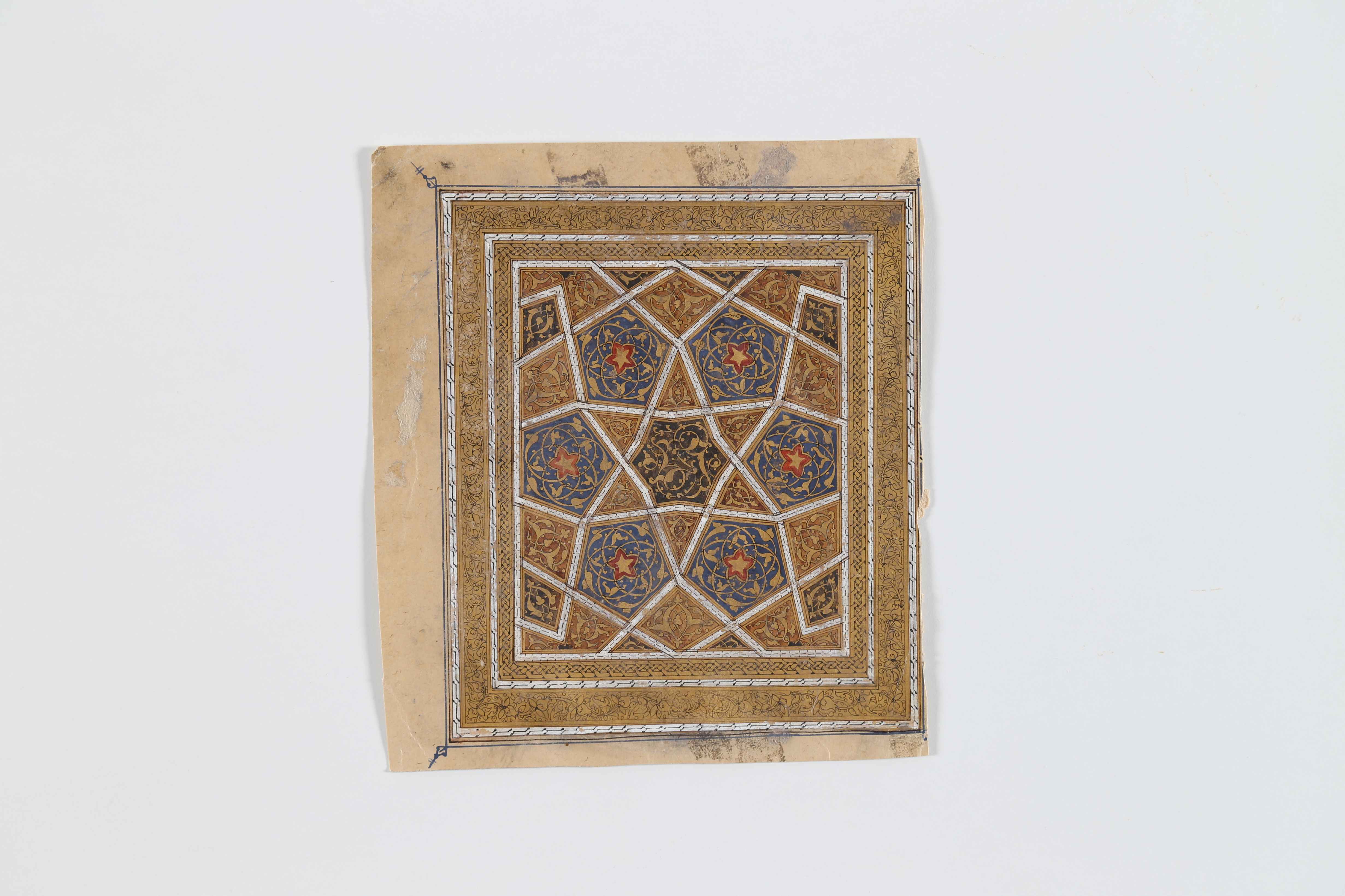 . -. Cm 20,20 x 23,50. Pagina decorata con cinque cornici concentriche di ampiezza variabile: tre su fondo bianco con semplici motivi geometrici; la più ampia su fondo dorato dipinta con motivi floreali concatenati ed una seconda su fondo dorato decorata con una variante del motivo del nodo infinito. La decorazione principale prevede l'intersezione di figure geometriche tra cui pentagoni, triangoli e rombi, colorate con diversi colori, tra cui spiccano il blu cobalto e l'ocra, ed ornate con mezze palmette dorate arrangiate suggerendo un movimento rotatorio. La composizione che si viene a creare si sviluppa intorno alla stella a sei punte centrale di cui viene suggerita la propagazione e continuazione anche se, di fatto, i margini tagliano alcune figure. Questo espediente è comune nell'arte Islamica e necessario per rendere visivamente una delle virtù esclusive di Dio, ovvero l'infinito.
