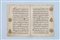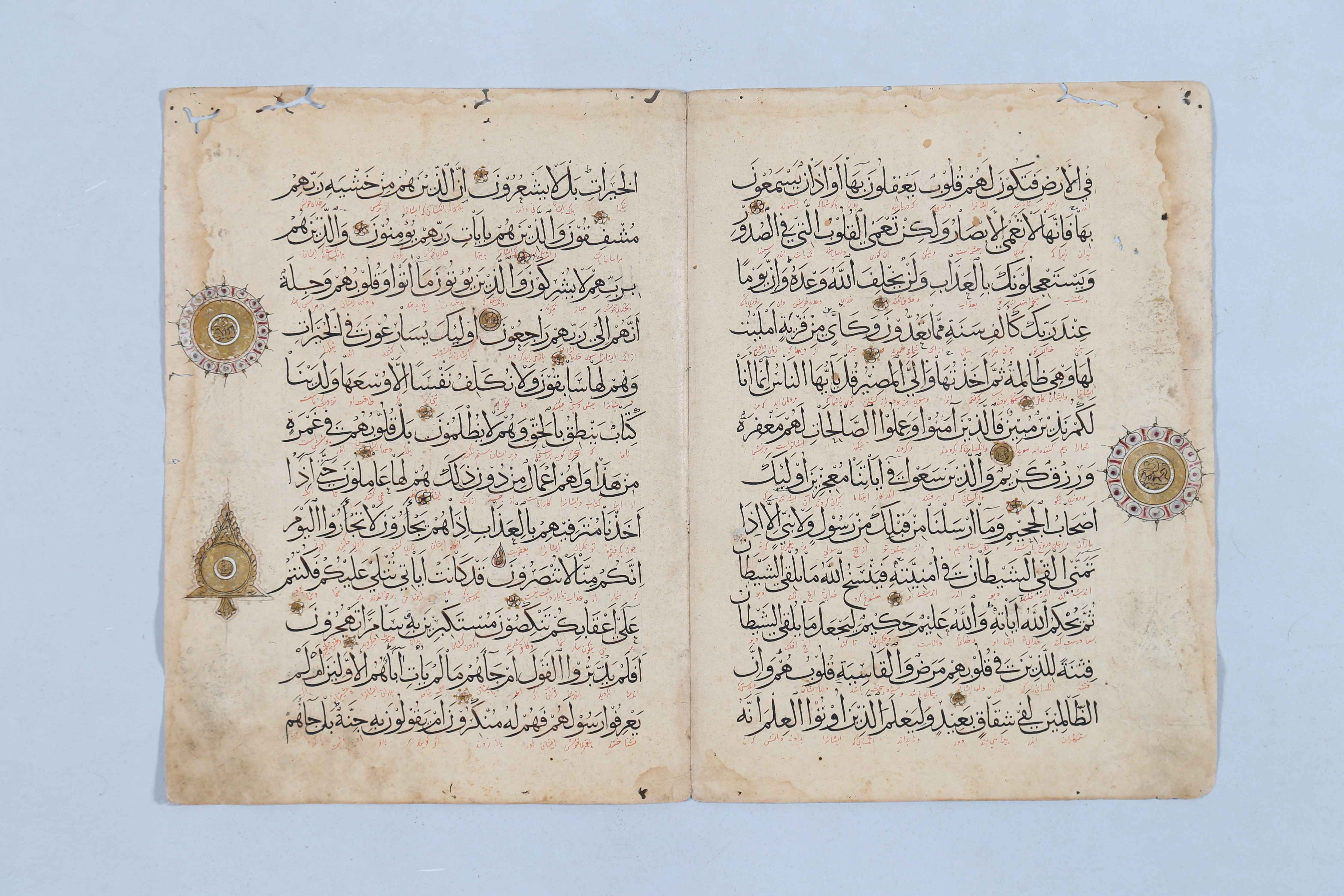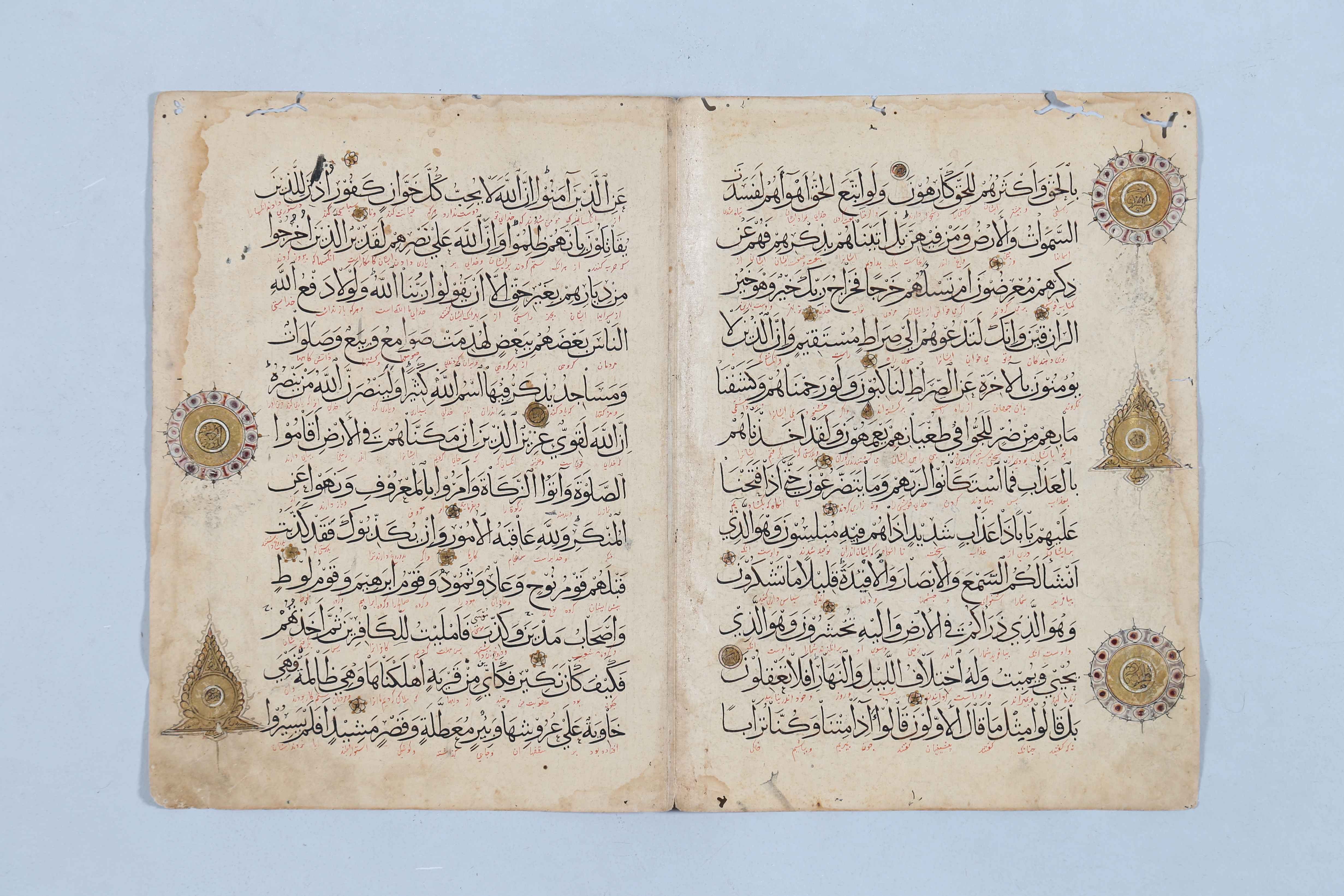 Iran, dinastia Timuride, XIV secolo. -. Cm 32,50 x 24,00. Due fogli e quattro facciate, ognuna contenente 12 versi scritti con inchiostro scuro in stile naskh e traduzione persiana in rosso. Marcatori in forma di rosette dorate e marcatori di sezione in forma di medaglioni circolari dorati e policromi e motivo piramidale dorato bordato con inchiostro scuro.